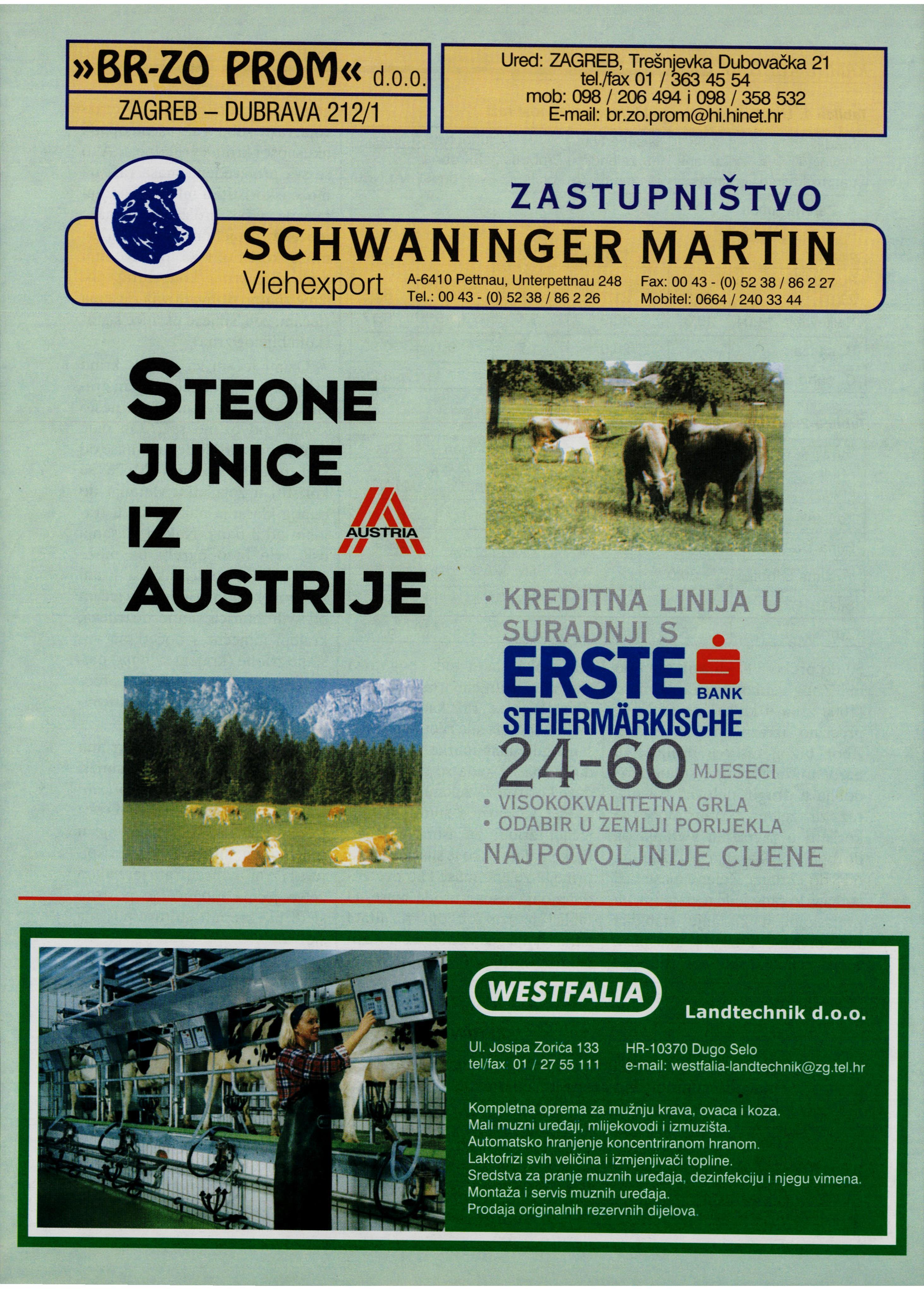 Ured: ZAGREB,TrešnjevkaDubovačka 21 tel./fax 01 /363 45 54 mob: 098 /206 494 i 098 /358 532 Email: br.zo.promehi.hinet.hr »BR-ZO PROM« 4.0.0. ZAGREB DUBRAVA 212/1 ZASTUPNIŠTVO SCHWANINGER MARTIN A-6410 Pettnau, Unterpettnau 248 Fax: 0043 -(0)5238/86 227 Viehexport Tel : 00 43 - (0) 52 38 / 86 2 26 Mobitel: 0664 / 240 33 44 STEONE JUNICE IZ ZEN AUSTRIJE ERSTE ES STEIERMARKISCHE 24-60 ši Landtechnik d.o.o. A UI Josipa Zorića 133 HR-10370 Dugo Selo tel/fax 01/2755111 e-mail: westfalialandtechnik(Xzg.tel.hr Kompletna oprema za mužnju krava, ovaca i koza Mali muzni uređaji,mlijekovodi i izmuzišta Automatsko hranjenje koncentriranom hranom Laktofrizi svih veličina i izmjenjivačitopline Sredstva za pranje muznih uređaja, dezinfekciju i njegu vimena Montaža i servis muznih uređaja Prodaja originalnih rezervnih dijelova