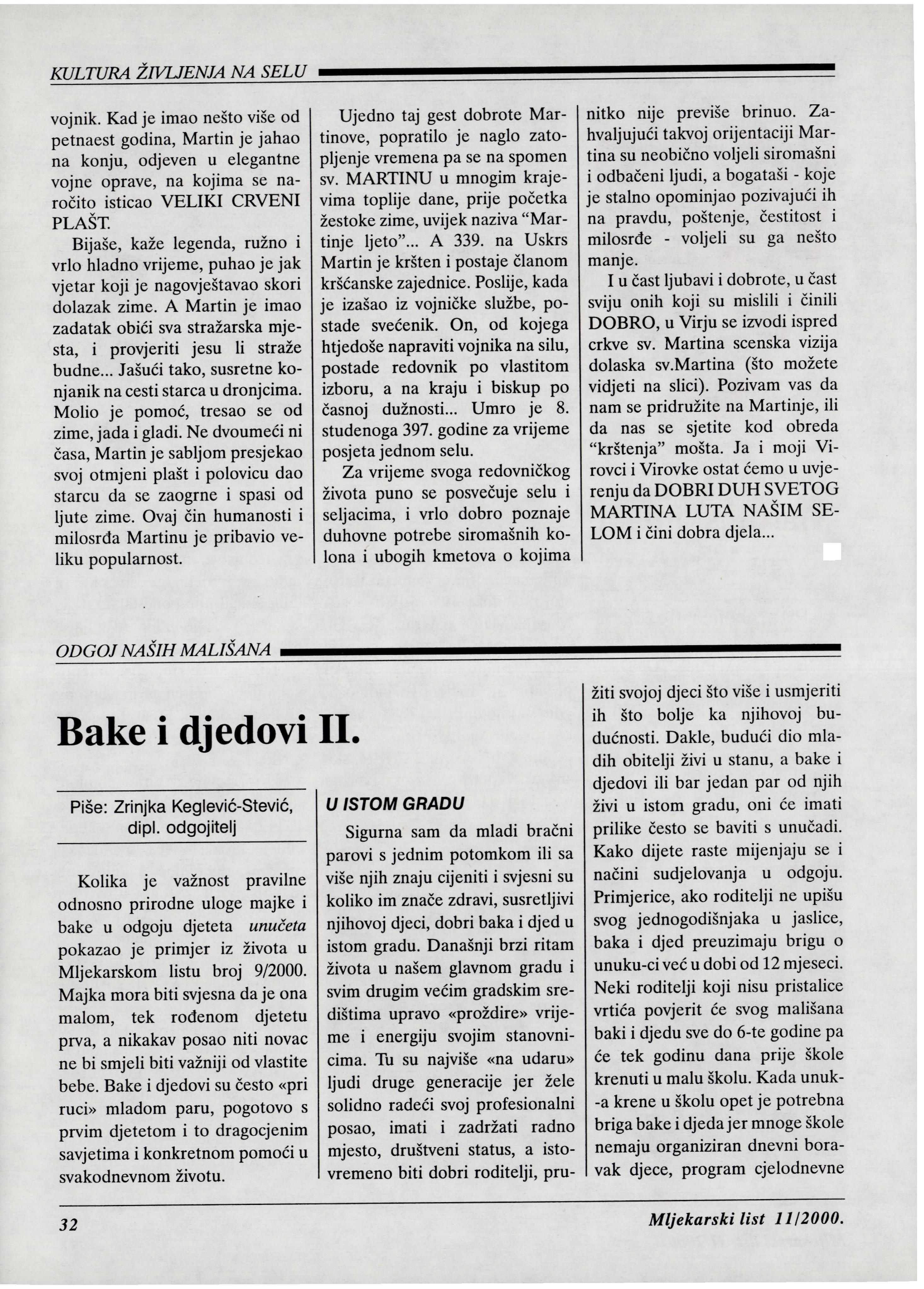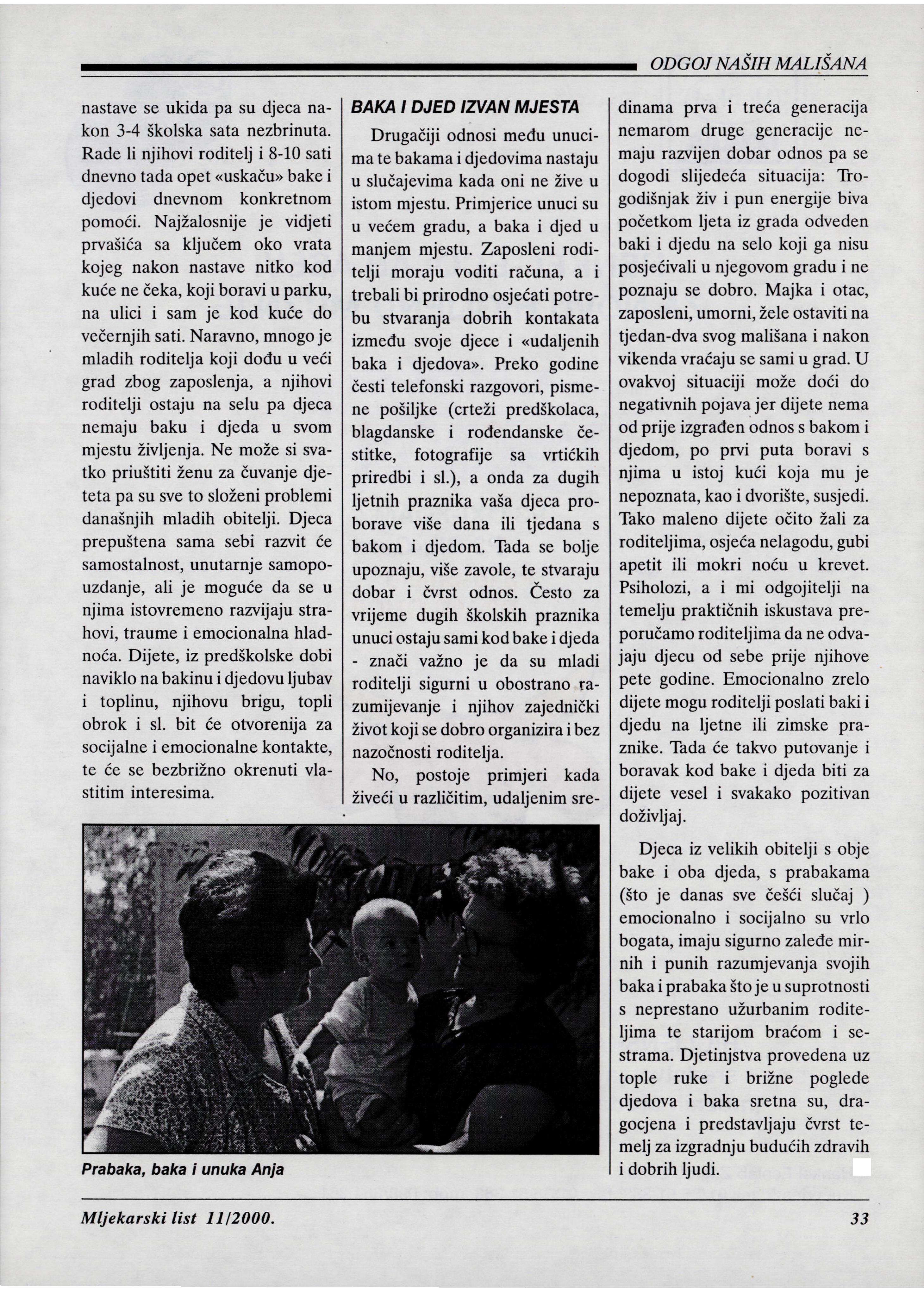 Kolika je važnost pravilne odnosno prirodneulogemajkei bake u odgojudjetetaunučeta pokazaoje primjer iz života u Mljekarskomlistu broj9/2000. Majkamora biti svjesna da jeona malom, tek rođenom djetetu prva, a nikakav posao niti novac ne bi smjelibiti važniji od vlastite bebe Bake i djedovi su često «pri ruci» mladom paru, pogotovo s prvimdjetetom i to dragocjenim savjetima i konkretnom pomoći u svakodnevnom životu.