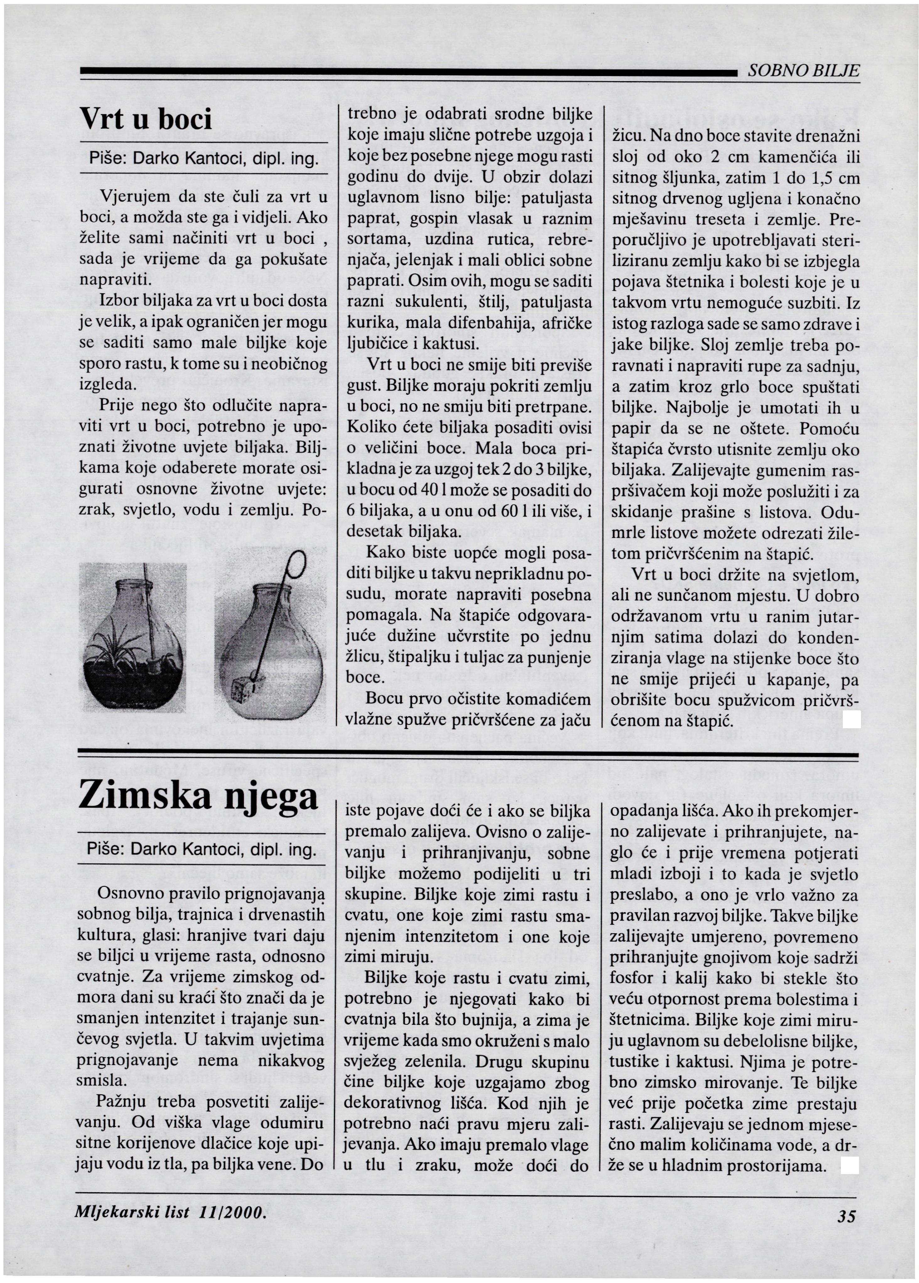 žicu Na dno boce stavite drenažni sloj od oko 2 cm kamenčića ili sitnogšljunka, zatim 1 do 1,5 cm sitnogdrvenogugljena i konačno mješavinutreseta i zemlje.Preporučljivojeupotrebljavati steriliziranu zemljukako bi se izbjegla pojavaštetnika i bolesti kojejeu takvom vrtu nemogućesuzbiti Iz istograzloga sade se samo zdrave i jakebiljke.Slojzemljetreba poravnati i napraviti rupe za sadnju, a zatim kroz grloboce spuštati biljke.Najbolje je umotati ih u papirda se ne oštete Pomoću štapićačvrsto utisnite zemljuoko biljaka.Zalijevajtegumenimraspršivačemkojimože poslužiti i za skidanjeprašine s listova Odumrle listove možete odrezati žiletom pričvršćenim na štapić. Vrt u boci držite na svjetlom, ali ne sunčanom mjestu. U dobro održavanom vrtu u ranim jutarnjimsatima dolazi do kondenziranjavlage na stijenke boce što ne smijeprijeći u kapanje, pa obrišite bocu spužvicompričvršćenom na štapić.
