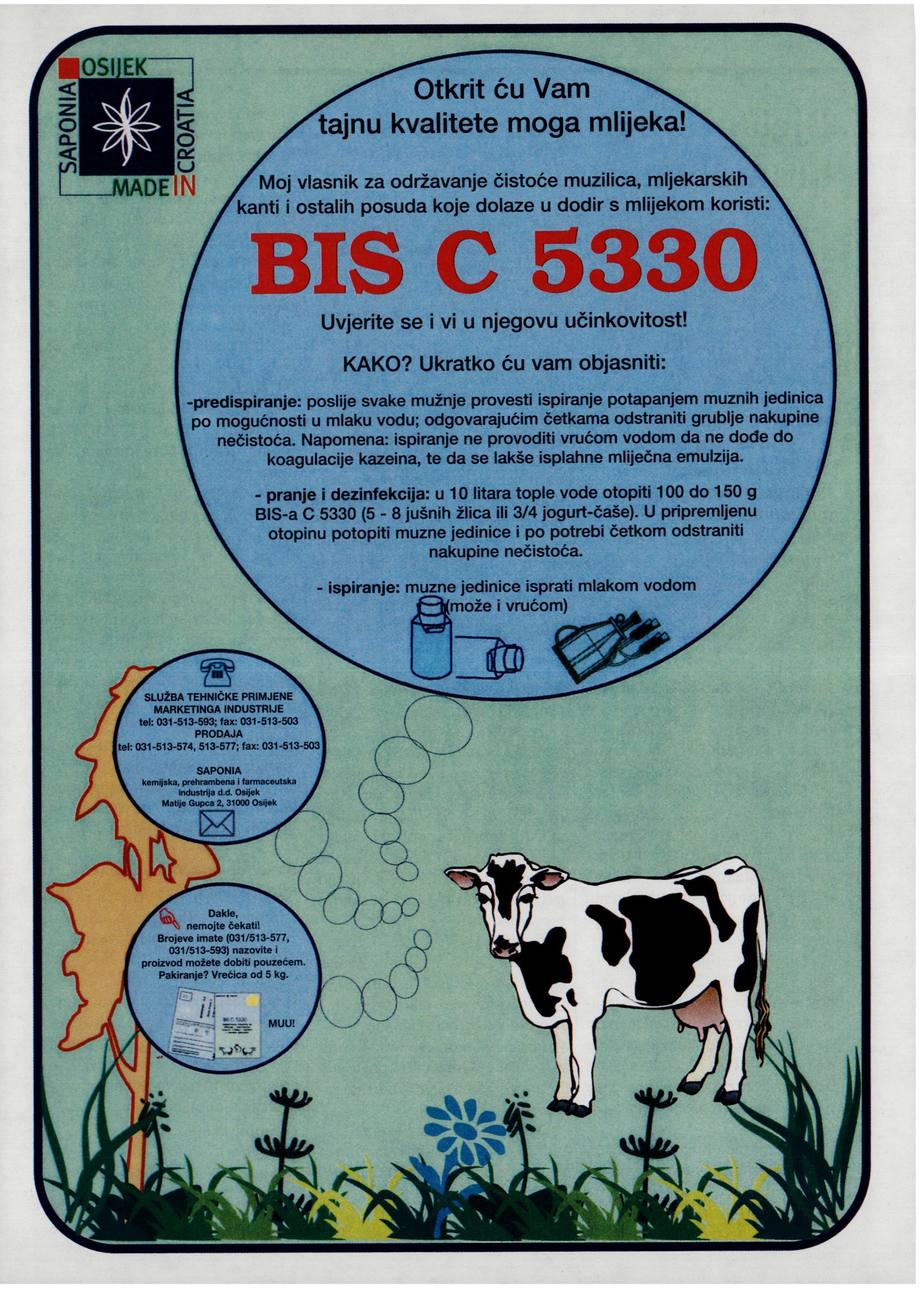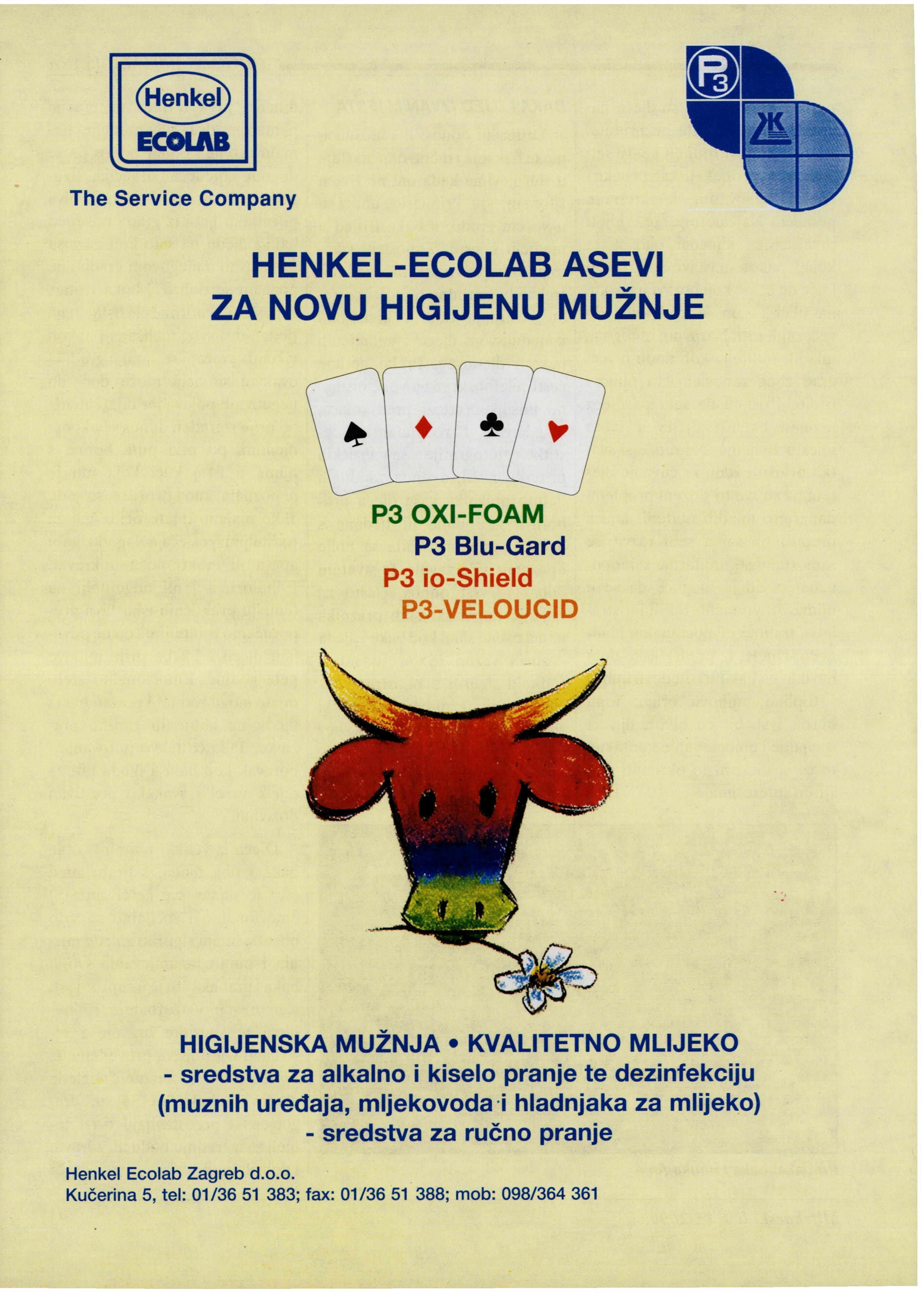 HIGIJENSKA MUŽNJA * KVALITETNO MLIJEKO - sredstva za alkalno i kiselo pranje te dezinfekciju (muznih uređaja, mljekovoda i hladnjaka za mlijeko) - sredstva za ručno pranje Henkel Ecolab Zagreb d o o Kučerina 5,tel: 01/36 51 383;fax: 01/36 51 388;mob: 098/364 361