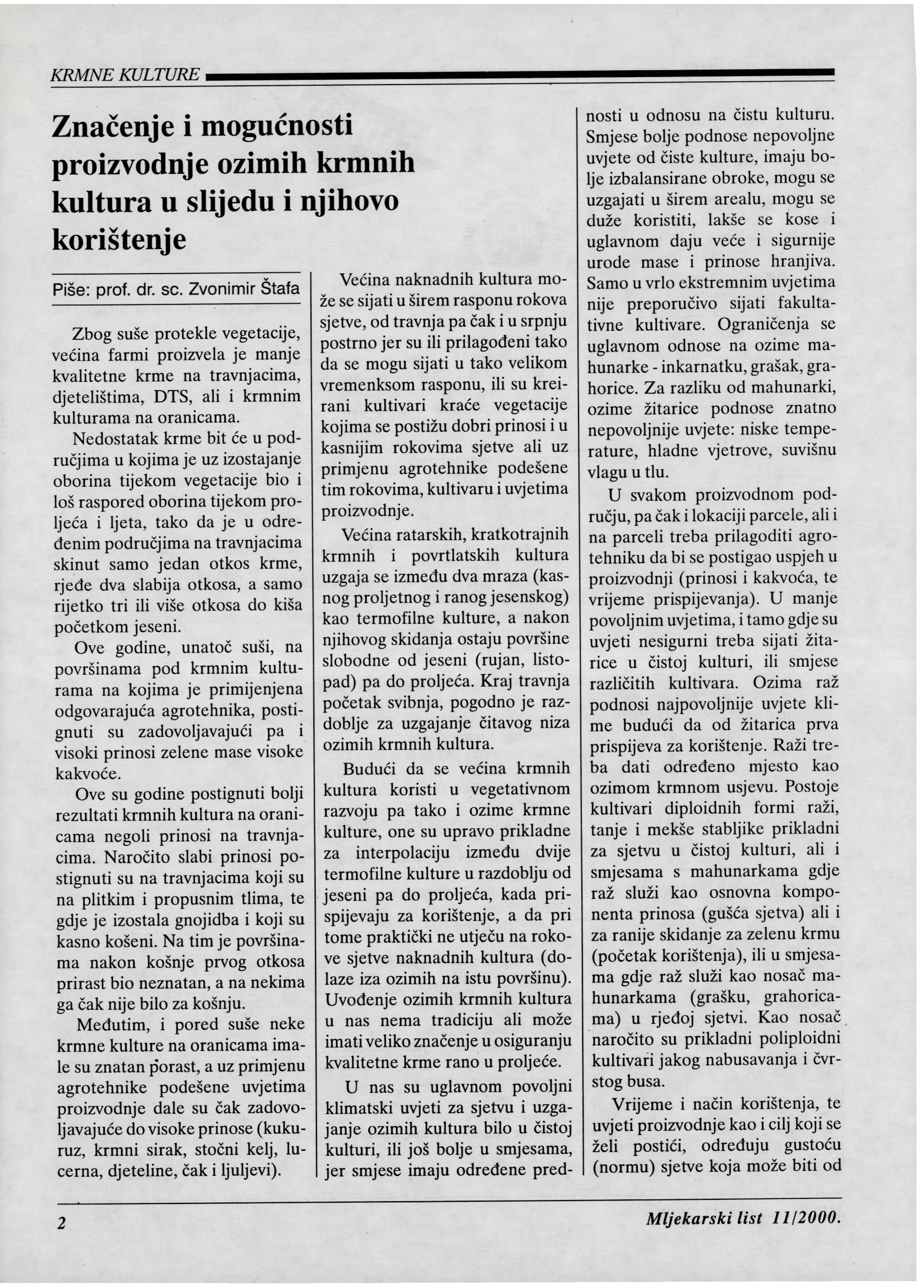nosti u odnosu na čistu kulturu Smjeseboljepodnosenepovoljne uvjete od čiste kulture,imajuboljeizbalansirane obroke,mogu se uzgajati u širem arealu, mogu se duže koristiti, lakše se kose i uglavnomdajuveće i sigurnije urode mase i prinosehranjiva. Samo u vrlo ekstremnim uvjetima nijepreporučivosijatifakultativne kultivare Ograničenja se uglavnomodnose na ozime mahunarke - inkarnatku,grašak, grahorice Za razliku od mahunarki, ozime žitarice podnoseznatno nepovoljnijeuvjete:niske temperature, hladne vjetrove,suvišnu vlagu u tlu U svakom proizvodnompodručju, pa čak i lokacijiparcele, ali i na parcelitreba prilagoditi agrotehniku da bi se postigaouspjeh u proizvodnji(prinosi i kakvoća, te vrijemeprispijevanja). U manje povoljnimuvjetima, i tamo gdje su uvjetinesigurnitreba sijatižitarice u čistojkulturi, ili smjese različitih kultivara Ozima raž podnosinajpovoljnijeuvjeteklime budući da od žitarica prva prispijeva za korištenje. Raži treba dati određeno mjestokao ozimom krmnom usjevu.Postoje kultivari diploidnihformi raži, tanje i mekše stabljikeprikladni za sjetvu u čistojkulturi, ali i smjesama s mahunarkama gdje raž služi kao osnovna komponenta prinosa(gušćasjetva) ali i za ranijeskidanje za zelenu krmu (početakkorištenja), ili u smjesama gdjeraž služi kao nosač mahunarkama (grašku,grahoricama) u rjeđojsjetvi. Kao nosač naročito su prikladnipoliploidni kultivari jakognabusavanja i čvrstog busa.
