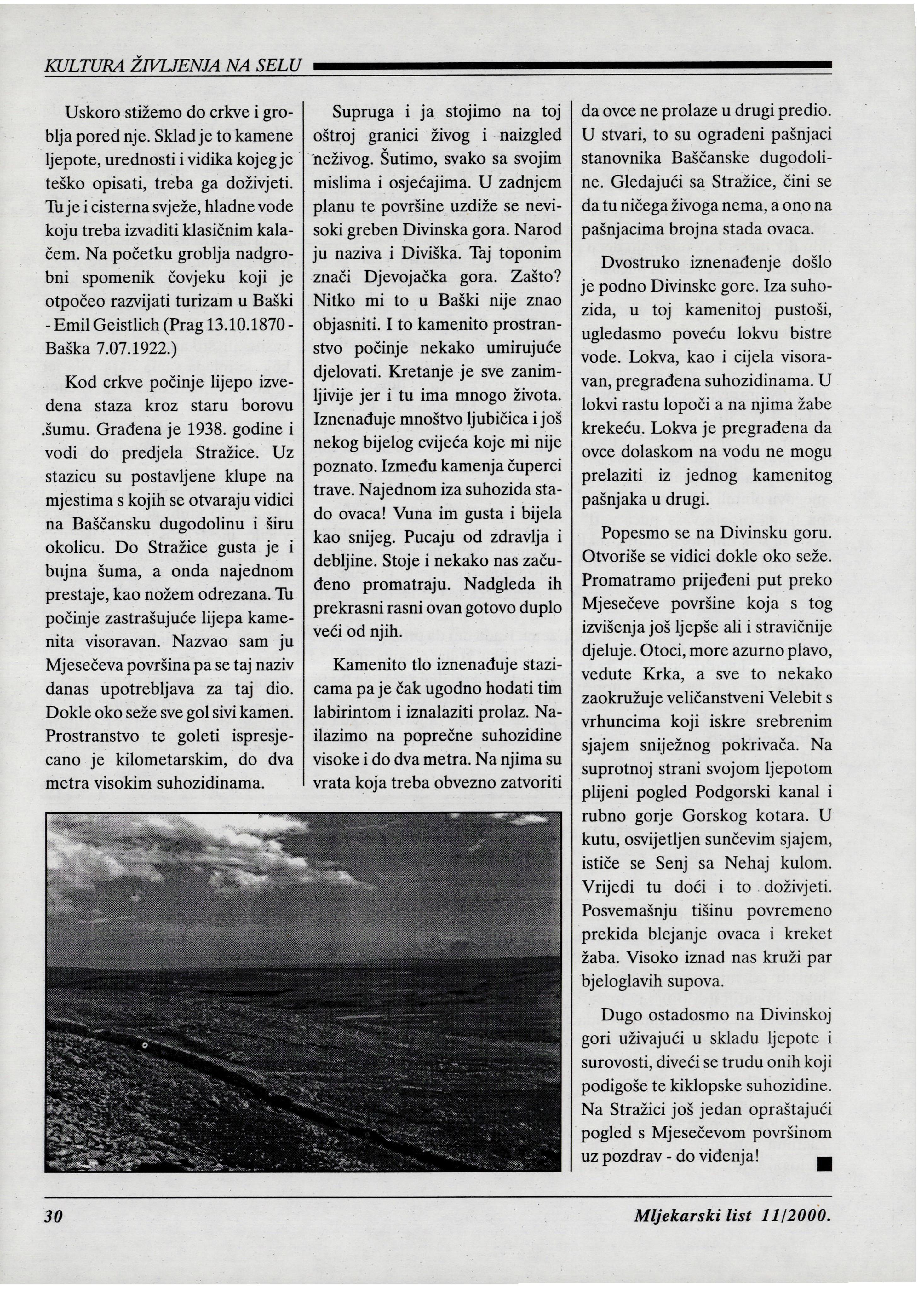 Supruga i ja stojimo na toj oštrojgraniciživog i naizgled neživog.Šutimo,svako sa svojim mislima i osjećajima. U zadnjem planu te površineuzdiže se nevisoki grebenDivinska gora Narod junaziva i Diviška Tajtoponim znači Djevojačkagora Zašto? Nitko mi to u Baški nijeznao objasniti. I to kamenito prostranstvo počinjenekako umirujuće djelovati.Kretanje jesve zanimljivije jer i tu ima mnogo života Iznenađujemnoštvo ljubičica i još nekogbijelogcvijećakojemi nije poznato.Između kamenjačuperci trave Najednomiza suhozida stado ovaca! Vuna im gusta i bijela kao snijeg.Pucajuod zdravlja i debljine.Stoje i nekako nas začuđeno promatraju.Nadgledaih prekrasni rasni ovan gotovoduplo veći od njih.