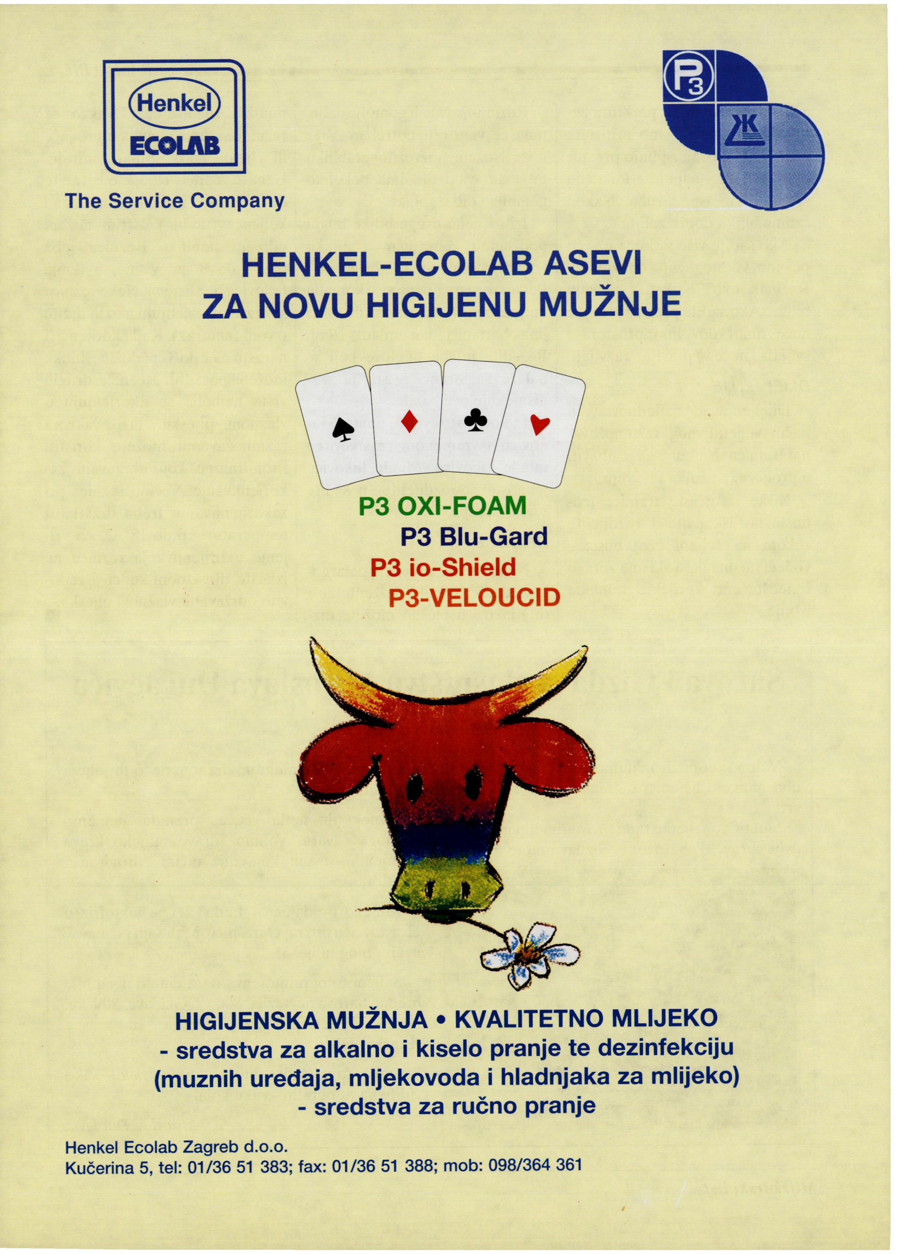Gih a The Service Company HENKEL-ECOLAB ASEVI ZA NOVU HIGIJENU MUŽNJE ar l/+] \ Ma aje. «| P3 OXI-FOAM | P3 Blu-Gard P3 io-Shield P3-VELOUCID HIGIJENSKA MUŽNJA +* KVALITETNO MLIJEKO - sredstva za alkalno i kiselo pranje te dezinfekciju (muznih uređaja, mljekovoda i hladnjaka za mlijeko) - sredstva za ručno pranje Henkel Ecolab Zagreb d o o Kučerina 5,tel: 01/36 51 383;fax: 01/36 51 388;mob: 098/364 361