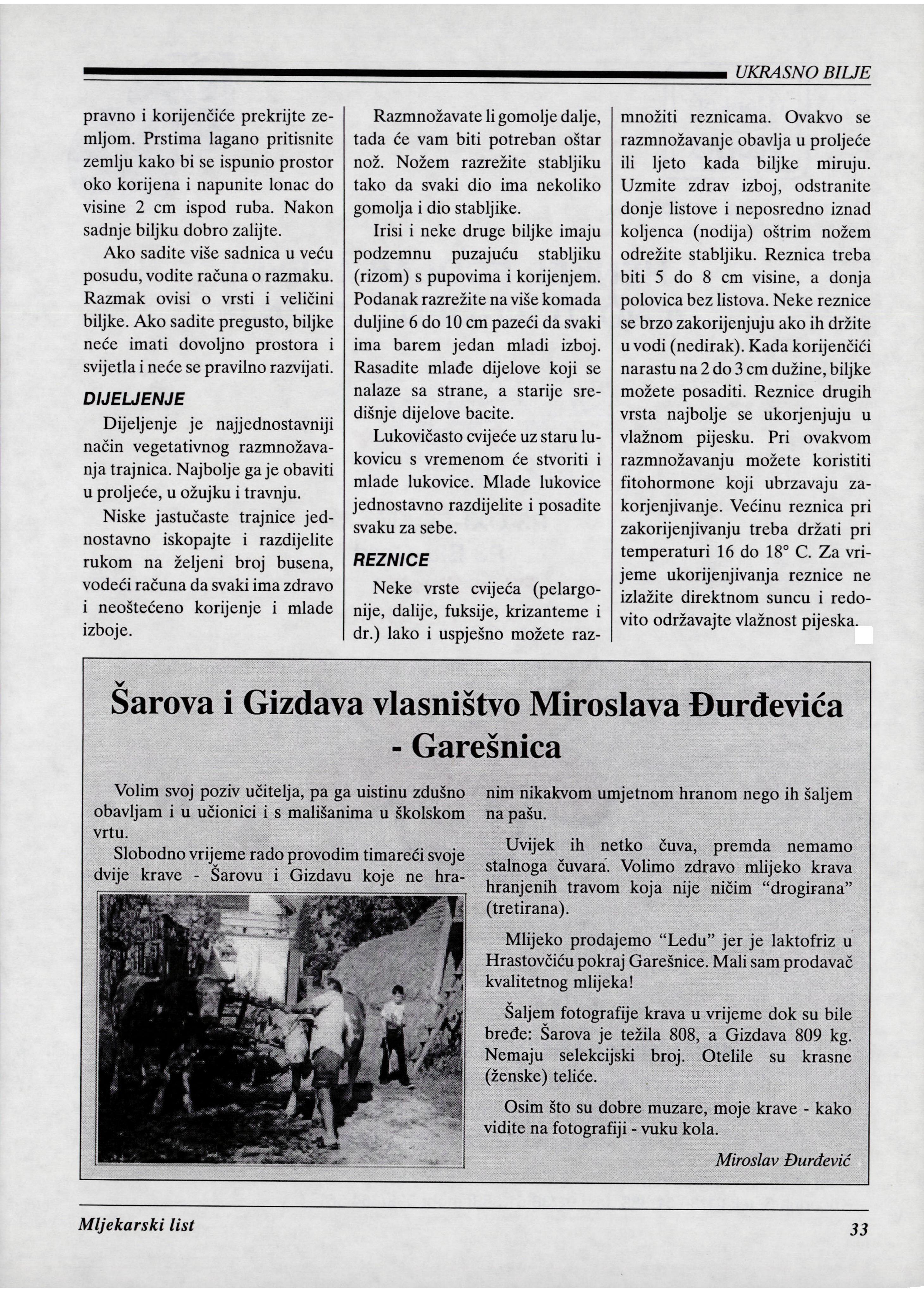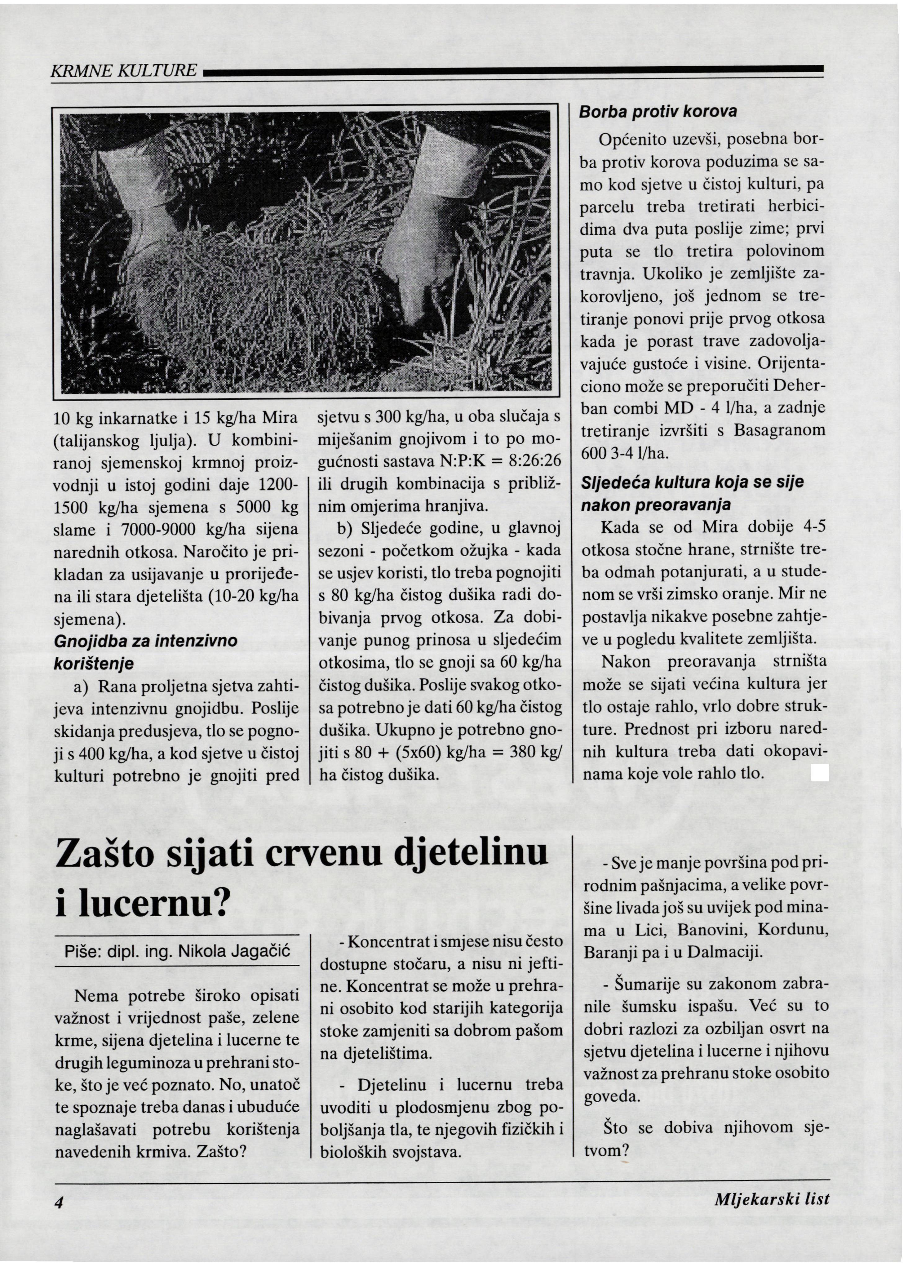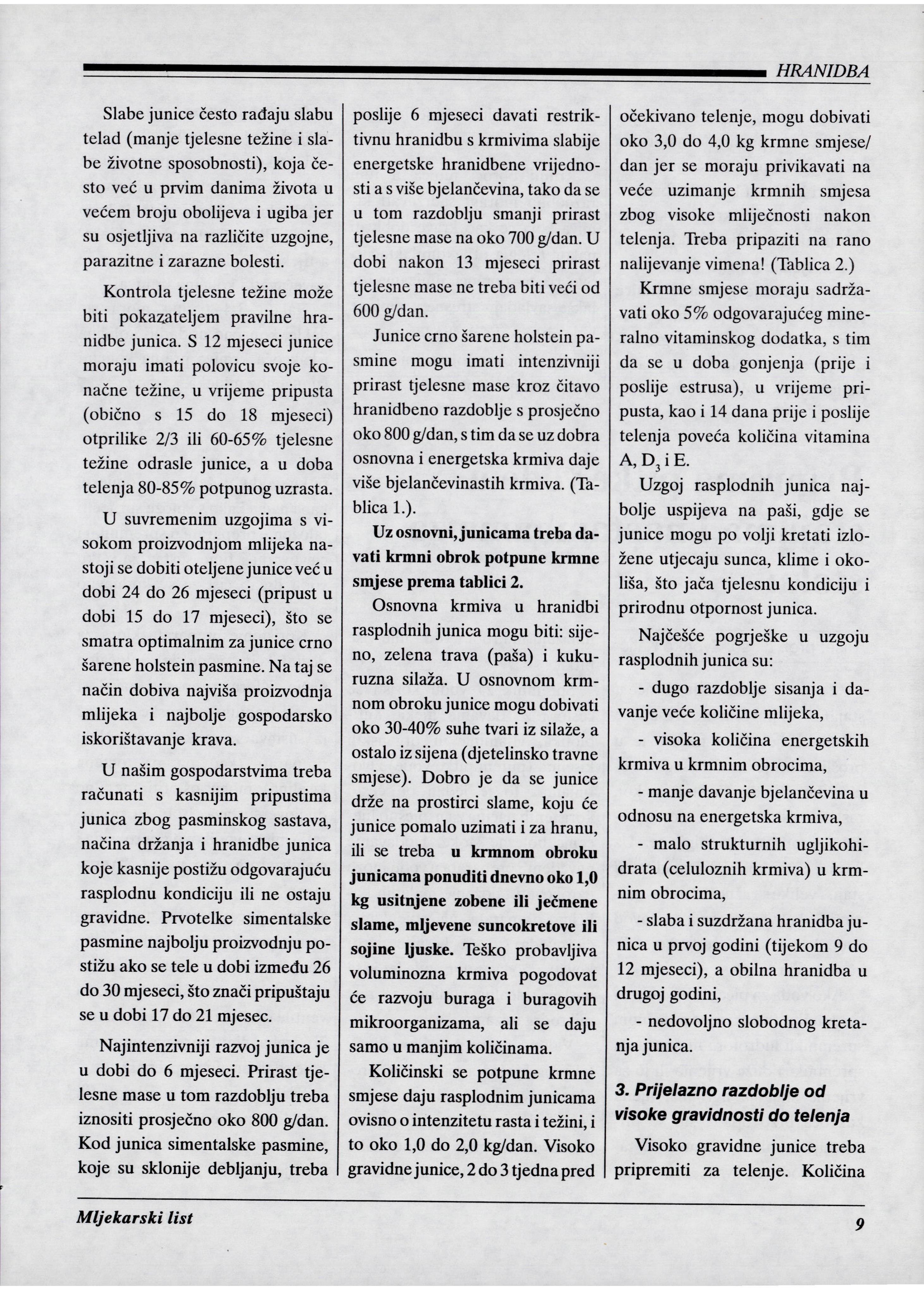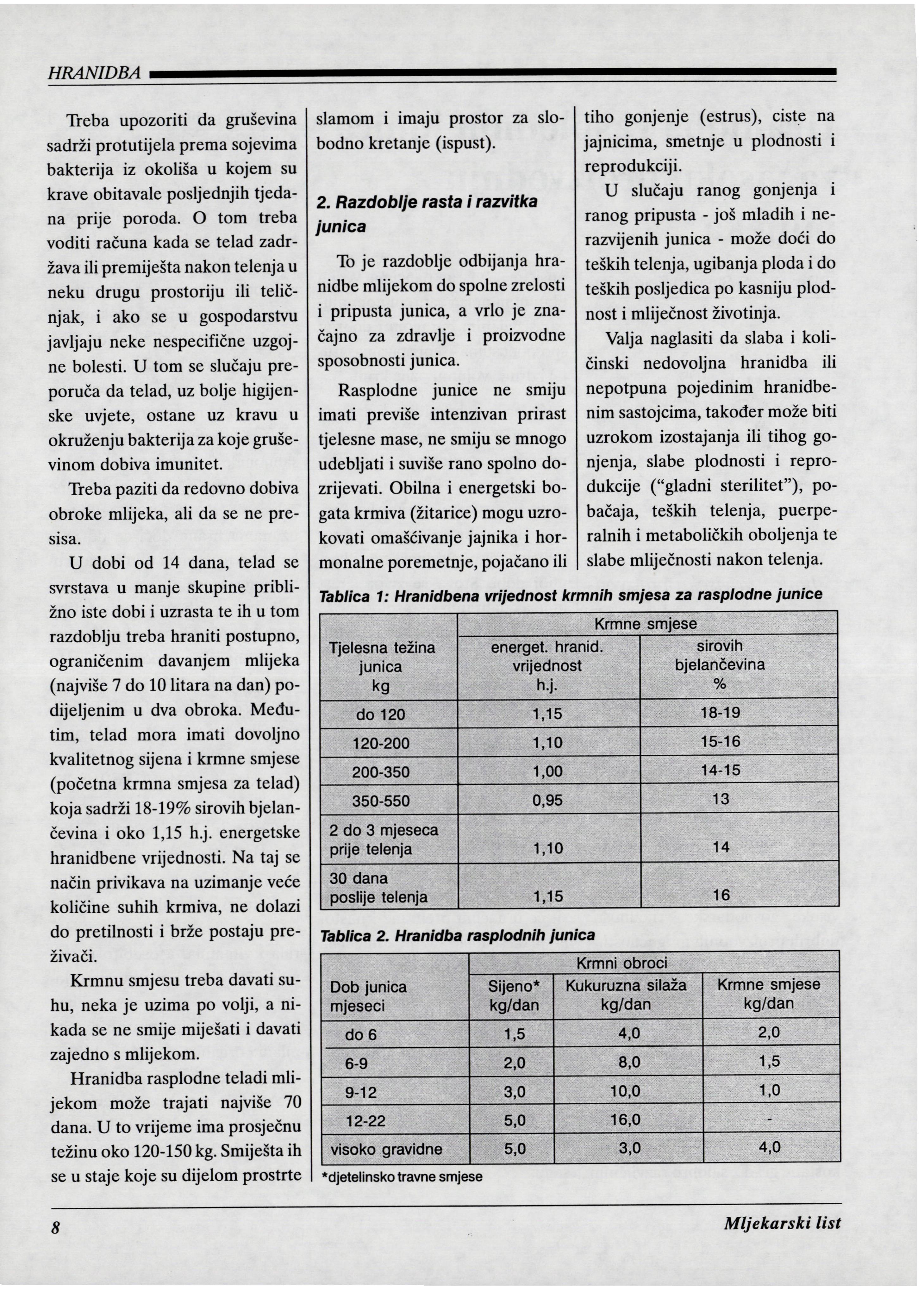 Tablica 1: Hranidbena vrijednost krmnih smjesa za rasplodnejunice Krmne smjese Tjelesnatežina energet hranid sirovih junica vrijednost bjelančevina kg hi. % do 120 1,15 18-19 120-200 1,10 15-16 200-350 1,00 14-15 350-550 0,95 13 2 do 3 mjeseca prijetelenja 1,10 14 30 dana poslijetelenja 1,15 16 Tablica 2 Hranidba rasplodnihjunica Krmni obroci Dob junica Sijeno* | Kukuruzna silaža | Krmne smjese mjeseci kg/dan kg/dan kg/dan do 6 1,5 4,0 2,0 6-9 2,0 8,0 15 9-12 3,0 10,0 1,0 12-22 5,0 16,0 visoko gravidne 5,0 3,0 4,0 *djetelinskotravne smjese Mljekarski list