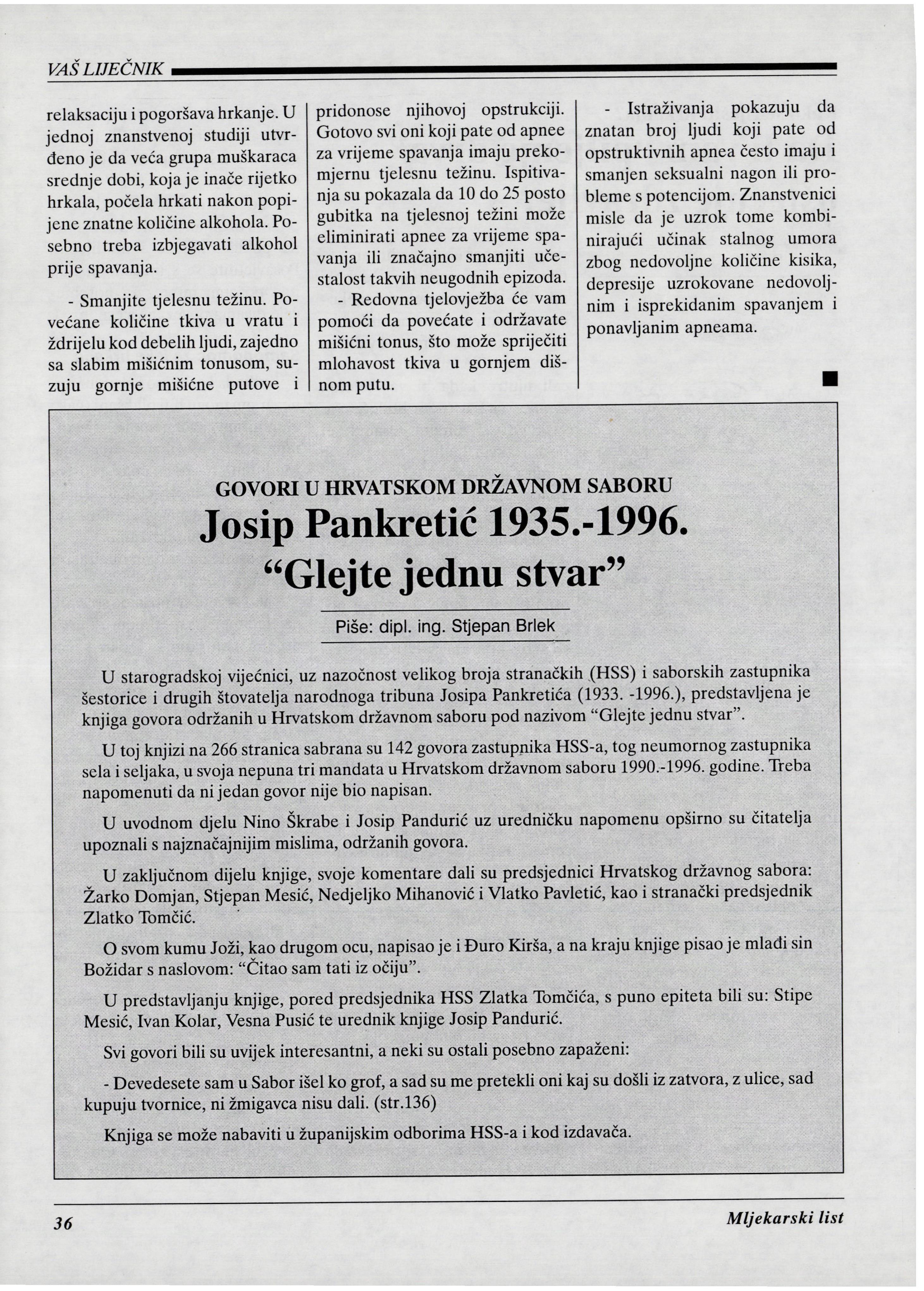 U starogradskojvijećnici, uz nazočnost velikogbrojastranačkih (HSS)i saborskih zastupnika šestorice i drugihštovateljanarodnogatribuna JosipaPankretića (1933.-1996.),predstavljena je knjigagovora održanih u Hrvatskom državnom saboru podnazivom “Glejtejednustvar"