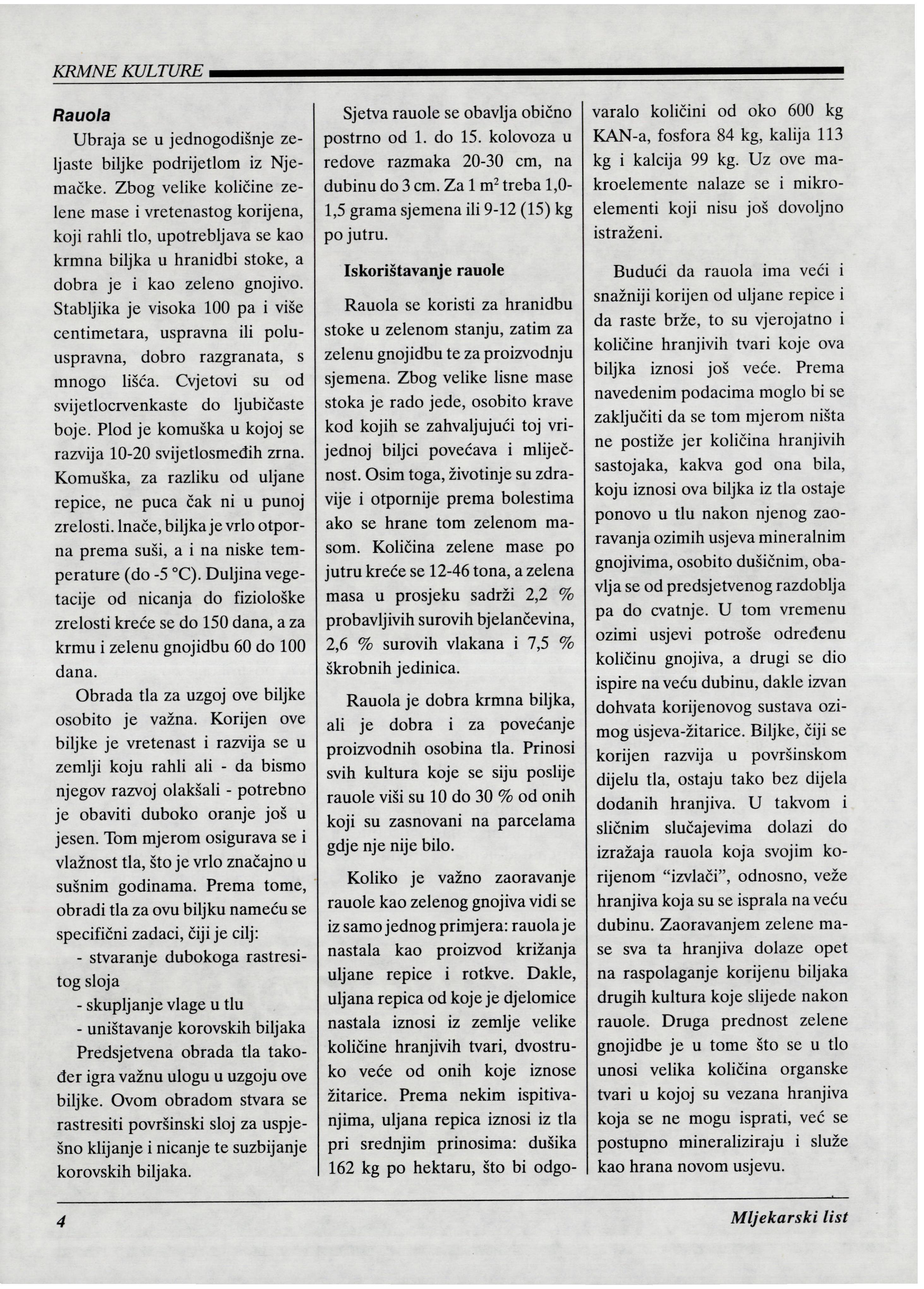 Koliko je važno zaoravanje rauole kao zelenoggnojiva vidi se izsamo jednogprimjera:rauola je nastala kao proizvodkrižanja uljanerepice i rotkve Dakle, uljanarepica od kojejedjelomice nastala iznosi iz zemljevelike količine hranjivihtvari,dvostruko veće od onih kojeiznose žitarice Prema nekim ispitivanjima,uljanarepicaiznosi iz tla prisrednjimprinosima:dušika 162 kg po hektaru, što bi odgo-