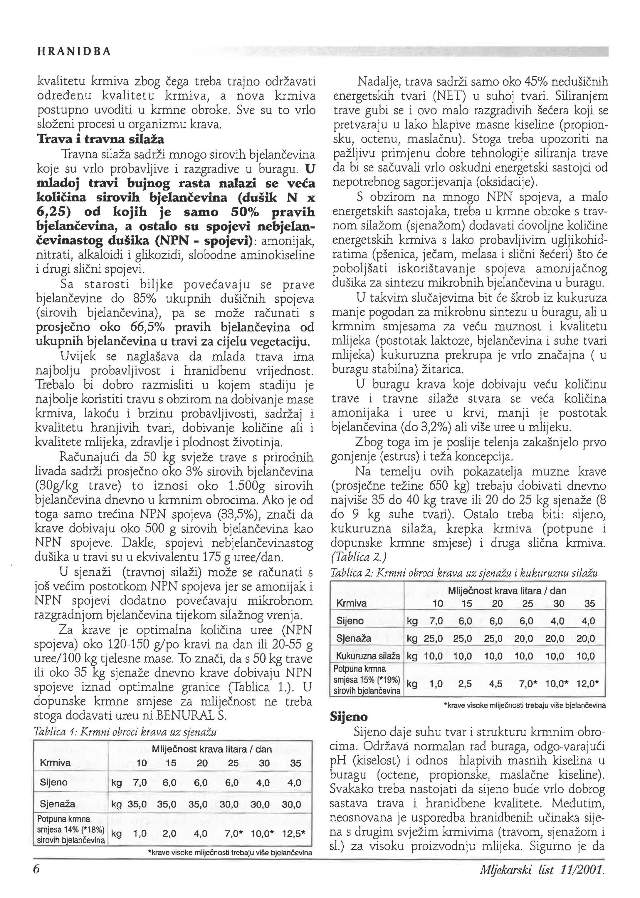 Na temelju ovih pokazatelja muzne krave težine 650 kg) trebaju dobivati dnevno najviše 35 do 40 kg trave ili 20 do 25 kg sjenaže (8 do 9 kg suhe tvari). Ostalo treba biti: sijeno, kukuruzna silaža, krepka krmiva (potpune i dopunske krmne smjese) i druga krmiva. (Tablica2.)