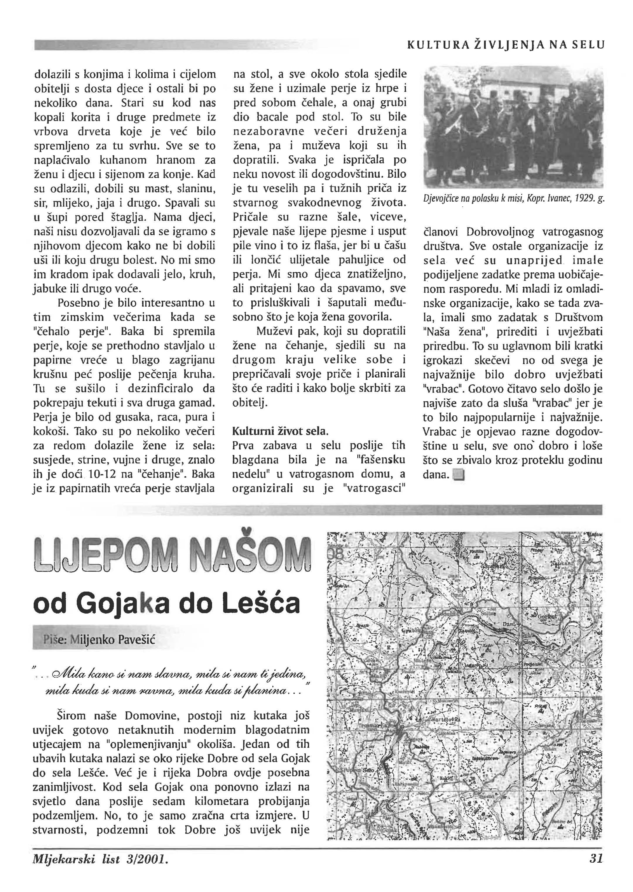 na stol, a sve okolo stola sjedile su žene i uzimale perje iz hrpe i pred sobom a onaj grubi dio bacale pod stol. To su bile nezaboravne druženja žena, pa i muževa koji su ih dopratili. Svaka je po neku novost ili dogodovštinu. Bilo je tu veselih pa i tužnih pnca ,z stvarnog svakodnevnog života. su razne šale, viceve, pjevale naše lijepe pjesme i usput pile vino i to iz flaša, jer bi u ili ulijetale pahuljice od perja. Mi smo djeca znatiželjno, ali pritajeni kao da spavamo, sve to prisluškivali i šaputali sobno što je koja žena govorila. Muževi pak, koji su dopratili žene na sjedili su na drugom kraju velike sobe i svoje i planirali što raditi i kako bolje skrbiti za obitelj.