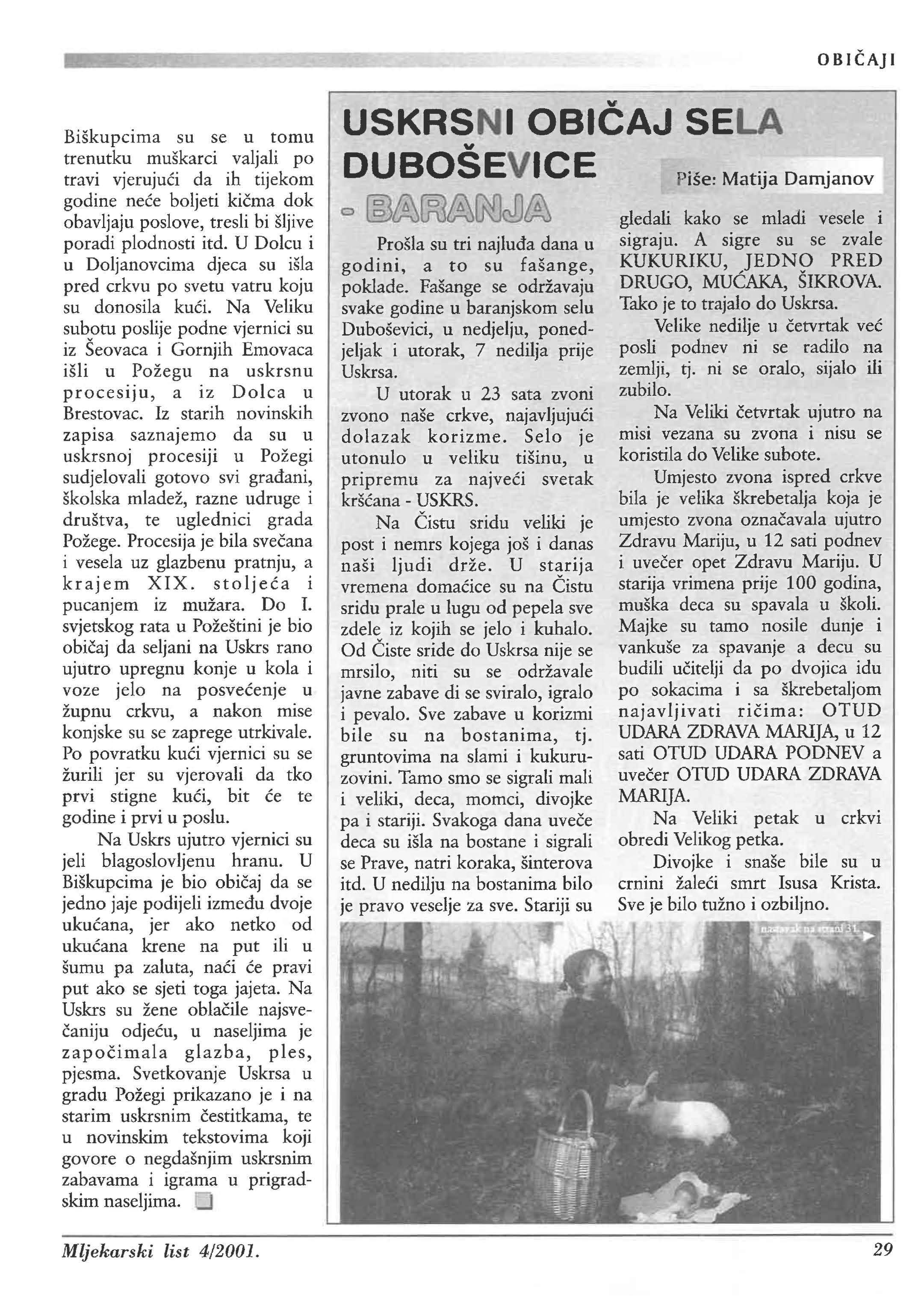 Na Uskrs rano <lecase budu i kupu svoje darove što im je donio zec u gnjizda. Pravo veselje. sprema jelo tj. šunku, jaja, kobasice, bila luka i rena, sve u košaricu i nosi na jutarnju misu. To jelo posveti za vrime mise. Poslije mise, kada doma, svi se skupa oko stolice izmoljimo Zdravo Mariju i jedemo jelo. Posli svi se užurbano sprimu za podnevnu misu. Crkva je prepuna i danas. Sva lica vesela pevu uskrsne pesme. Posli užine mladež se sprima na tako željenu zabavu koju nisu imalu 7 nedilja. Igralo se i pevalo 3 dana do zore uz pratnju tamburica a u starija vrimena uz gajde, diplice ili samicu. U Duboševici žive starosedeoci Hrvati ŠOKCI 1 doseljenici iz Bosne. Mljekarski list 4/2001.