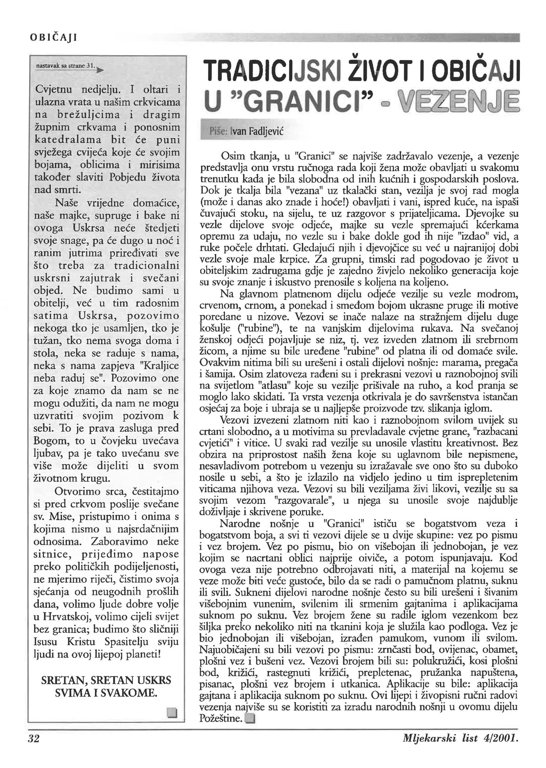 V • ~jera u us~slog Spasitelja koji je pobijedio smrt potrebna je covjecanstvu koJeg svakodnevno na nekom dijelu naše planete ~azdiru brojni sukobi: pojedinih naroda, unutar istog ~aroda_~a i vjernika u jednog, istog, osobnog Boga. Ima P?dv?Jenost1 1 podcjenjivanja i u nas koji ~jer~jemo ll;skrslog.S~asitelja. I mi n~ živimo svi u uvažavanju Jedm drugih 1 ne osjecamo radost u suživotu i raznolikostima. je naša bolna rana. Nikako da shvatimo kako snošljivost prema onima koji nisu kao mi donosi smirenje najprije nama samima a onda i svima oko nas. Ovim bolnim pa i krvavim problemima posvetili su naši oci biskupi i nadbiskupi, a posebno Sv. Otac Ivan Pavao II., mnogo utješnih i poticajnih misli te duhovnih preporuka tijekom netom prošle Korizme. Mijenjati svijet na bolje valja od sebe samoga, pa je nadbiskup preuz. g. Josip završio svoju Korizmenu poslanicu ovim "Svatko od nas, uz Božji blagoslov, neka poduzme napore za produbljivanjem svojega vjerskog i moralnog života iskrenom ~olitvo~, prikla?nim odricanjem kao vježbanjem u i liu~skoJ slobodi, a pogotovo djelima ljubavi i solidarnosti sa siromašnima i slabima i sa svima koji trpe i pate. od sebe, od malih i blizih zajednica, ne za šire potrebe Crkve, domovine i svijeta. Neka nam Gospodin udijeli svima svjetla i ulije snagu Duha kako bismo, osobnim i napetostima i dvojbama doživjeli radost 1 novost Uskrsa sada vremenitog i onoga u nebesima." ~akon što usvojimo duhovne vrijednosti Uskrsa, tj. unutarnju nadu 1 radost duše, dat tome oduška lijepim našim hrvatskim narodnim uskrsnim vremena, snage pa i nešto novca da s djecom i starcima u obitelji ukrašavamo pisanice simbol života. Pravit kokice, sve št~ preds_tavlja i uskrslu prirodu nakon zimskog mirovanja. Ov~ ~e godme poranila pa smo s puno i zelenila slavili dolazak Isusov u Jeruzalem i nosili ga u procesijama na nastavak na strani 32.