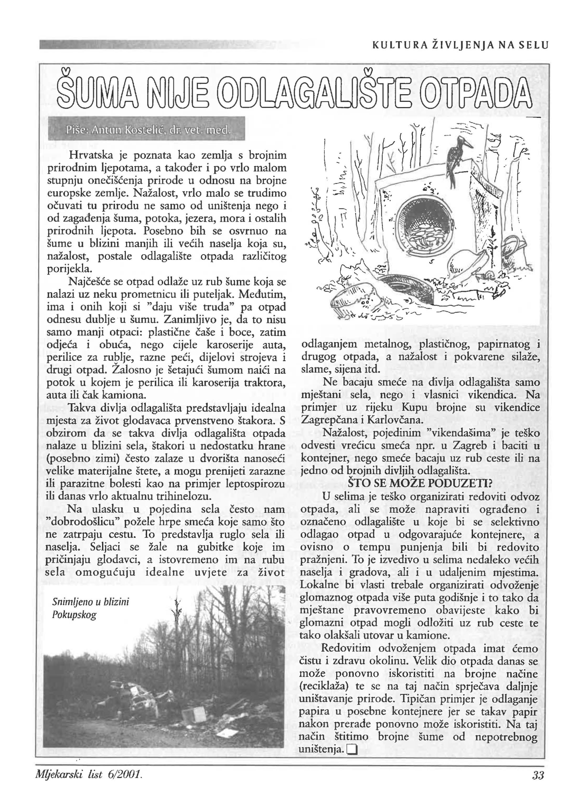 Hrvatska je poznata kao zemlja s brojnim prirodnim ljepotama, a i po vrlo malom stupnju prirode u odnosu na brojne europske zemlje. Nažalost, vrlo malo se trudimo tu prirodu ne samo od uništenja nego i od šuma, potoka, jezera, mora i ostalih prirodnih ljepota. Posebno bih se osvrnuo na šume u blizini manjih ili naselja koja su, nažalost, postale odlagalište otpada porijekla.