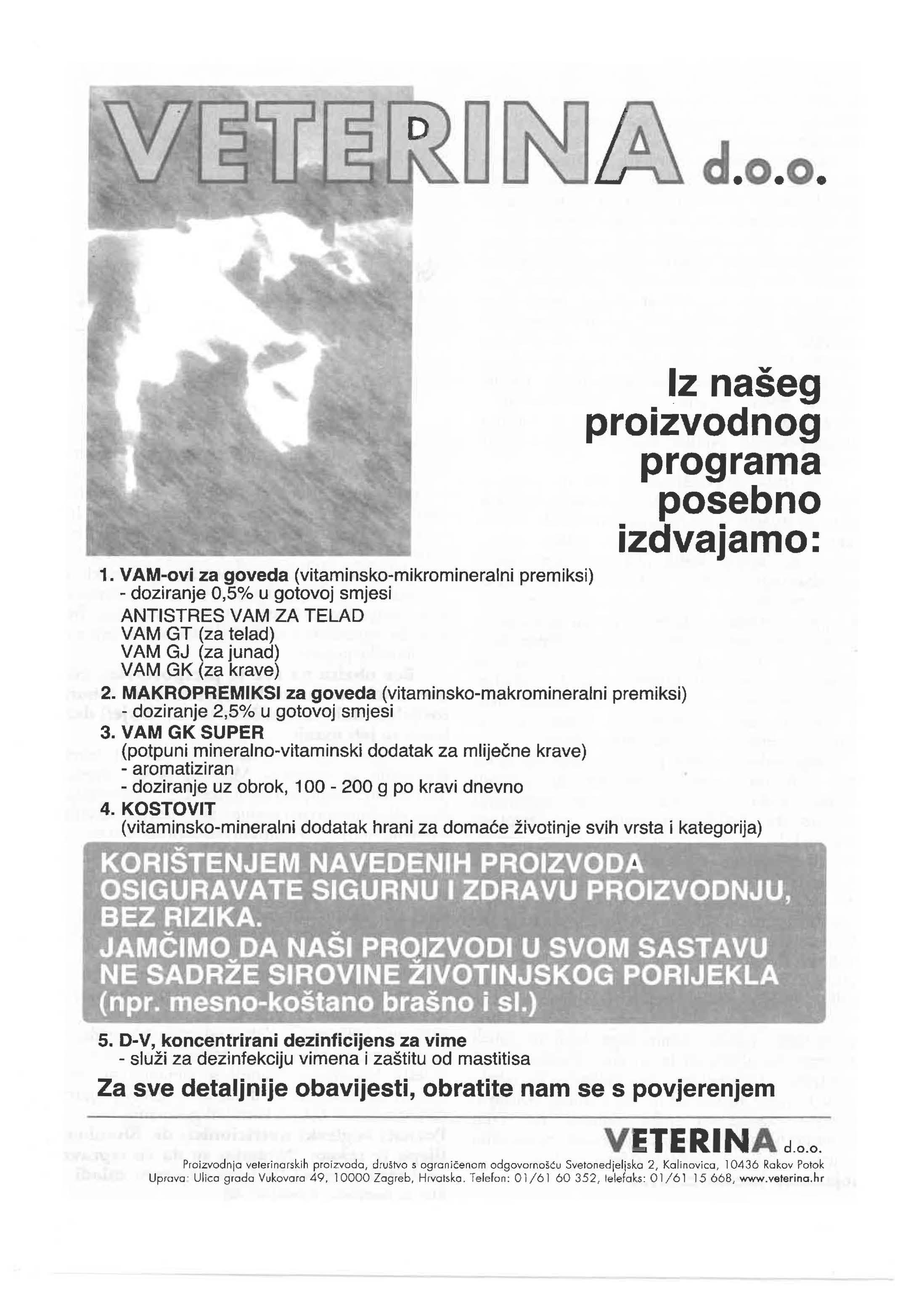 Proizvodnja veterinarskih proizvoda, društvo s Svetonedjeljska 2, Kalinovica, l 0436 Rakov Potok Uprava· Ulica grada Vukovara 49, 10000 Zagreb, Hrvatska. Telefon: 01/61 60 352, telefaks: 01/61 15 668, www.veterina.hr