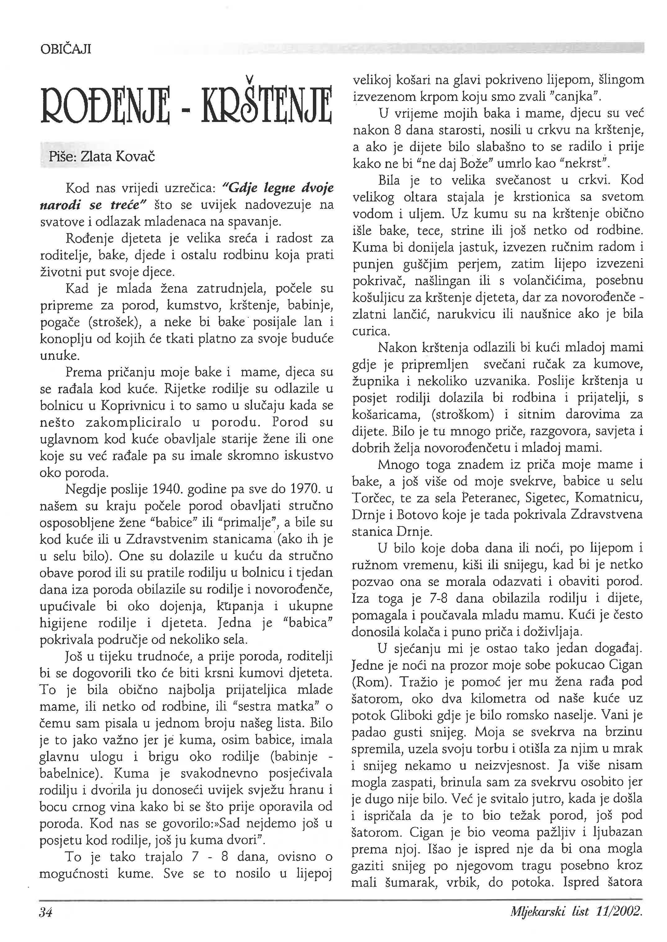 . Još u tijeku a prije poroda, roditelji 61 se dogovorili tko biti krsni kumovi djeteta. To je bila najbolja prijateljica mlade mame, ili netko od rodbine, ili "sestra matka" o sam pisala u jednom broju našeg lista. Bilo je to jako važno jer je kuma, osim babice, imala glavnu ulogu i brigu oko rodilje (babinjebabelnice). _Kuma je svakodnevno rodilju i dvorila ju uvijek svježu hranu i bocu crnog vina kako bi se što prije oporavila od poroda. Kod nas se govorilo:»Sad nejdemo još u posjetu kod rodilje, još ju kuma dvori".