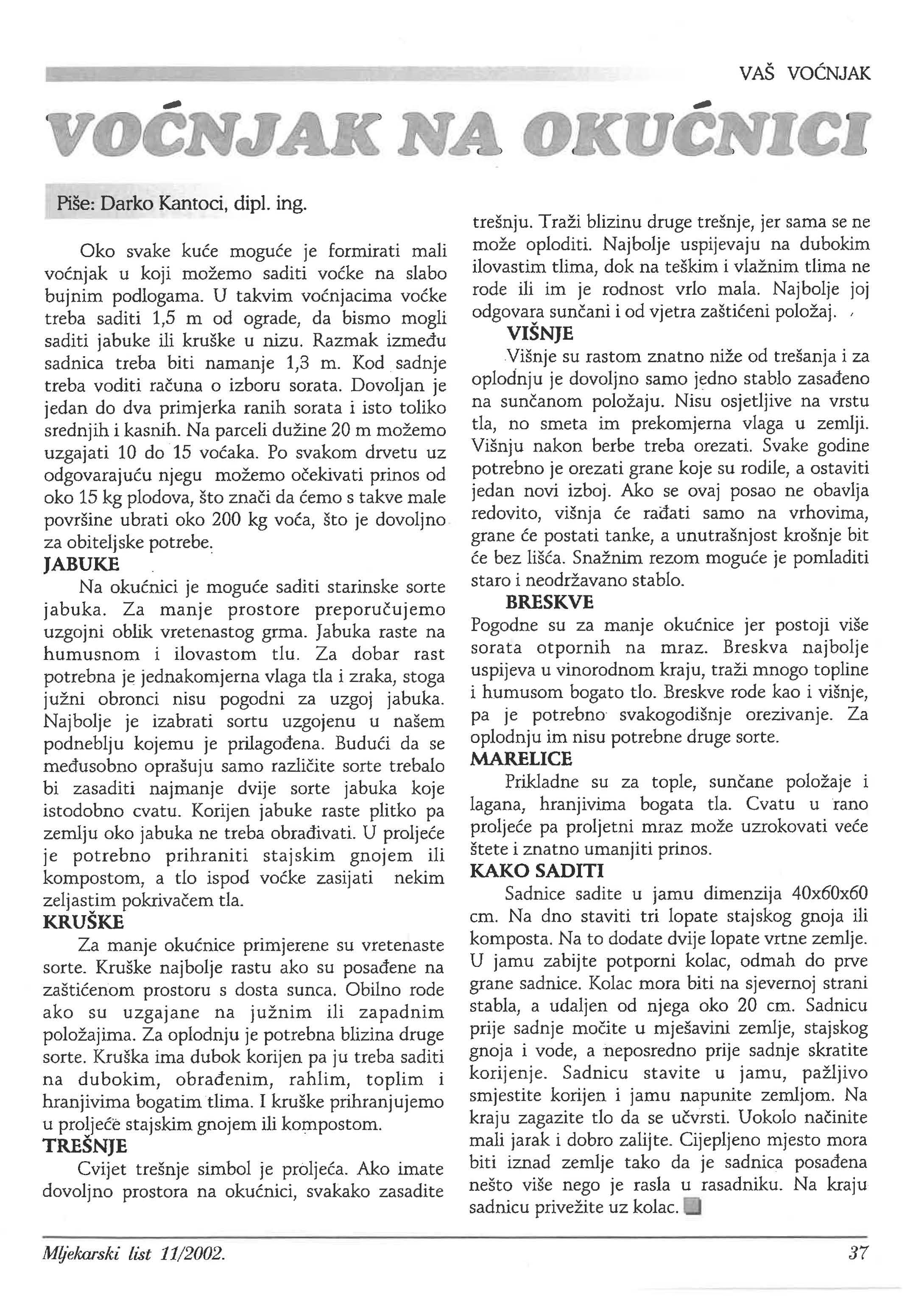 Oko svake je formirati mali u koji možemo saditi na slabo bujnim podlogama. U takvim treba saditi 1,5 m od ograde, da bismo mogli saditi jabuke ili kruške u nizu. Razmak sadnica treba biti namanje 1,3 m. Kod sadnje treba voditi o izboru sorata. Dovoljan je jedan do dva primjerka ranih sorata i isto toliko srednjih i kasnih. Na parceli dužine 20 m možemo uzgajati 10 do 15 Po svakom drvetu uz njegu možemo prinos od oko 15 kg plodova, što da s takve male površine ubrati oko 200 kg što je dovoljno za obiteljske potrebe.