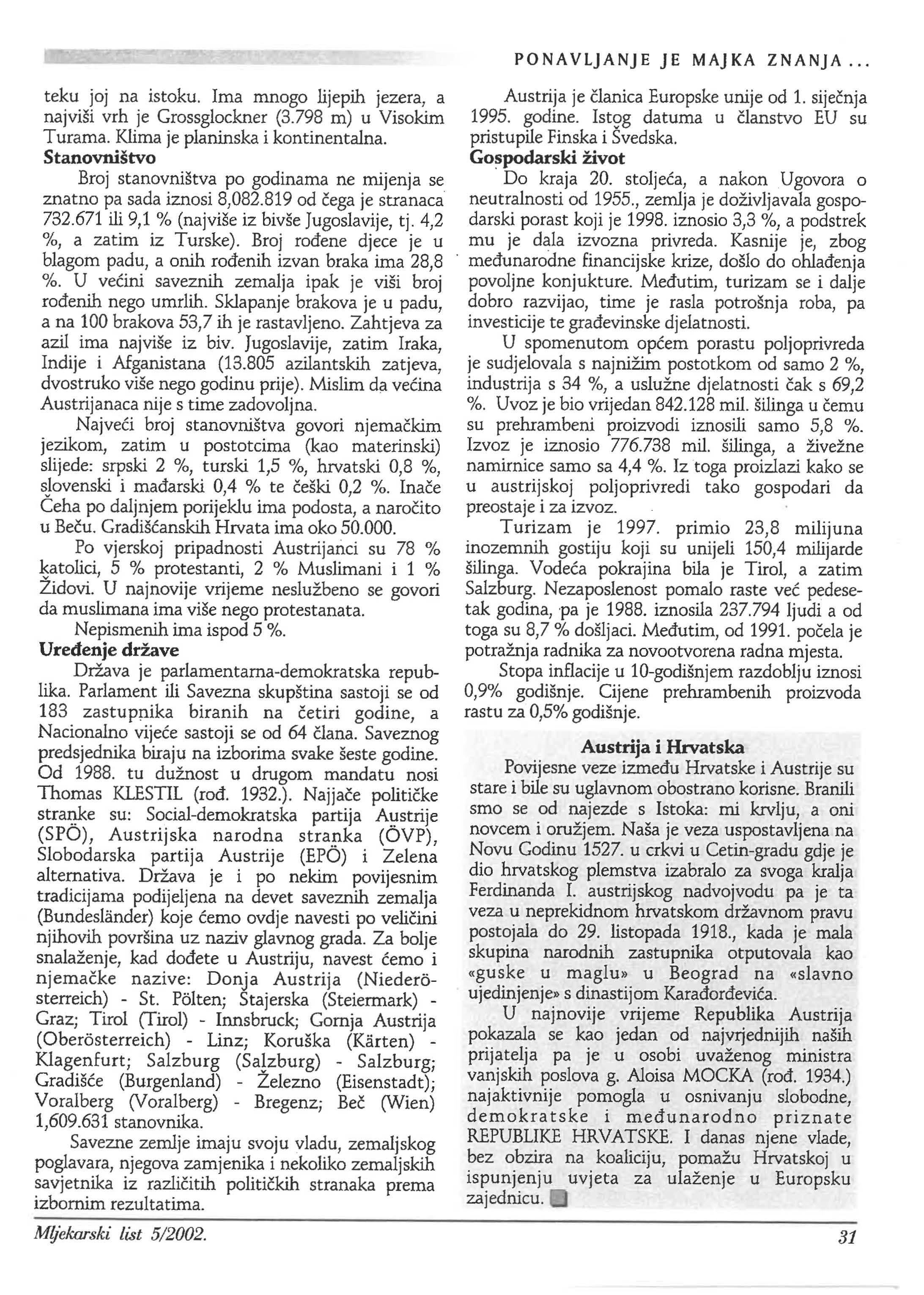Država je parlamentarna-demokratska republika. Parlament ili Savezna skupština sastoji se od 183 zastupµika biranih na godine, a Nacionalno sastoji se od 64 Saveznog predsjednika biraju na izborima svake šeste godine. Od 1988. tu dužnost u drugom mandatu nosi Thomas KLESTIL 1932.). stral}-ke su: Social-demokratska partija A~strije (SPO), Austrijska narodna stranka (OVP), Slobodarska partija Austrije i Zelena alternativa. Država je i po nekim povijesnim tradicijama podijeljena na devet saveznih zemalja (Bundeslander) koje ovdje navesti po njihovih površina uz naziv glavnog grada. Za bolje snalaženje, kad u Austriju, navest i nazive: Donja Austrija (Niederosterreich) - St. Polten; Stajerska (Steiermark)Graz; Tirol (Tirol) - Innsbruck; Gornja Austrija (Oberosterreich) - Linz; Koruška (Karten)Klagenfurt; Salzburg (Salzburg) - Salzburg; (Burgenland) - Železno (Eisenstadt); Voralberg (Voralberg) - Bregenz; (Wien) 1,609.631 stanovnika.