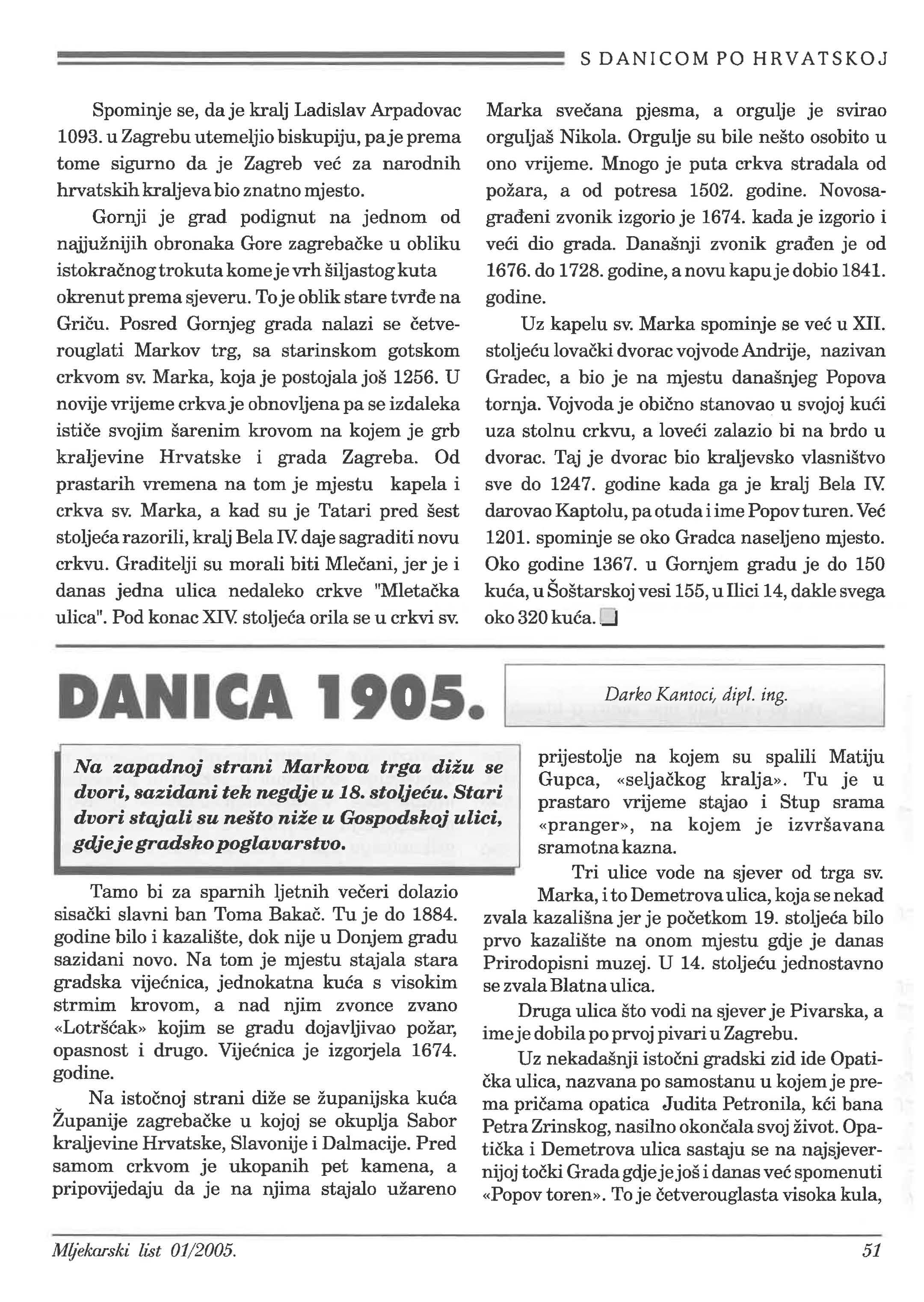 Gornji je grad podignut na jednom od najjužnijih obronaka Gore u obliku trokuta kome je vrh šiljastog kuta okrenut prema sjeveru. To je oblik stare na Posred Gornjeg grada nalazi se rouglati Markov trg, sa starinskom gotskom crkvom sv. Marka, koja je postojala još 1256. U novije vrijeme crkva je obnovljena pa se izdaleka svojim šarenim krovom na kojem je grb kraljevine Hrvatske i grada Zagreba. Od prastarih vremena na tom je mjestu kapela i crkva sv. Marka, a kad su je Tatari pred šest razorili, kralj Bela Iv. daje sagraditi novu crkvu. Graditelji su morali biti jer je i danas jedna ulica nedaleko crkve ulica". Pod konac XIV orila se u crkvi sv.
