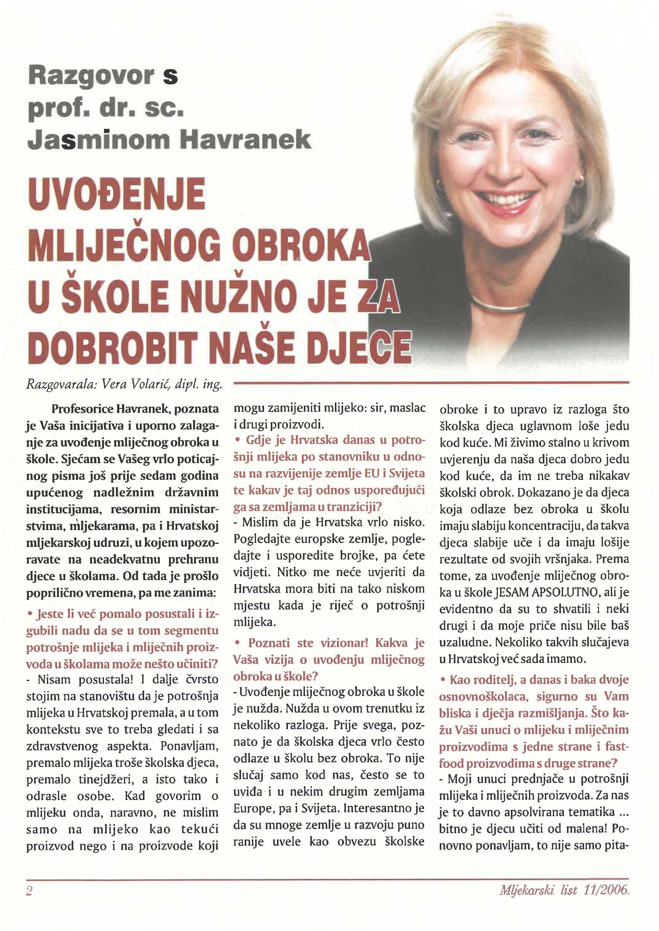 Profesorice Havranek, bilo mi je zadovoljstvo u ime Mljekarskog lista razgovarati s Vama! Od srca Vam zahvaljujem i želim da se godine u proslavu «8. svjetskog dana školskog mlijeka» svi koji razmišljaju o dobrobiti naše djece, pritom mislim na državne institucije, roditelje i nastavnike u školama, a i na i mlijeka koji bi trebali u ovim akcijama i svoj poslovni interes. Nadamo se, da i ubuvremena za ovakve akcije, te svojim autoritetom doprinijeti da obrok i u hrvatskim školama postane svakodnevnica. A ja Vam, kao dugogodišnjem i uvaženom Hrvatske mljekarske udruge želim uspješan nastavak svih projekata i akcija, a posebno na temu mlijeobroka u