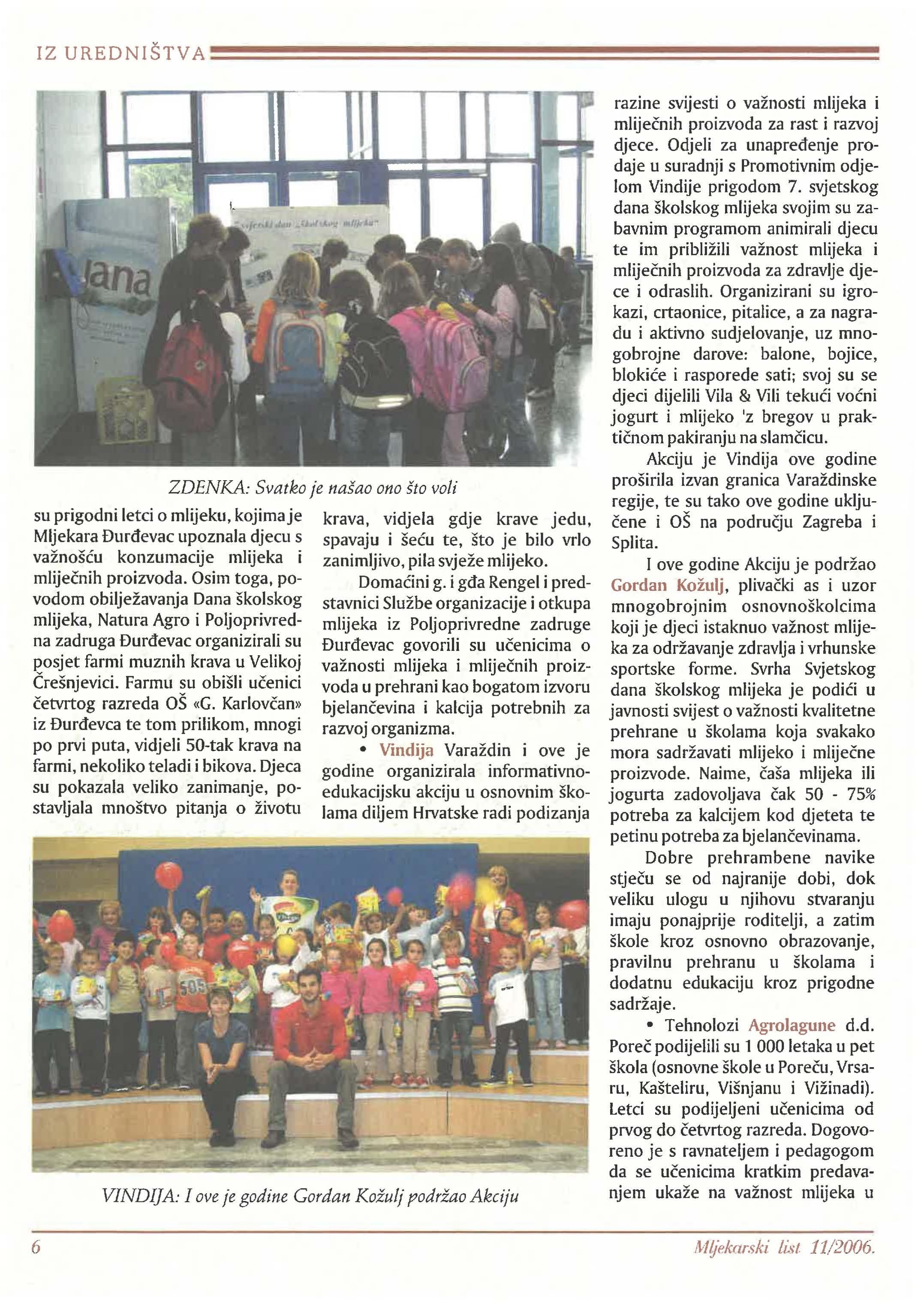 ZDENKA: Svatko je našao onošto voli su prigodni letci o mlijeku, kojima je krava, vidjela gdje krave jedu, Mljekara upoznala djecu s spavaju i te, što je bilo vrlo konzumacije mlijeka i zanimljivo, pila svježe mlijeko. proizvoda. Osim toga, po- g. i Rengel i predvodom obilježavanja Dana školskog stavnici Službe organizacije i otkupa mlijeka, Natura Agro i Poljoprivred- mlijeka iz Poljoprivredne zadruge na zadruga organizirali su govorili su o posjet farmi muznih krava u Velikoj važnosti mlijeka i proizFarmu su obišli voda u prehrani kao bogatom izvoru razreda OŠ «G. i kalcija potrebnih za iz te tom prilikom, mnogi razvoj organizma. po pivi puta, vidjeli 50-tak krava na • Vindija Varaždin i ove je farmi, nekoliko teladi i bikova. Djeca godine organizirala informativnosu pokazala veliko zanimanje, po- edukacijsku akciju u osnovnim škostavljala mnoštvo pitanja o životu tama diljem Hivatske radi podizanja