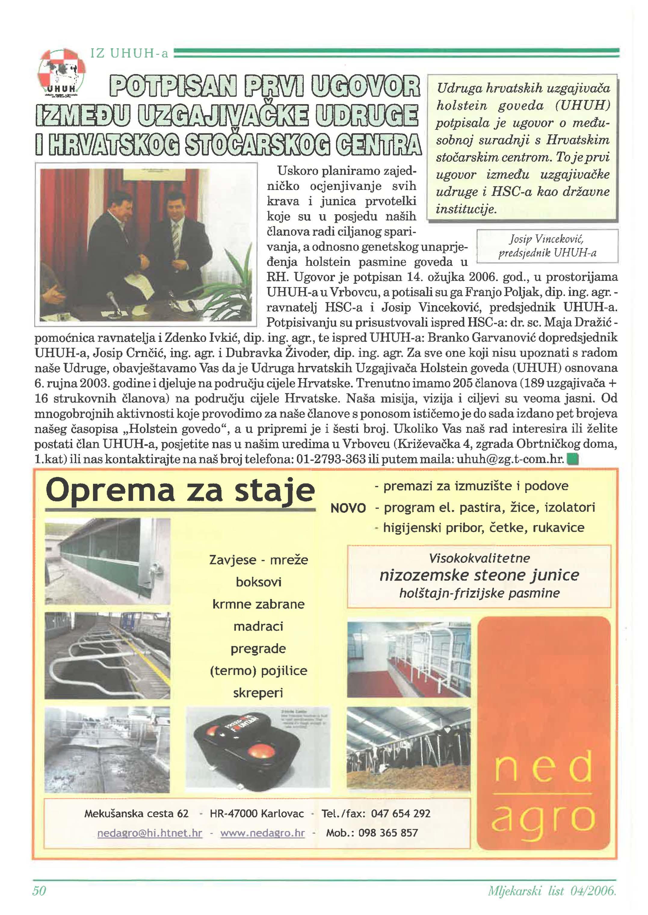 Uskoro planiramo zajedocjenjivanje svih krava i junica prvotelki institucije. koje su u posjedu naših radi ciljanog sparivanja, a odnosno genetskog unaprjeholstein pasmine goveda u ]osip preds1ednikUHUH-a RH. Ugovor je potpisan 14. ožujka 2006. god., u prostorijama UHUH-a u Vrbovcu, a potisali su ga Franjo Poljak, dip. ing. agr.ravnatelj HSC-a i Josip predsjednik UHUH-a. Potpisivanju su prisustvovali ispred HSC-a: dr. se. Majaravnatelja i Zdenko dip. ing. agr., te ispred UHUH-a: Branko dopredsjednik UHUH-a, Josip ing. agr. i Dubravka Živoder, dip. ing. agr. Za sve one koji nisu upoznati s radom naše Udruge, obavještavamo Vas daje Udruga hrvatskih Holstein goveda (UHUH) osnovana 6. rujna 2003. godine i djeluje na cijele Hrvatske. Trenutno imamo 205 (189 16 strukovnih na cijele Hrvatske. Naša misija, vizija i ciljevi su veoma jasni. Od mnogobrojnih aktivnosti koje provodimo za naše s ponosom je do sada izdano pet brojeva našeg „Holstein govedo", a u pripremi je i šesti broj. Ukoliko Vas naš rad interesira ili želite postati UHUH-a, posjetite nas u našim uredima u Vrbovcu 4, zgrada doma, 1.kat) ili nas kontaktirajte na naš broj telefona: 01-2793-363 ili putem maila: uhuh@zg.t-com.hr.