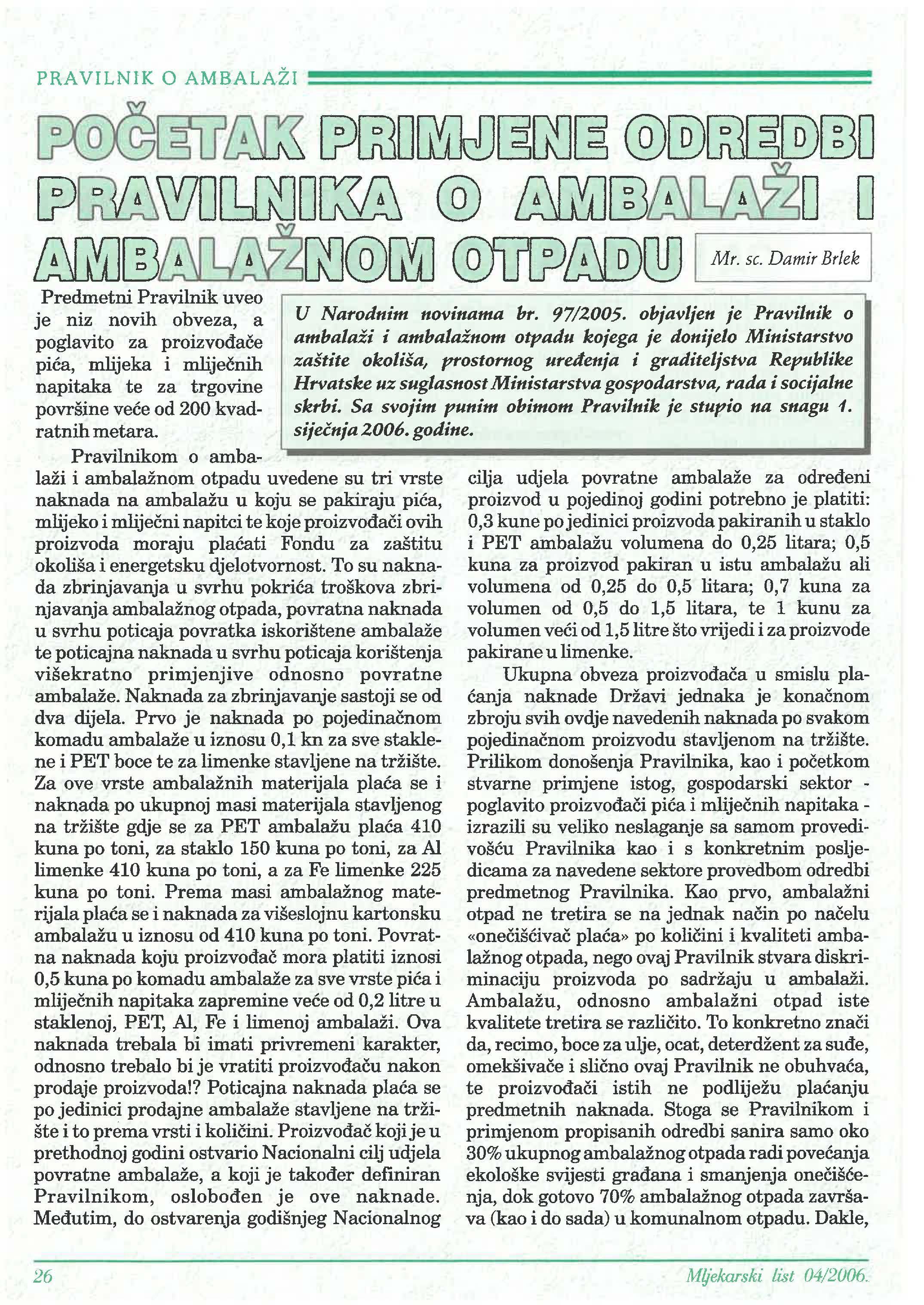 PRAVILNIK O AMBALAZI primjene odredbi Pravilnika o ambalaži i ambalažnom otpadu ______________ 26