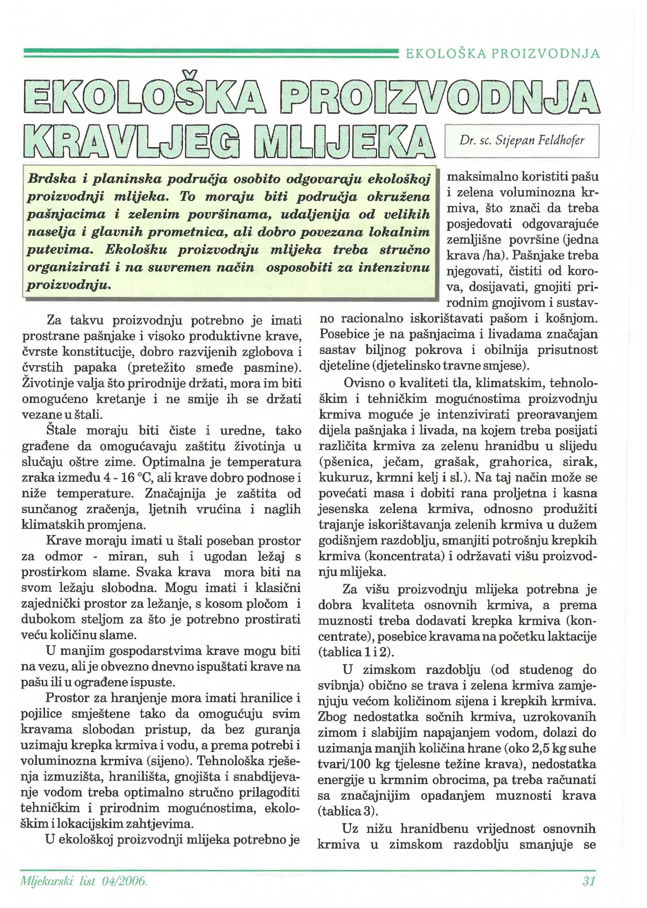 Ekološka proizvodnja kravljeg mlijeka ___________ 31