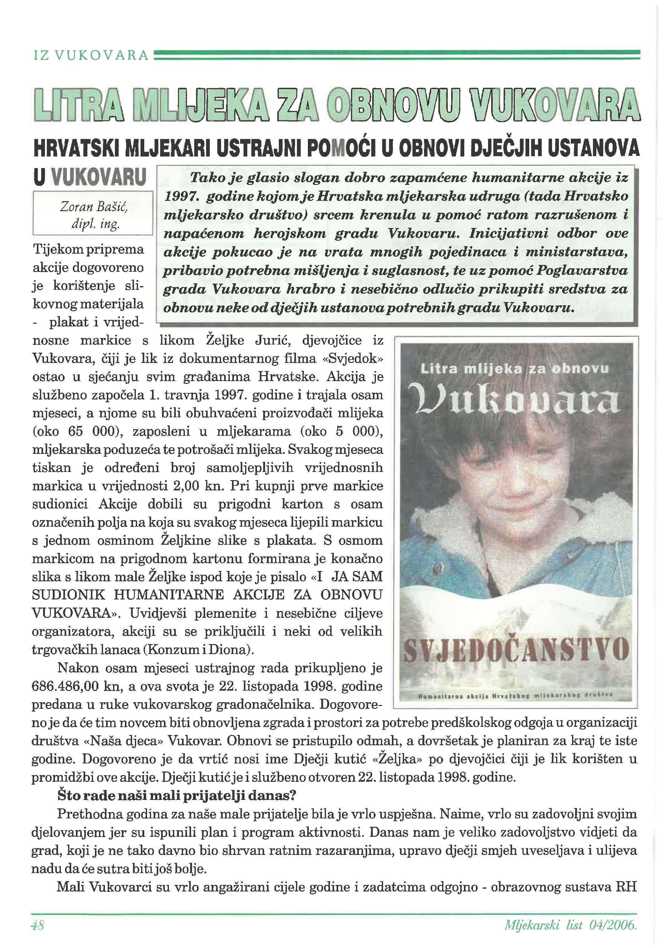 nosne markice s likom Željke iz Vukovara, je lik iz dokumentarnog filma «Svjedok» ostao u svim Hrvatske. Akcija je službeno 1. travnja 1997. godine i trajala osam mjeseci, a njome su bili mlijeka (oko 65 000), zaposleni u mljekarama (oko 5 000), mljekarska te mlijeka. Svakog mjeseca tiskan je broj samoljepljivih vrijednosnih markica u vrijednosti 2,00 kn. Pri kupnji prve markice sudionici Akcije dobili su prigodni karton s osam