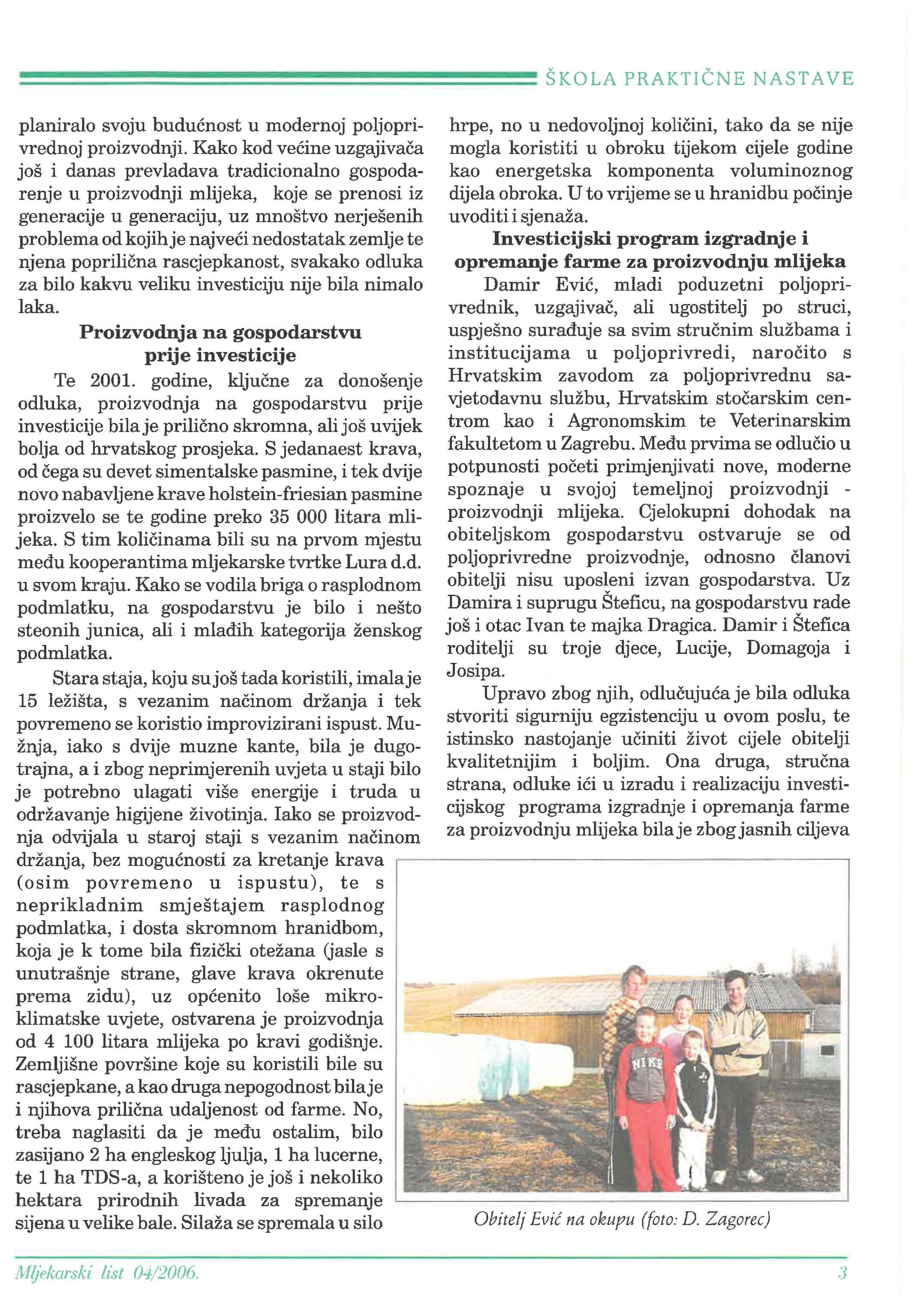 Investicijski program izgradnje i opremanje farme za proizvodnju mlijeka Damir mladi poduzetni poljoprivrednik, ali ugostitelj po struci, uspješno sa svim službama i institucijama u poljoprivredi, s Hrvatskim zavodom za poljoprivrednu savjetodavnu službu, Hrvatskim centrom kao i Agronomskim te Veterinarskim fakultetom u Zagrebu. prvima se u potpunosti primjenjivati nove, moderne spoznaje u svojoj temeljnoj proizvodnjiproizvodnji mlijeka. Cjelokupni dohodak na obiteljskom gospodarstvu ostvaruje se od poljoprivredne proizvodnje, odnosno obitelji nisu uposleni izvan gospodarstva. Uz Damira i suprugu Šteficu, na gospodarstvu rade još i otac I van te majka Dragica. Damir i Štefica roditelji su troje djece, Lucije, Domagoja i Josipa.