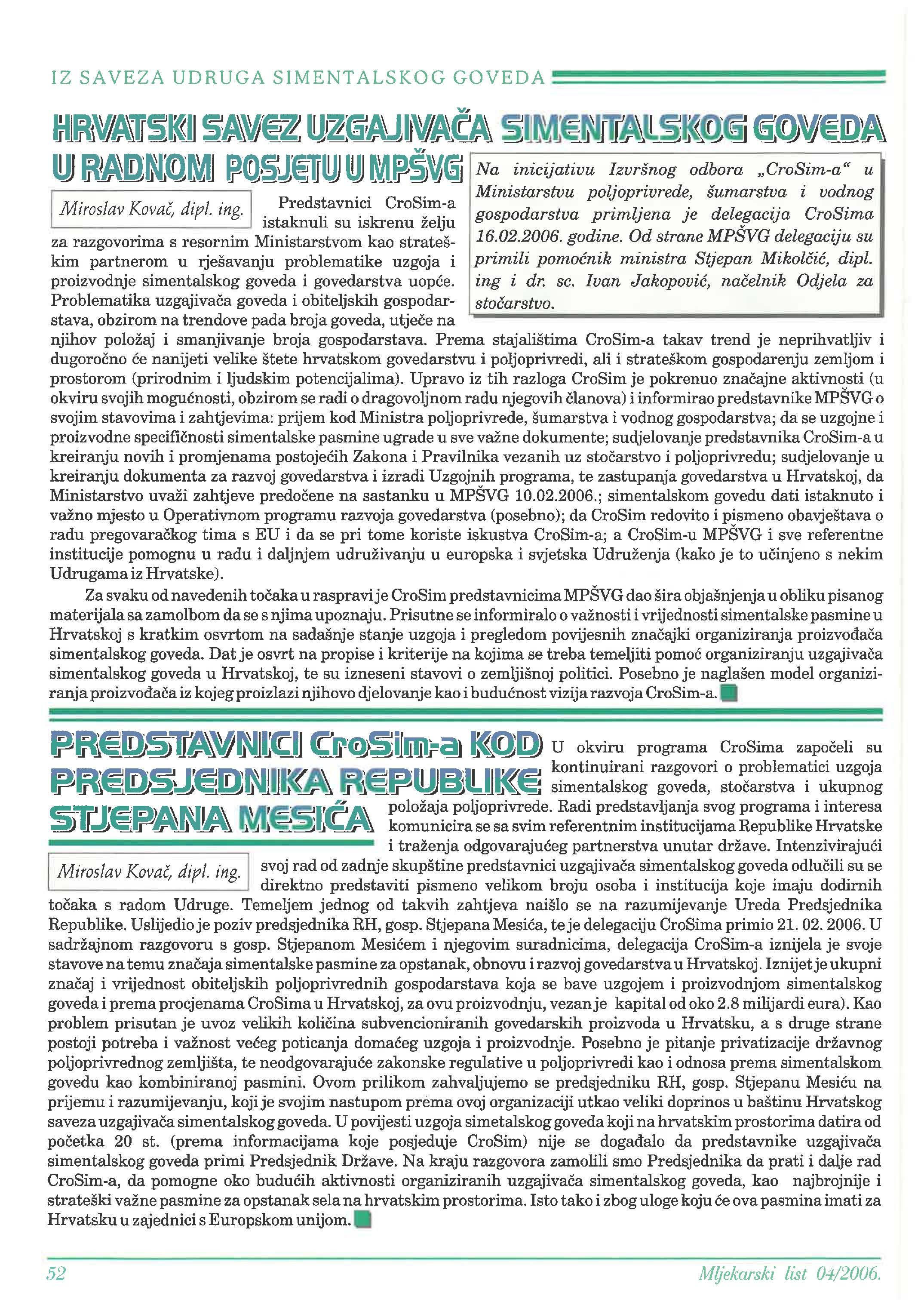 ~1R1eO.S1FAVINJtCfle1r·<rJ>Stilill1;alllQID) u okviru programa CroSima su ~-~·~n-~ l'~rr\11\\llllllWI\\ ~,~nuJ~'lllllll?~k_ontinuirani razgovori O ~roblem~tici uzgoja F''1'\1~""~}J;~~ll"1!1~ffi1 ~1~1F' Q _!!~~ s1mentalskog goveda, stocarstva 1 ukupnog ~T 1\\1111\\ll\ll'~-~l''F položaj~ ~oljoprivr~de. Radi pre~st~vlj~nj~ _svogprogr~a i interesa l!JJ~F~J.1'11:\.1 !.1~1 komumc1ra se sa sVImreferentmm mstituc1Jama Republike Hrvatske i traženja partnerstva unutar države. Miroslav dipl. ing. svoj rad od zadnje skupštine predstavnici simentalskog goveda su se direktno predstaviti pismeno velikom broju osoba i institucija koje imaju dodirnih s radom Udruge. Temeljem jednog od takvih zahtjeva naišlo se na razumijevanje Ureda Predsjednika Republike. Uslijedio je poziv predsjednika RH, gosp. Stjepana te je delegaciju CroSima primio 21. 02. 2006. U sadržajnom razgovoru s gosp. Stjepanom i njegovim suradnicima, delegacija CroSim-a iznijela je svoje stavove na temu simentalske pasmine za opstanak, obnovu i razvoj govedarstva u Hrvatskoj. Iznijetje ukupni i vrijednost obiteljskih poljoprivrednih gospodarstava koja se bave uzgojem i proizvodnjom simentalskog goveda i prema procjenama CroSima u Hrvatskoj, za ovu proizvodnju, vezanje kapital od oko 2.8 milijardi eura). Kao problem prisutan je uvoz velikih subvencioniranih govedarskih proizvoda u Hrvatsku, a s druge strane postoji potreba i važnost poticanja uzgoja i proizvodnje. Posebno je pitanje privatizacije državnog poljoprivrednog zemljišta, te zakonske regulative u poljoprivredi kao i odnosa prema simentalskom govedu kao kombiniranoj pasmini. Ovom prilikom zahvaljujemo se predsjedniku RH, gosp. Stjepanu na prijemu i razumijevanju, koji je svojim nastupom prema ovoj organizaciji utkao veliki doprinos u baštinu Hrvatskog saveza simentalskog goveda. U povijesti uzgoja simetalskog goveda koji na hrvatskim prostorima datira od 20 st. (prema informacijama koje posjeduje CroSim) nije se da predstavnike simentalskog goveda primi Predsjednik Države. Na kraju razgovora zamolili smo Predsjednika da prati i dalje rad CroSim-a, da pomogne oko aktivnosti organiziranih simentalskog goveda, kao najbrojnije i strateški važne pasmine za opstanak sela na hrvatskim prostorima. Isto tako i zbog uloge koju ova pasmina imati za Hrvatsku u zajednici s Europskom