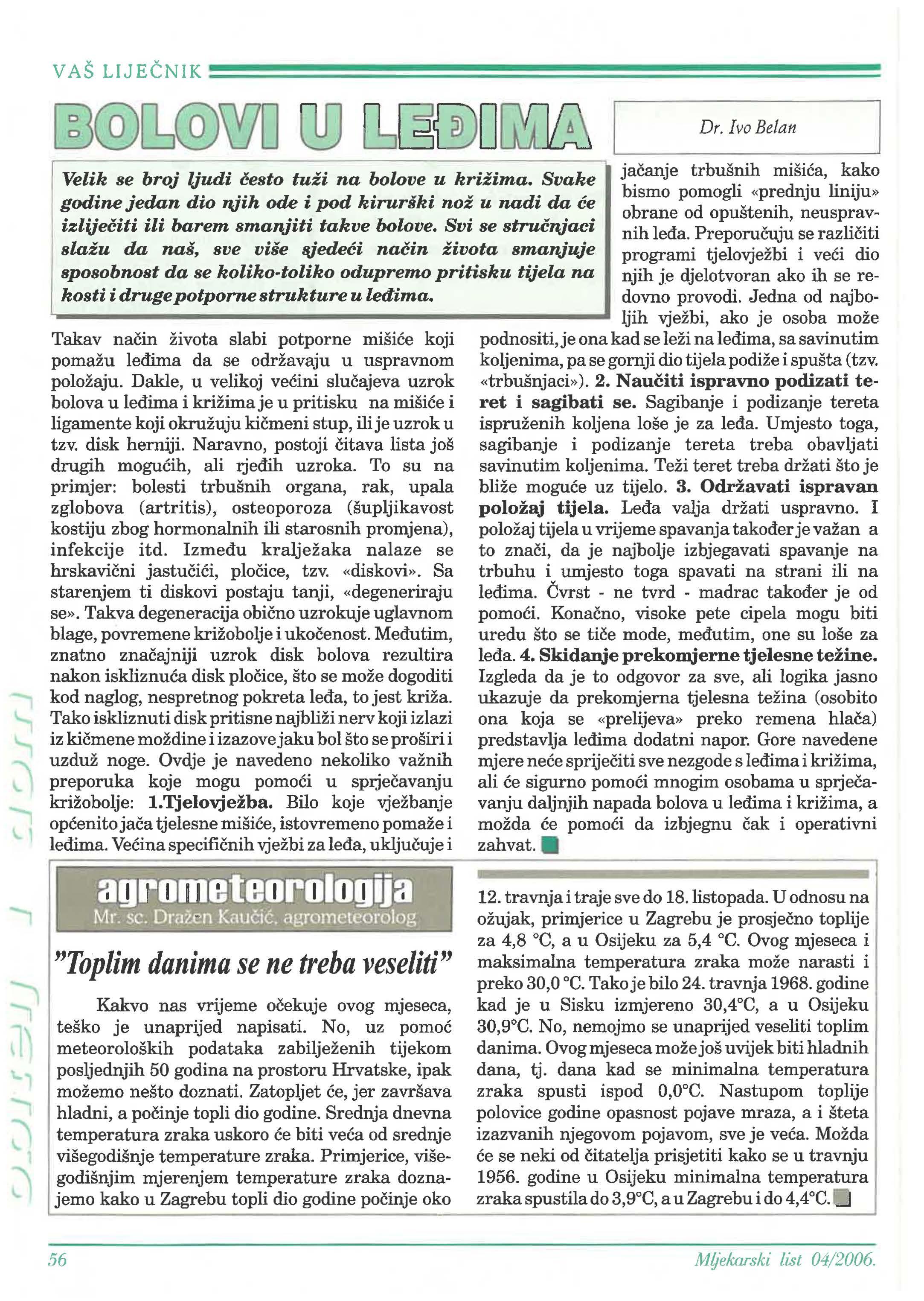12. travnja i traje sve do 18. listopada. U odnosu na ožujak, primjerice u Zagrebu je toplije za 4,8 °C, a u Osijeku za 5,4 °C. Ovog mjeseca i maksimalna temperatura zraka može narasti i preko 30,0 °C. Tako je bilo 24. travnja 1968. godine kad je u Sisku izmjereno 30,4°C, a u Osijeku 30,9°C. No, nemojmo se unaprijed veseliti toplim danima. Ovog mjeseca može još uvijek biti hladnih dana, tj. dana kad se minimalna temperatura zraka spusti ispod 0,0°C. Nastupom toplije polovice godine opasnost pojave mraza, a i šteta izazvanih njegovom pojavom, sve je Možda se neki od prisjetiti kako se u travnju 1956. godine u Osijeku minimalna temperatura zraka spustila do 3,9°C, a u Zagrebu i do 4,4 °C.