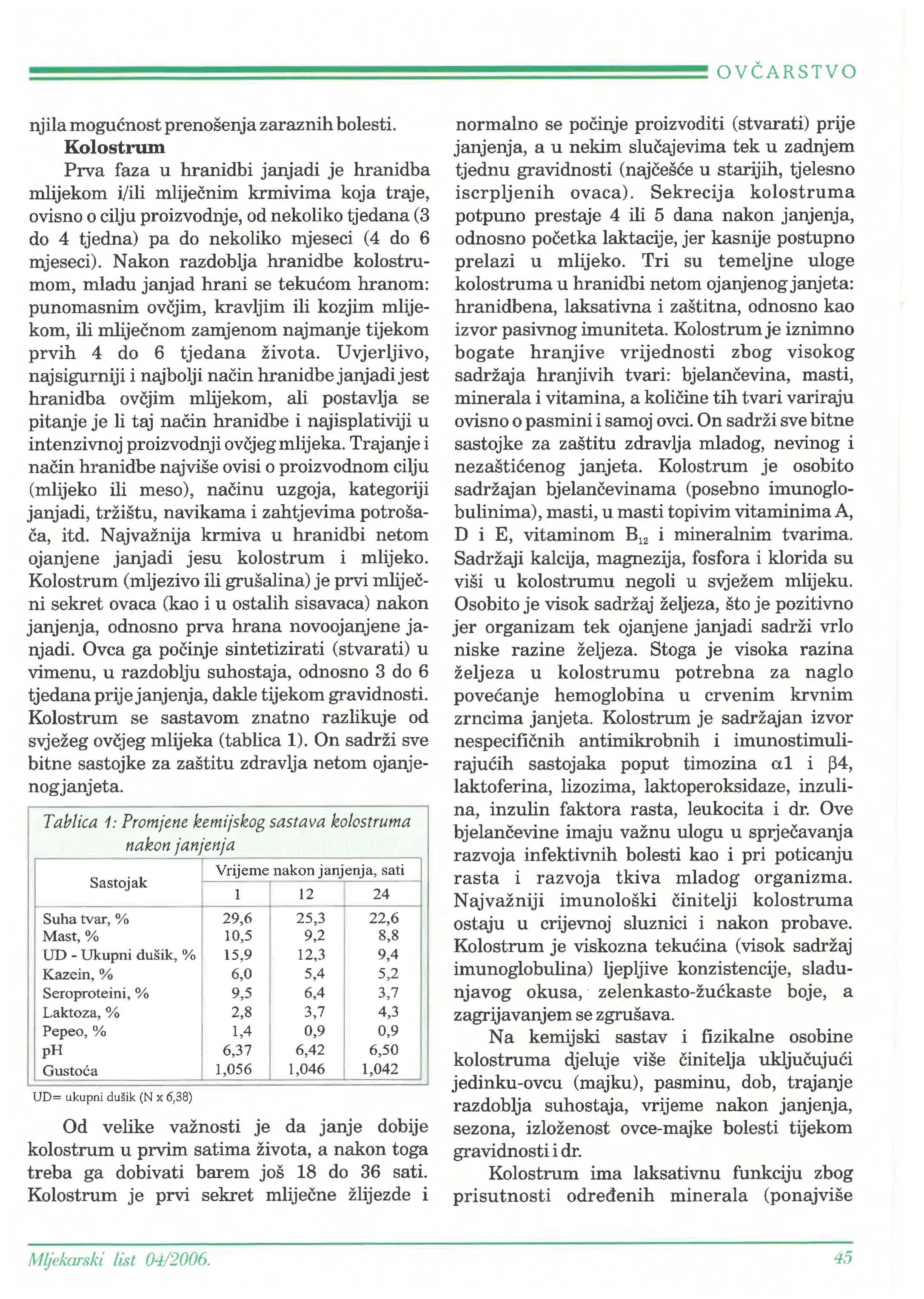 normalno se proizvoditi (stvarati) prije janjenja, a u nekim tek u zadnjem tjednu gravidnosti u starijih, tjelesno iscrpljenih ovaca). Sekrecija kolostruma potpuno prestaje 4 ili 5 dana nakon janjenja, odnosno laktacije, jer kasnije postupno prelazi u mlijeko. Tri su temeljne uloge kolostruma u hranidbi netom ojanjenog janjeta: hranidbena, laksativna i zaštitna, odnosno kao izvor pasivnog imuniteta. Kolostrum je iznimno bogate hranjive vrijednosti zbog visokog sadržaja hranjivih tvari: masti, minerala i vitamina, a tih tvari variraju ovisno o pasmini i samoj ovci. On sadrži sve bitne sastojke za zaštitu zdravlja mladog, nevinog i janjeta. Kolostrum je osobito sadržajan (posebno imunoglobulinima), masti, u masti topivim vitaminima A, D i E, vitaminom B12 i mineralnim tvarima. Sadržaji kalcija, magnezija, fosfora i klorida su viši u kolostrumu negoli u svježem mlijeku. Osobito je visok sadržaj željeza, što je pozitivno jer organizam tek ojanjene janjadi sadrži vrlo niske razine željeza. Stoga je visoka razina željeza u kolostrumu potrebna za naglo hemoglobina u crvenim krvnim zrncima janjeta. Kolostrum je sadržajan izvor antimikrobnih i imunostimulisastojaka poput timozina a.1 i ~4, laktoferina, lizozima, laktoperoksidaze, inzulina, inzulin faktora rasta, leukocita i dr. Ove imaju važnu ulogu u razvoja infektivnih bolesti kao i pri poticanju rasta i razvoja tkiva mladog organizma. Najvažniji imunološki kolostruma ostaju u crijevnoj sluznici i nakon probave. Kolostrum je viskozna (visok sadržaj imunoglobulina) ljepljive konzistencije, sladunjavog okusa, · boje, a zagrijavanjem se zgrušava.