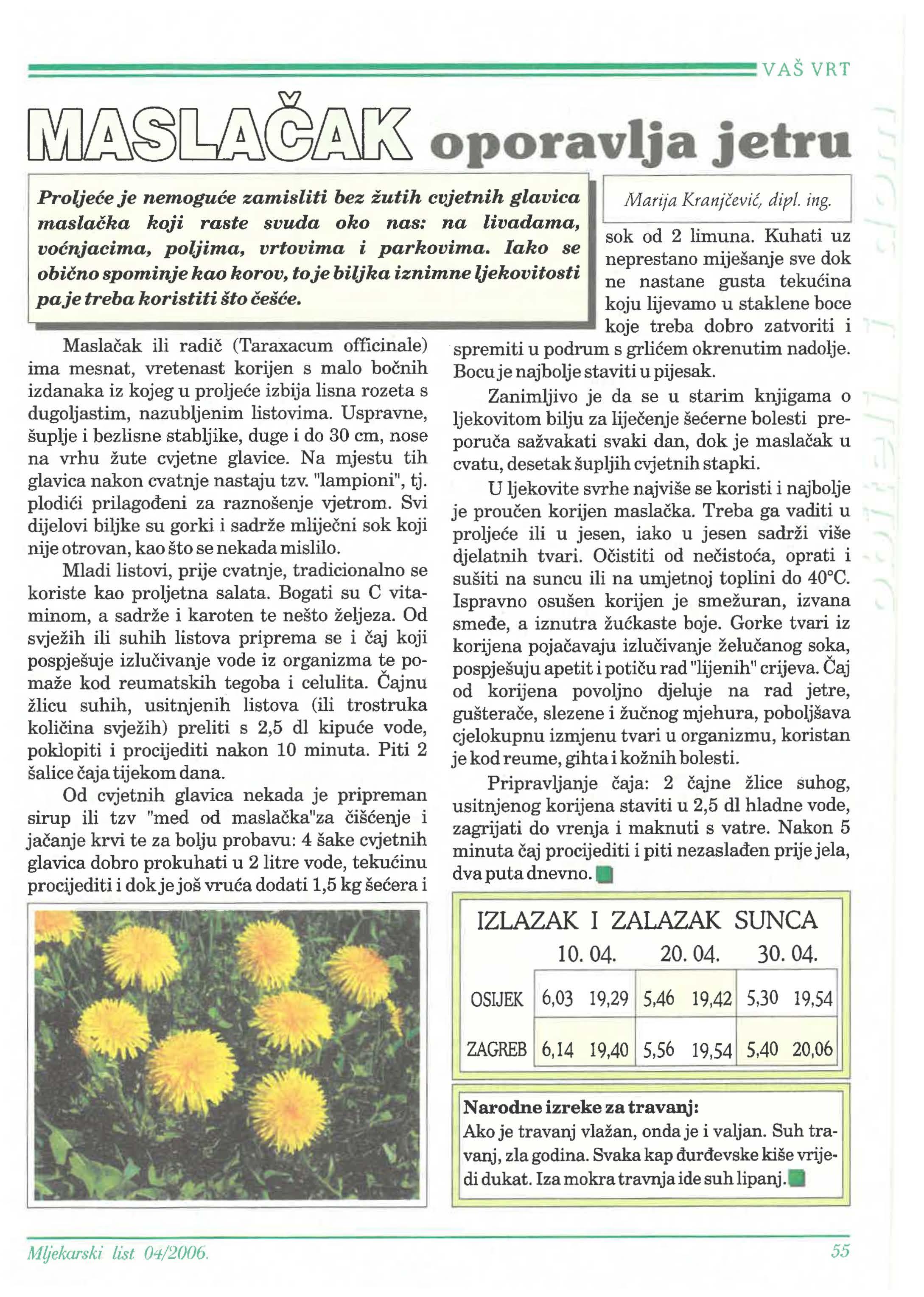 Narodne izreke za travanj: Ako je travanj vlažan, ondaje i valjan. Suh travanj, zla godina. Svaka kap kiše vrijedi dukat. Iza mokra travnja ide suh lipattj