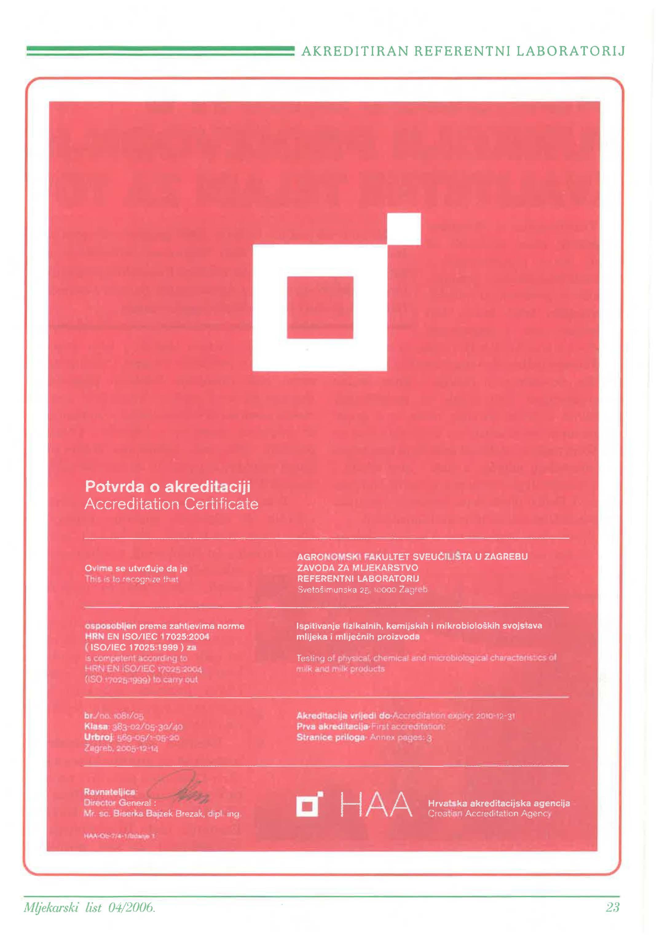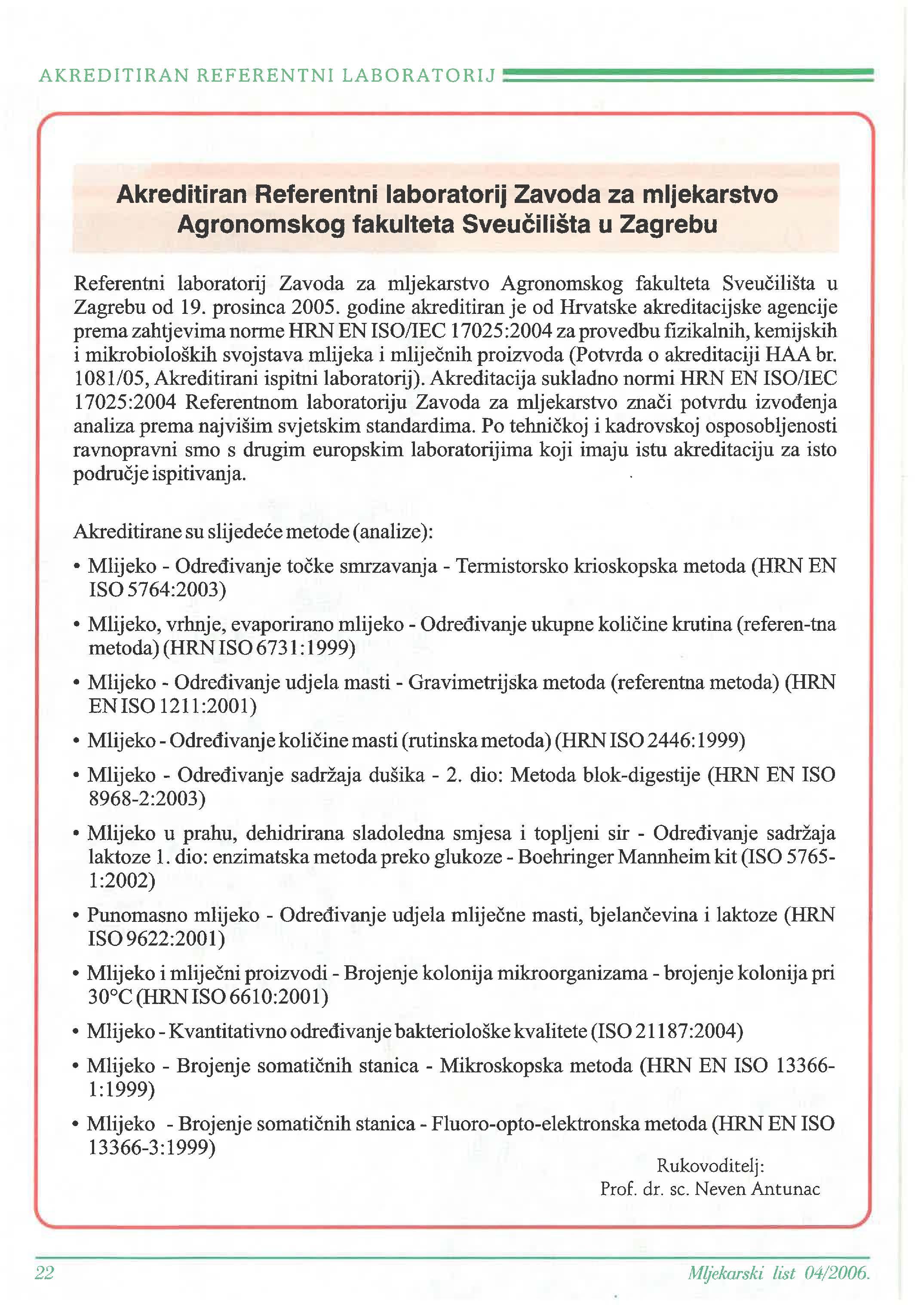 Akreditirao Referentni laboratorij Zavoda za mljekarstvo Agronomskog fakulteta u Zagrebu ______________________ 22
