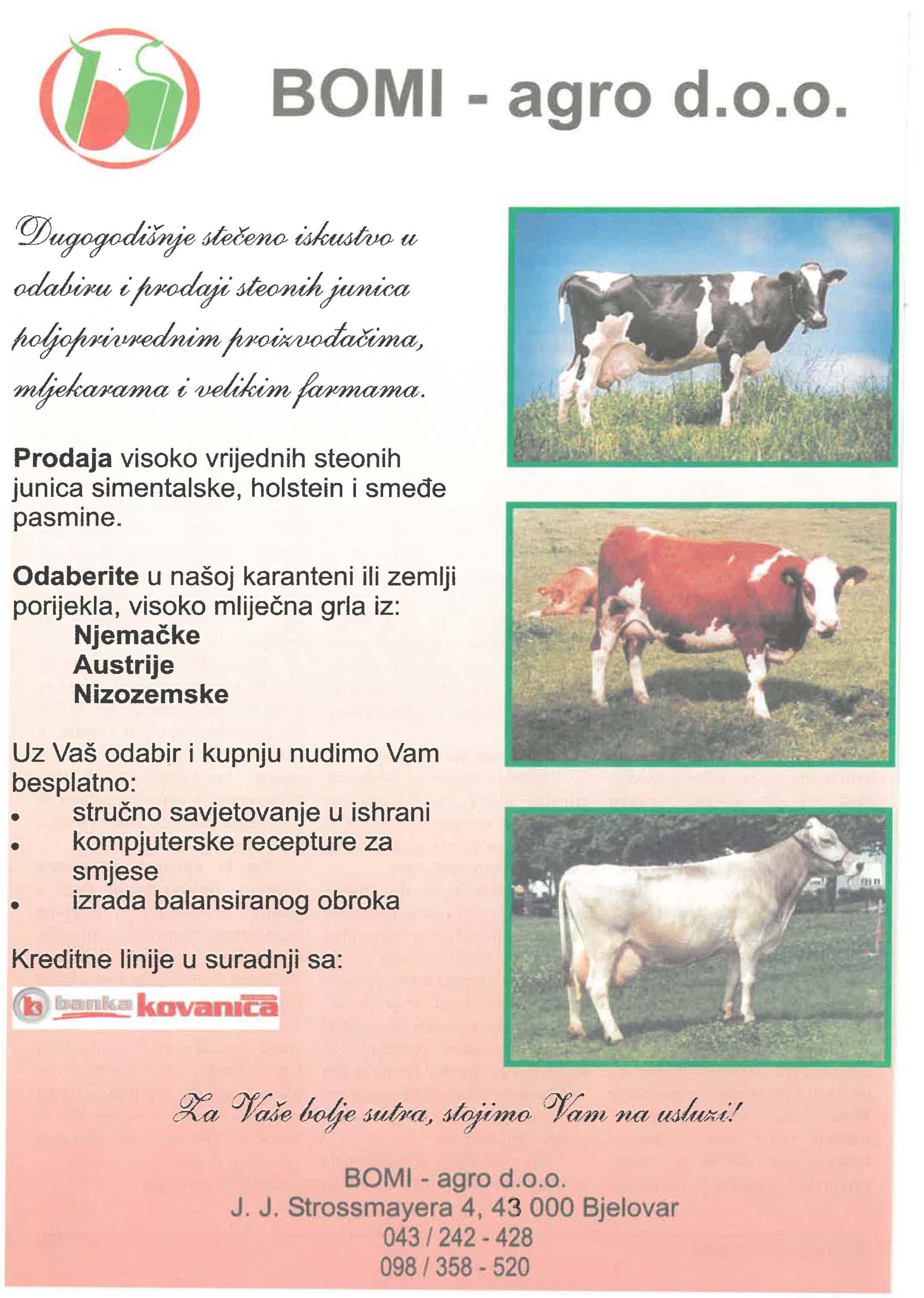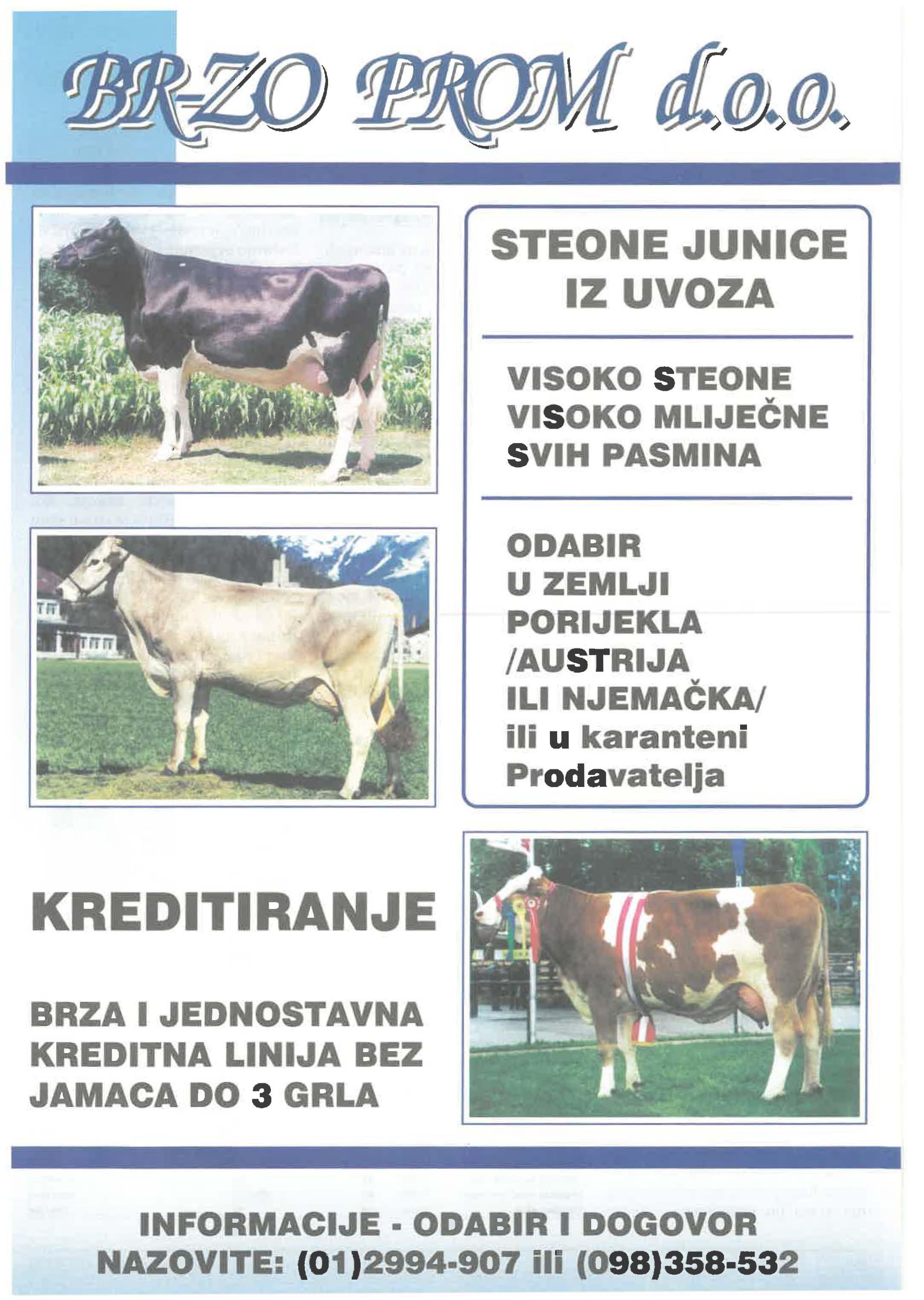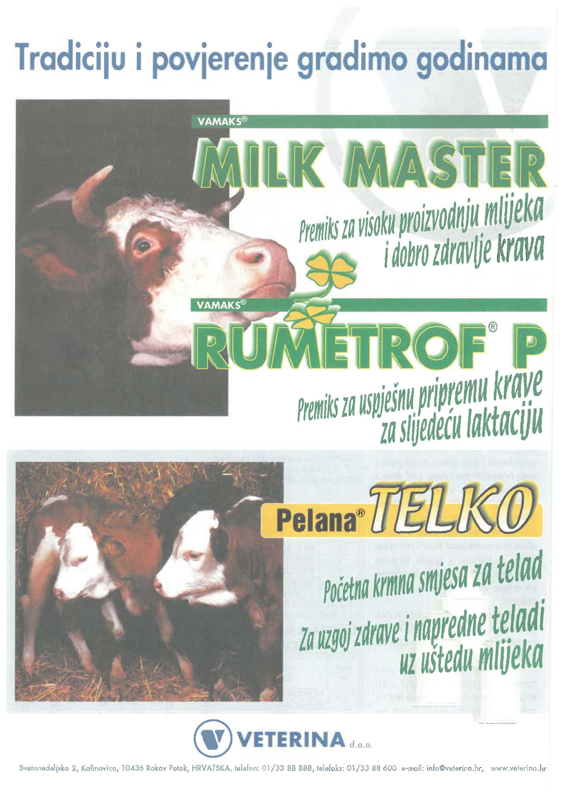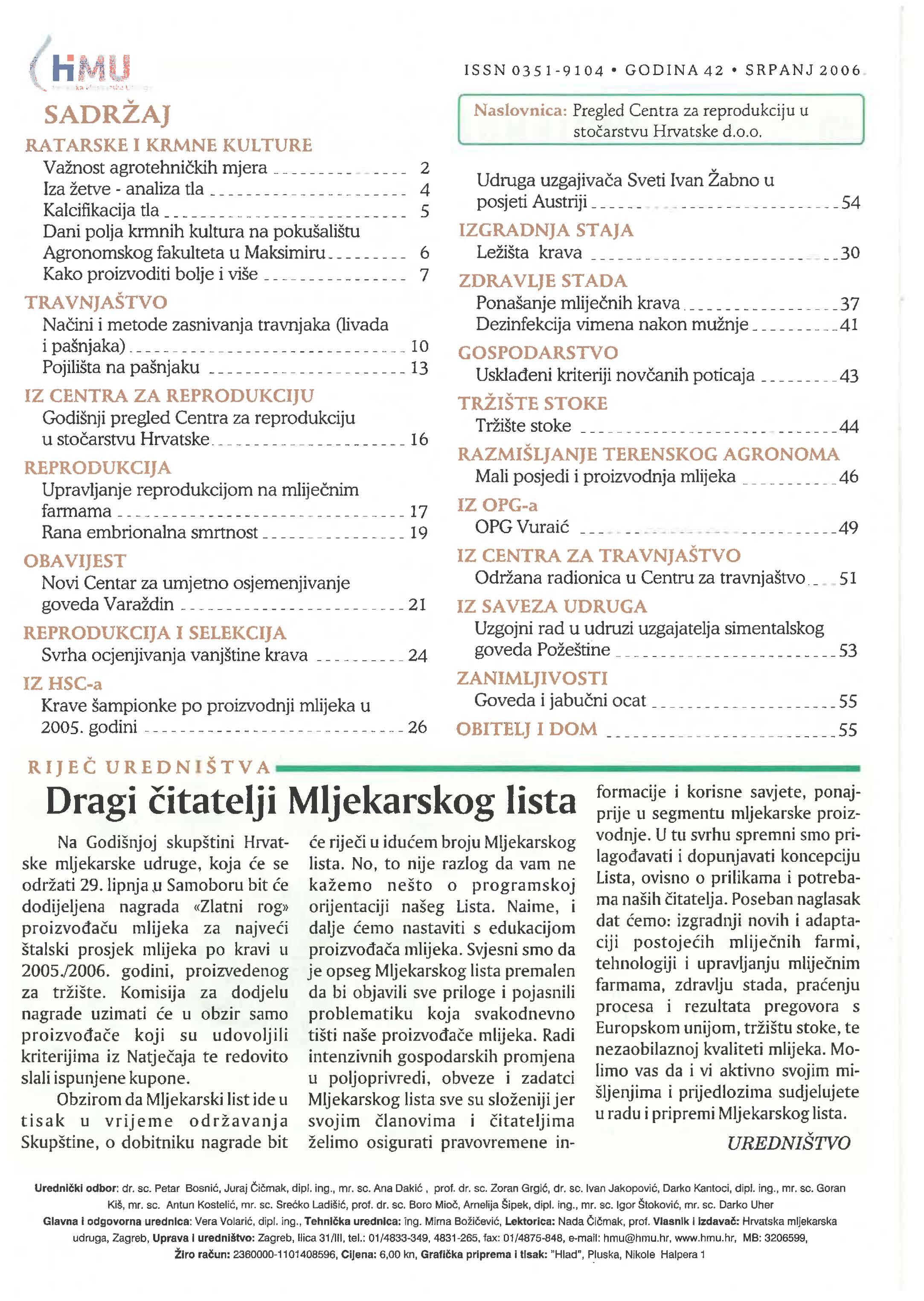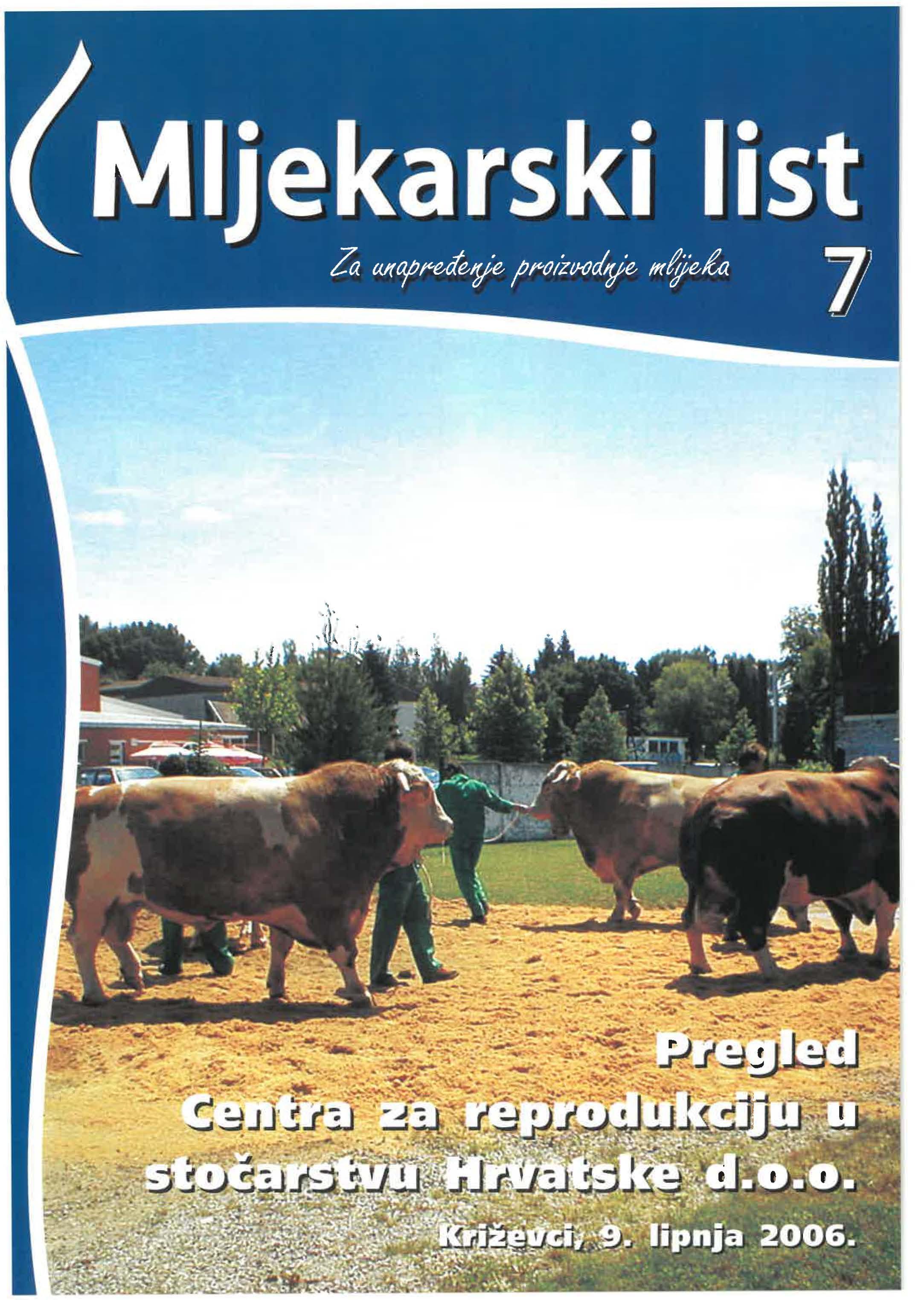 formacije i korisne savjete, ponajprije u segmentu mljekarske proizvodnje. U tu svrhu spremni smo prii dopunjavati koncepciju Lista, ovisno o prilikama i potrebama naših Poseban naglasak dat izgradnji novih i adaptaciji farmi, tehnologiji i upravljanju farmama, zdravlju stada, procesa i rezultata pregovora s Europskom unijom, tržištu stoke, te nezaobilaznoj kvaliteti mlijeka. Molimo vas da i vi aktivno svojim mišljenjima i prijedlozima sudjelujete u radu i pripremi Mljekarskog lista. UREDNIŠTVO