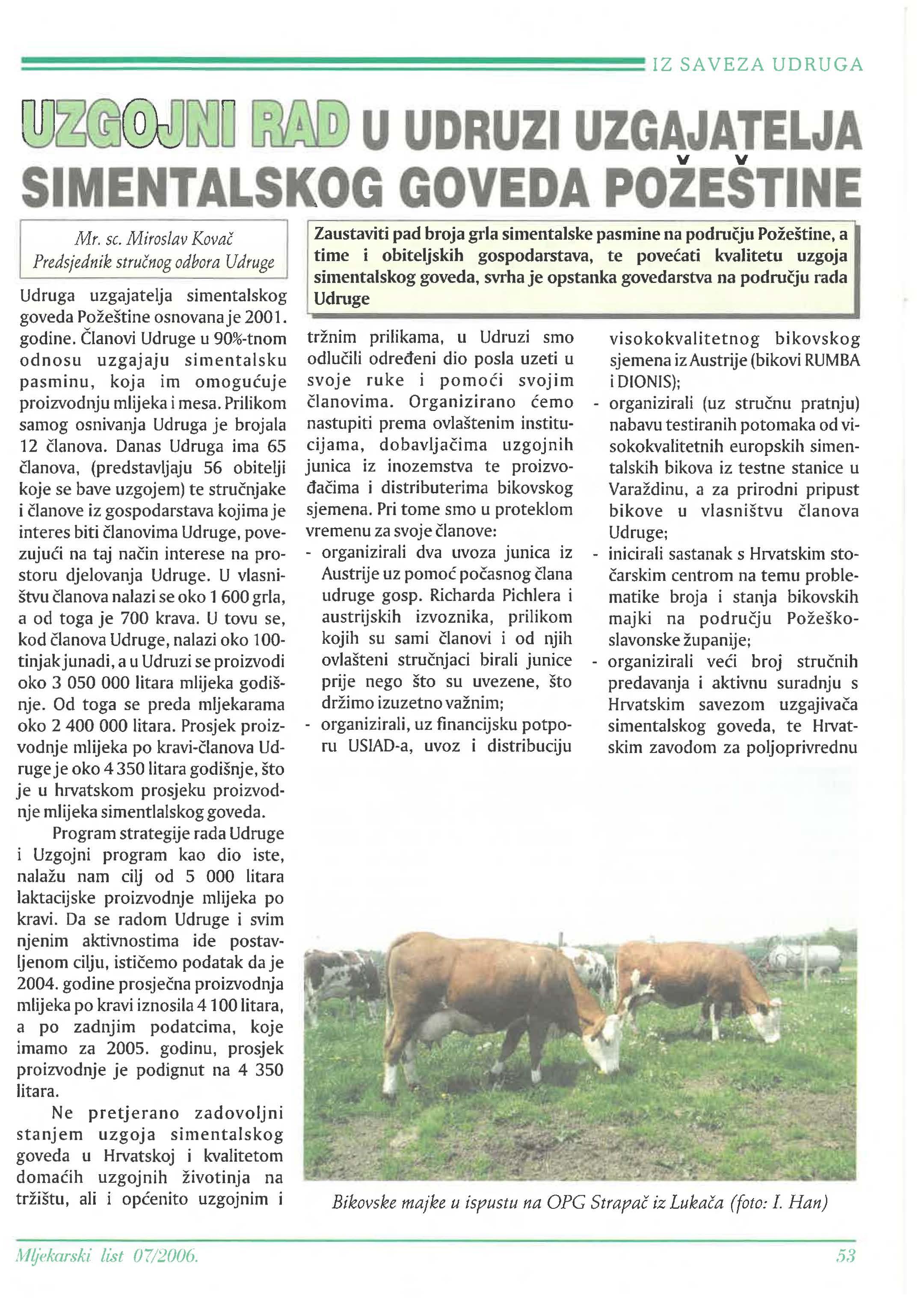 savjetodavnu službu. - tijekom svih godina rada Udruge organizirali smo promotivne aktivnosti uzgoja simentalskog goveda i aktivno sudjelovali na stoizložbi u Alilovcima 2005. - i na kraju, nešto što nije u direktnoj vezi s uzgojem ali važnu kariku u lancu uzgojnih interesa, je potpis partnerskog sporazuma s lokalnom mljekarom BIZiz Buka - na taj stvaranje