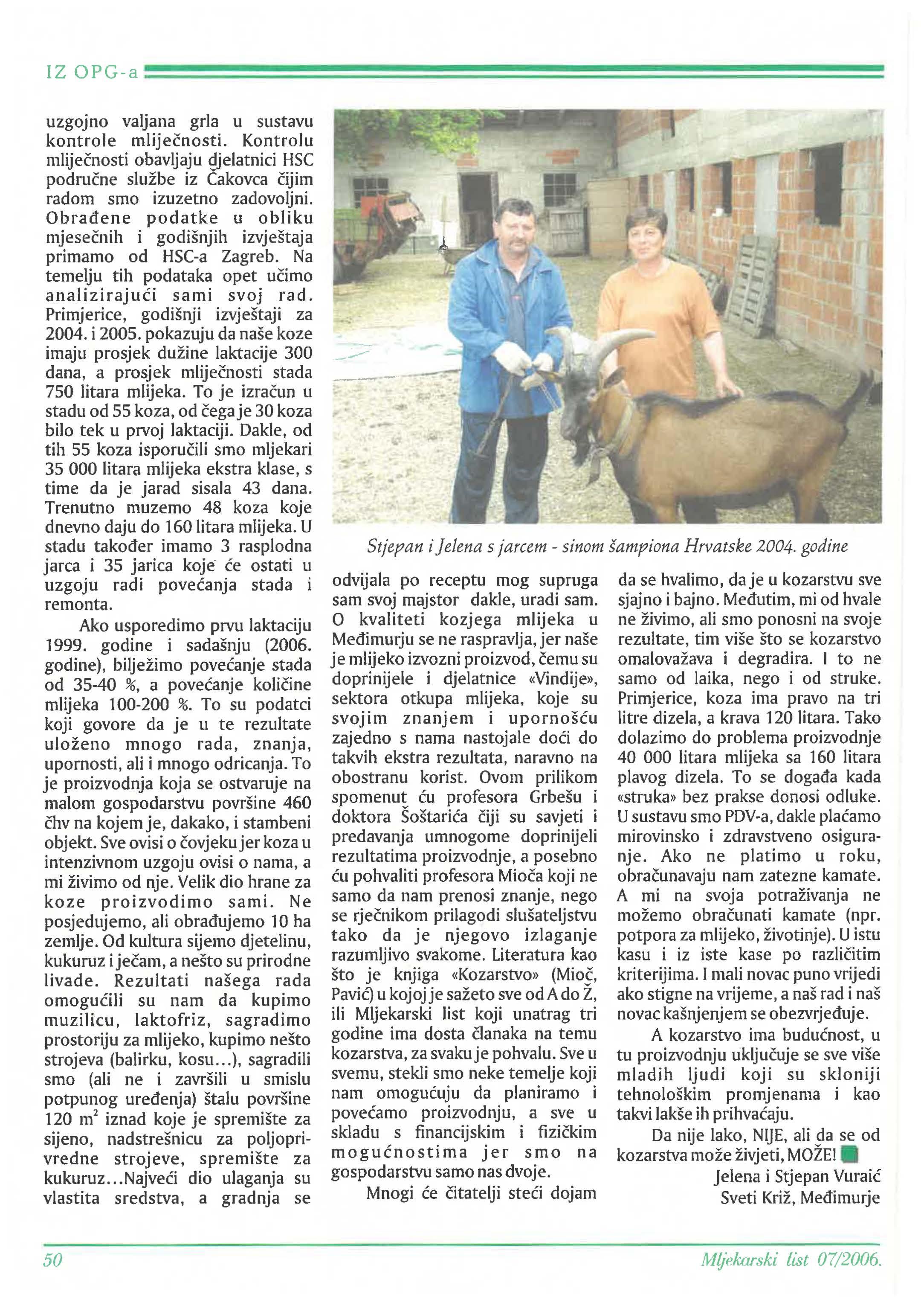 Stjepan i Jelenas jarcem- sinomšampionaHrvatske 2004.godine odvijala po receptu mog supruga sam svoj majstor dakle, uradi sam. O kvaliteti kozjega mlijeka u se ne raspravlja, jer naše je mlijeko izvozni proizvod, su doprinijele i djelatnice «Vindije», sektora otkupa mlijeka, koje su svojim znanjem i zajedno s nama nastojale do takvih ekstra rezultata, naravno na obostranu korist. Ovom prilikom spomenut profesora Grbešu i doktora su savjeti i predavanja umnogome doprinijeli rezultatima proizvodnje, a posebno pohvaliti profesora koji ne samo da nam prenosi znanje, nego se prilagodi slušateljstvu tako da je njegovo izlaganje razumljivo svakome. Literatura kao što je knjiga «Kozarstvo» u kojoj je sažeto sve od A do Ž, ili Mljekarski list koji unatrag tri godine ima dosta na temu kozarstva, za svaku je pohvalu. Sve u svemu, stekli smo neke temelje koji nam da planiramo i proizvodnju, a sve u skladu s financijskim i jer smo na gospodarstvu samo nas dvoje. Mnogi dojam