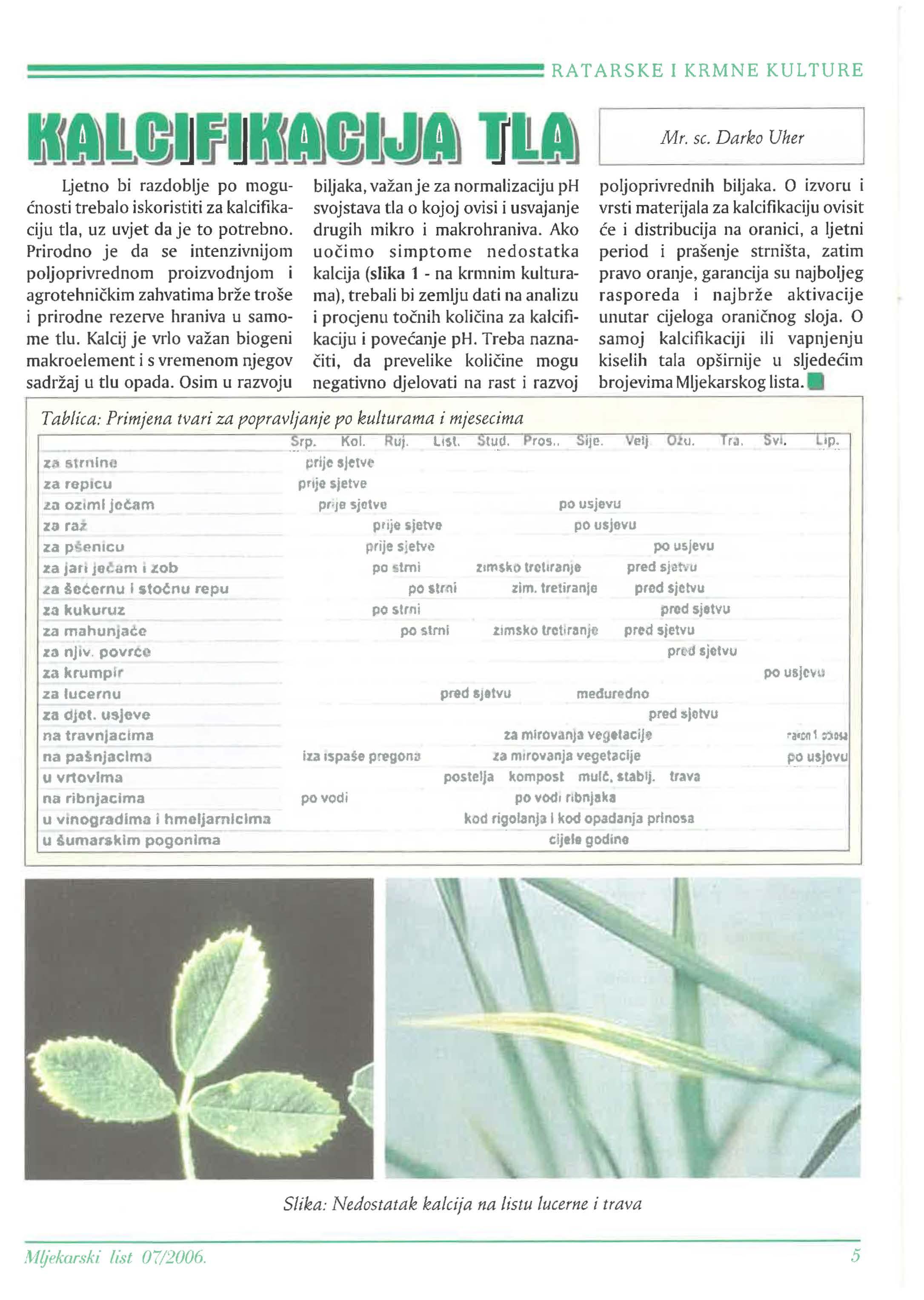 poljoprivrednih biljaka. O izvoru i vrsti materijala za kalcifikaciju ovisit i distribucija na oranici, a ljetni period i prašenje strništa, zatim pravo oranje, garancija su najboljeg rasporeda i najbrže aktivacije unutar cijeloga sloja. O samoj kalcifikaciji ili vapnjenju kiselih tala opširnije u brojevima Mljekarskog