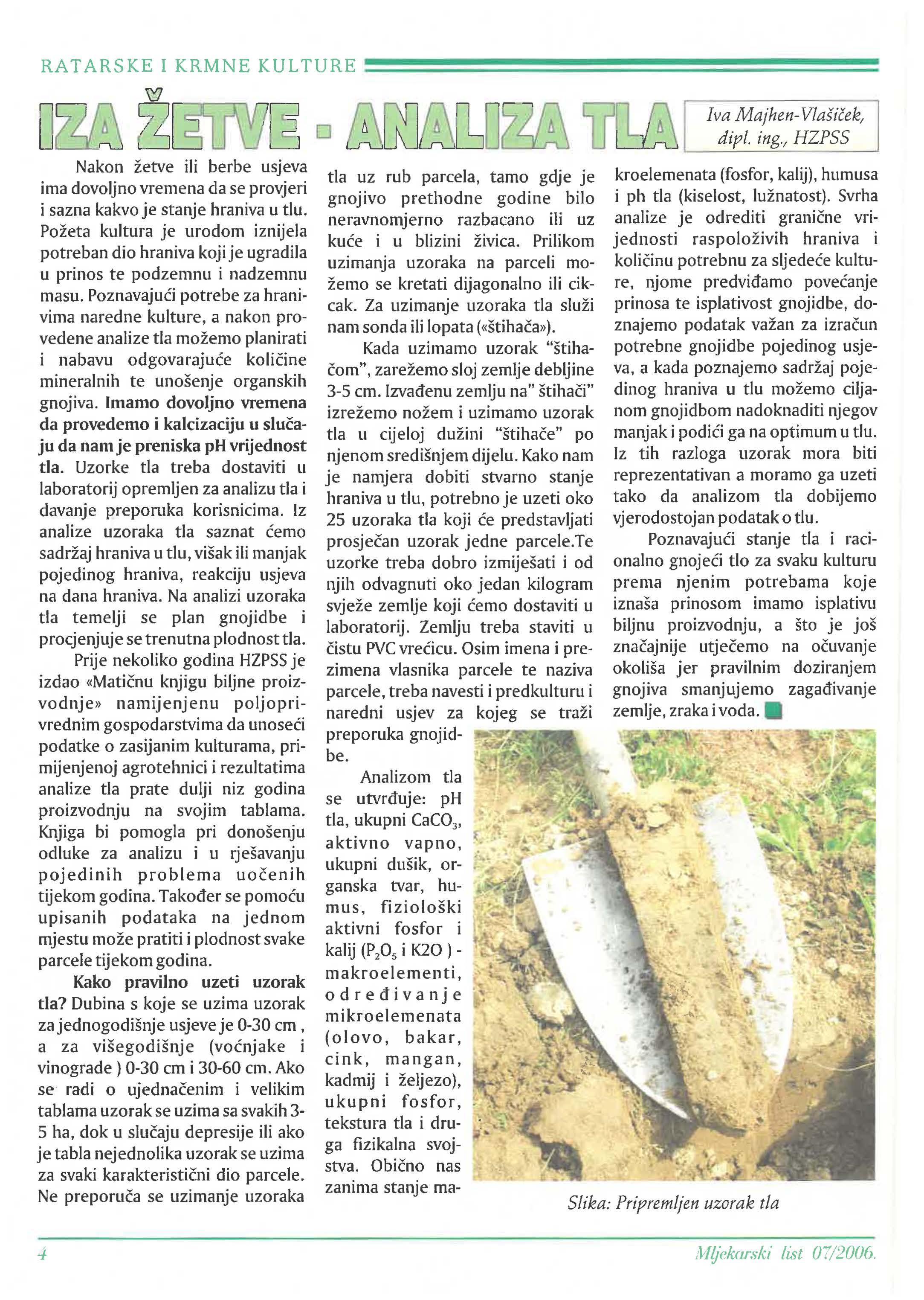 Analizom tla se pH tla, ukupni CaCO3 aktivno vapno, ukupni dušik, organska tvar, humus, fiziološki aktivni fosfor i kalij (P2O5 i K2O)makroelementi, mikroelemenata (olovo, bakar, cink, mangan, kadmij i željezo), ukupni fosfor, tekstura tla i druga fizikalna svojstva. nas parcele tijekom godina. Kako pravilno uzeti uzorak tla? Dubina s koje se uzima uzorak za jednogodišnje usjeve je 0-30 cm, a za višegodišnje i vinograde) 0-30 cm i 30-60 cm. Ako se radi o i velikim tablama uzorak se uzima sa svakih 35 ha, dok u depresije ili ako je tabla nejednolika uzorak se uzima za svaki dio parcele. Ne se uzimanje uzoraka zanima stanje ma-