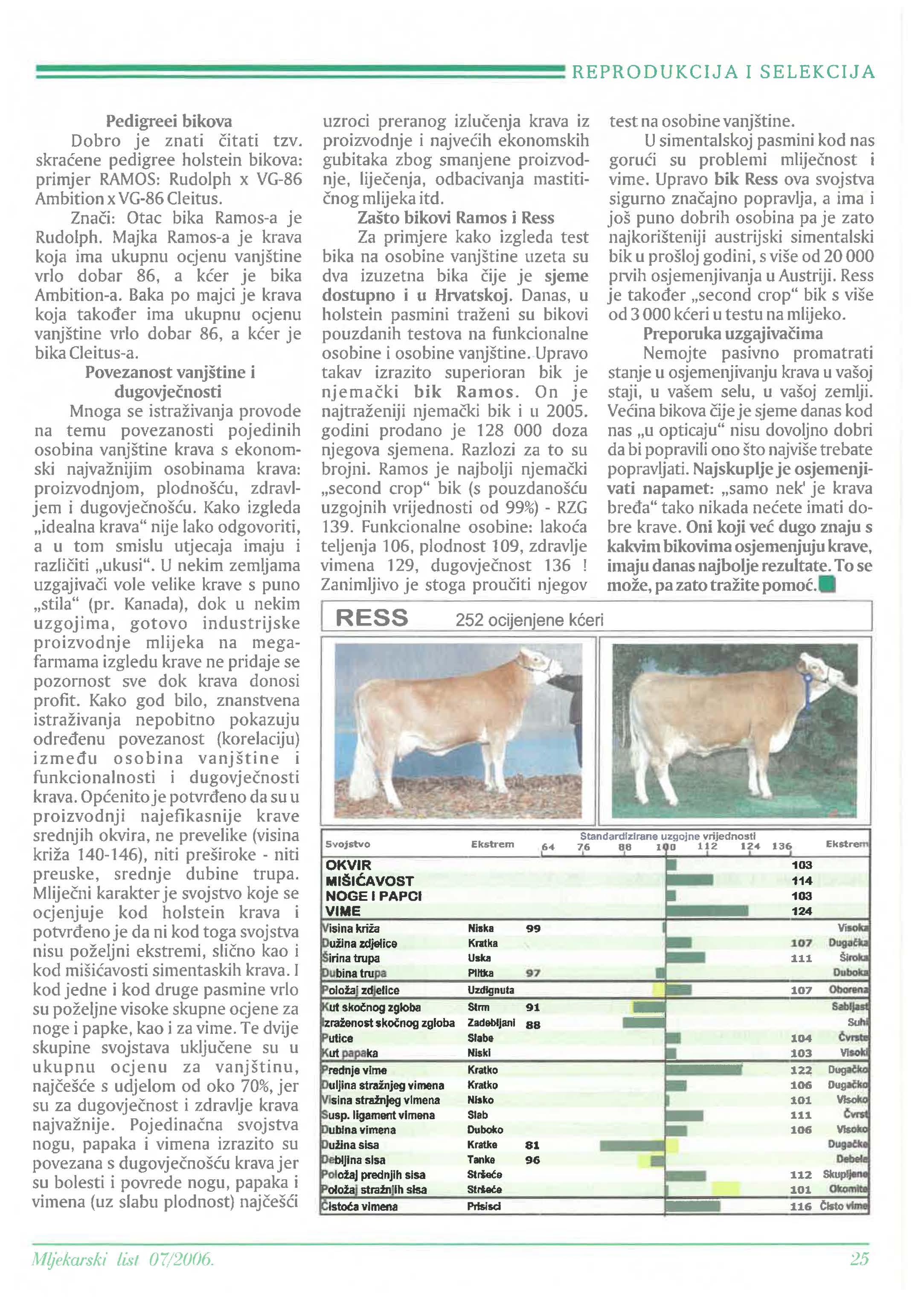 od 1O330 kg mlijeka sa 4,86%m.m. i 3,73% m. Maksimalna joj je laktacija s 13 198 kg mlijeka, 4,87% m.m. i 3,65% m. bje!. Eksterijer joj je izuzetno dobro ocijenjen ocjenama 9-7-9-9 i visina križa 150cm.