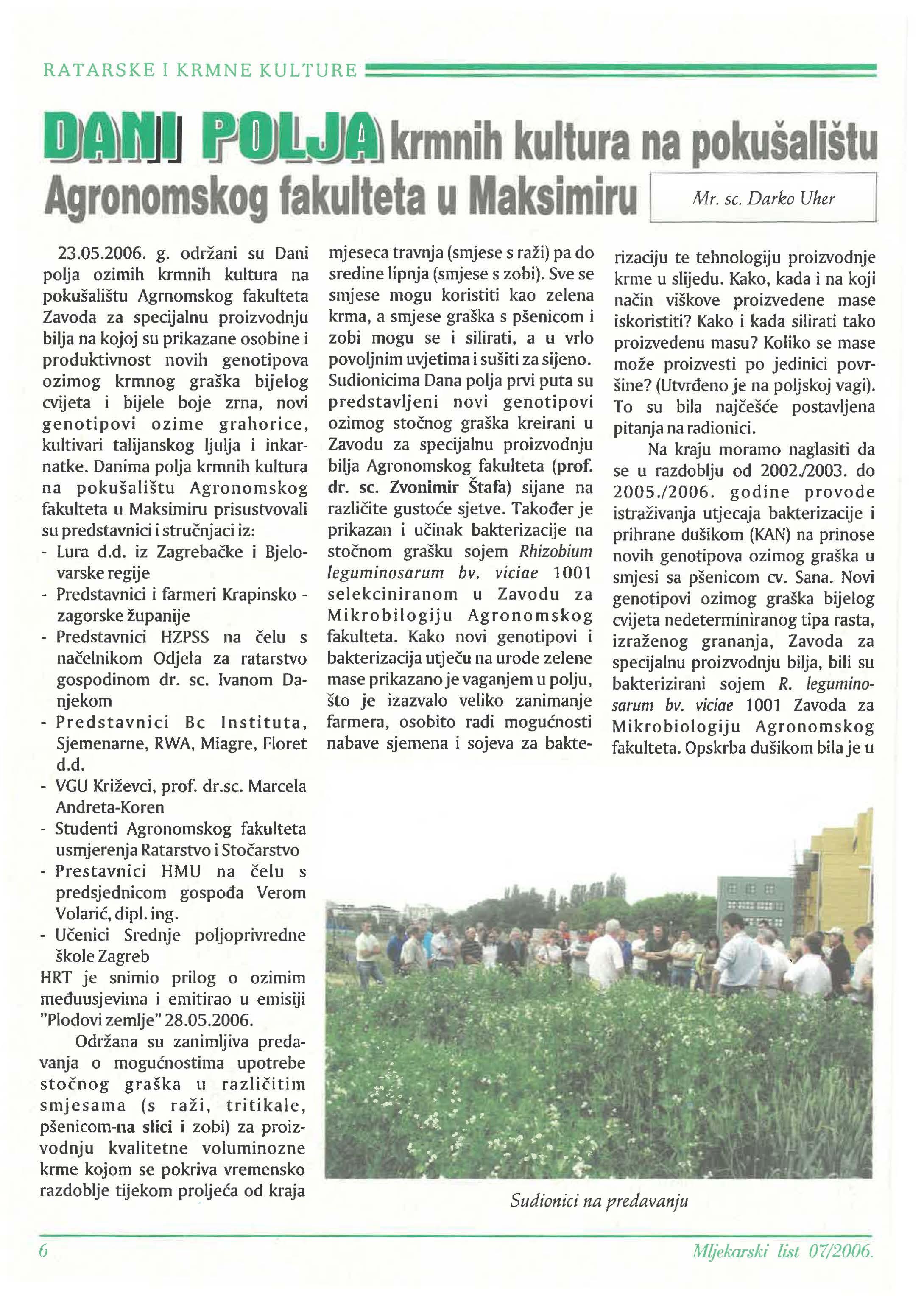 23.05.2006. g. održani su Dani polja ozimih krmnih kultura na pokušalištu Agrnomskog fakulteta Zavoda za specijalnu proizvodnju bilja na kojoj su prikazane osobine i produktivnost novih genotipova ozimog krmnog graška bijelog cvijeta i bijele boje zrna, novi genotipovi ozime grahorice, kultivari talijanskog ljulja i inkarnatke. Danima polja krmnih kultura na pokušalištu Agronomskog fakulteta u Maksimiru prisustvovali su predstavnici i iz: