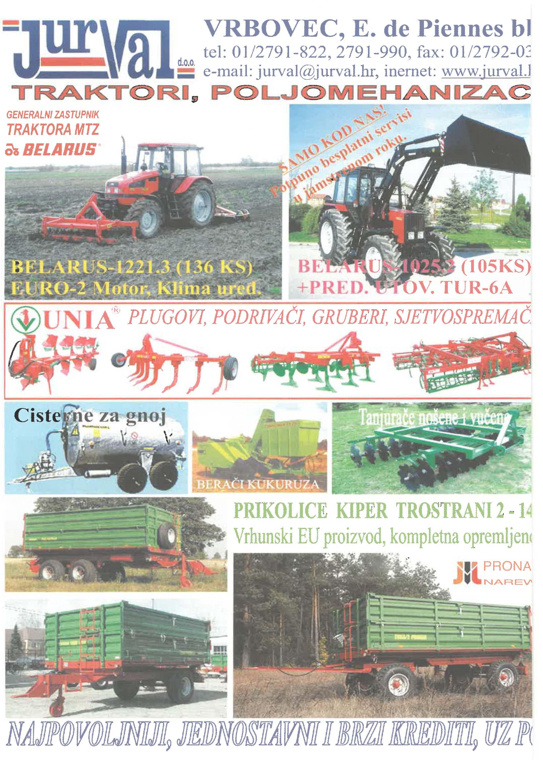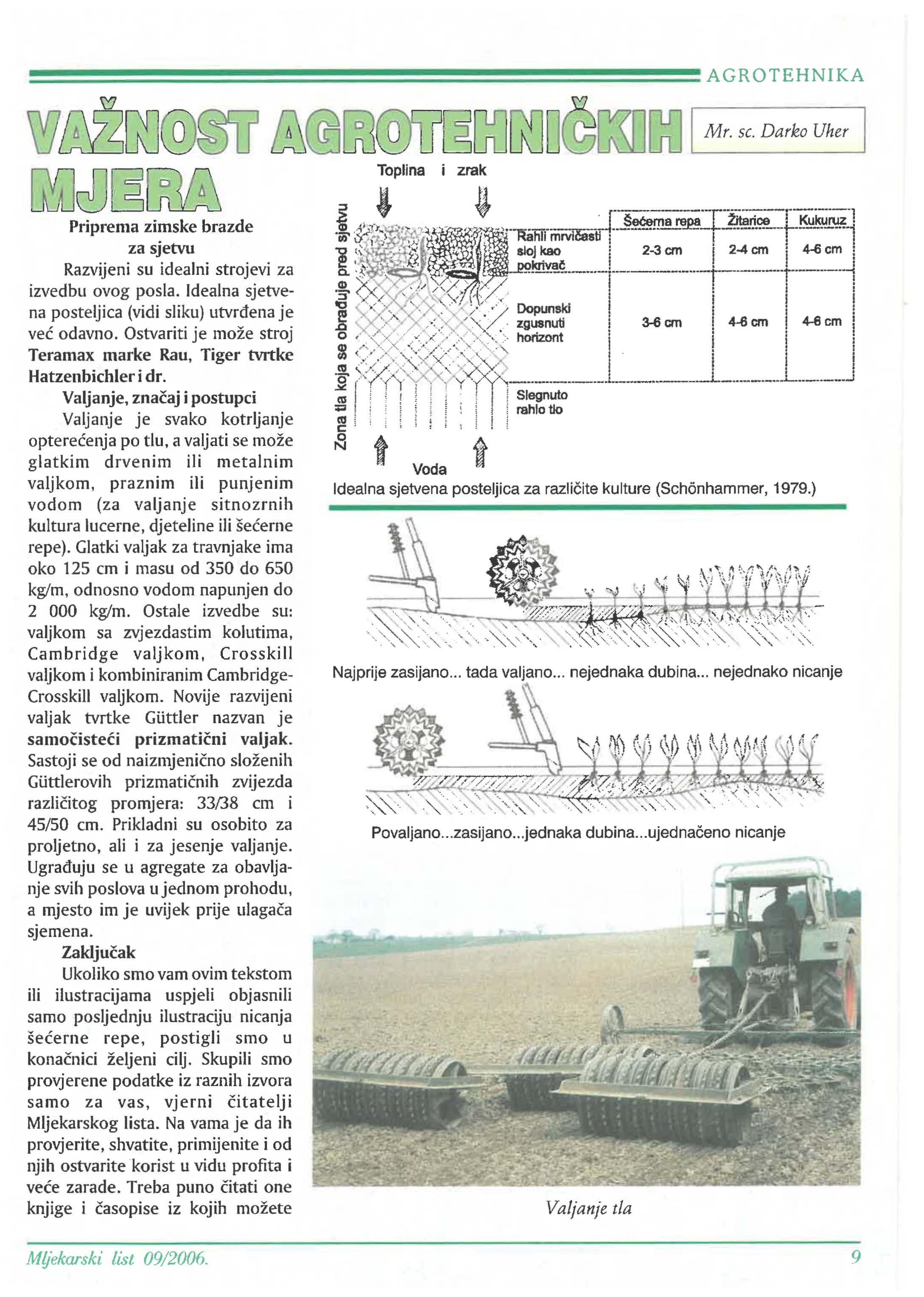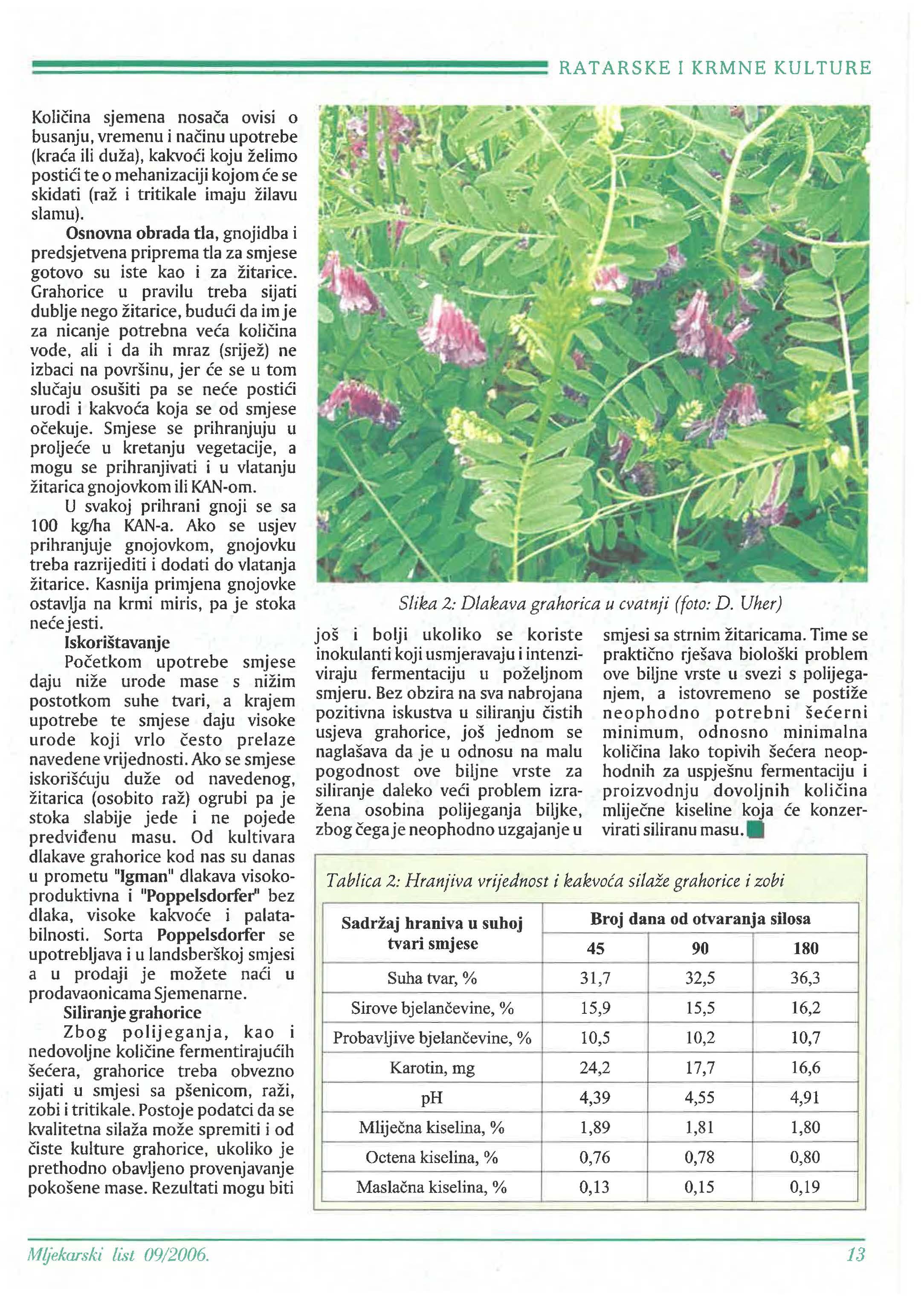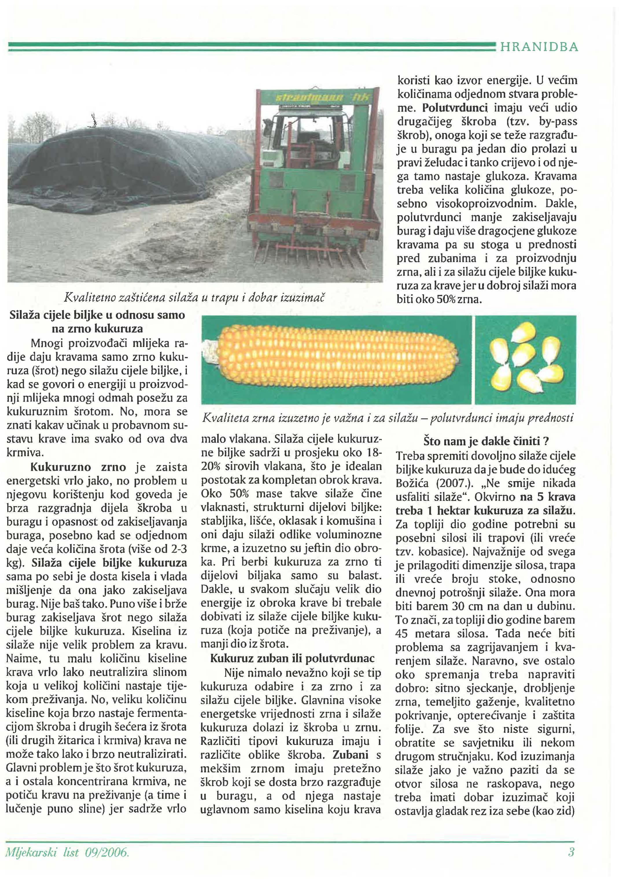 malo vlakana. Silaža cijele kukuruz- Što nam je dakle ? ne biljke sadrži u prosjeku oko 18- Treba spremiti dovoljno silaže cijele 20% sirovih vlakana, što je idealan biljke kukuruza daje bude do postotak za kompletan obrok krava. (2007.). ,,Ne smije nikada Oko 50% mase takve silaže usfaliti silaže". Okvirna na 5 krava vlaknasti, strukturni dijelovi biljke: treba t hektar kukuruza za silažu. stabljika, oklasak i komušina i Za topliji dio godine potrebni su oni daju silaži odlike voluminozne posebni silosi ili trapovi (ili krme, a izuzetno su jeftin dio obro- tzv. kobasice). Najvažnije od svega ka. Pri berbi kukuruza za zrno ti je prilagoditi dimenzije silosa, trapa dijelovi biljaka samo su balast. ili broju stoke, odnosno Dakle, u svakom velik dio dnevnoj potrošnji silaže. Ona mora energije iz obroka krave bi trebale biti barem 30 cm na dan u dubinu. dobivati iz silaže cijele biljke kuku- To za topliji dio godine barem ruza (koja na preživanje), a 45 metara silosa. Tada biti manji dio iz šrota. problema sa zagrijavanjem i kvaKukuruzzuban ili polutvrdunac renjem silaže. Naravno, sve ostalo Nije nimalo nevažno koji se tip oko spremanja treba napraviti kukuruza odabire i za zrno i za dobro: sitno sjeckanje, drobljenje silažu cijele biljke. Glavnina visoke zrna, temeljito gaženje, kvalitetno energetske vrijednosti zrna i silaže pokrivanje, i zaštita kukuruza dolazi iz škroba u zrnu. folije. Za sve što niste sigurni, tipovi kukuruza imaju i obratite se savjetniku ili nekom oblike škroba. Zubani s drugom Kod izuzimanja mekšim zrnom imaju pretežno silaže jako je važno paziti da se škrob koji se dosta brzo otvor silosa ne raskopava, nego u buragu, a od njega nastaje treba imati dobar koji uglavnom samo kiselina koju krava ostavlja gladak rez iza sebe (kao zid)
