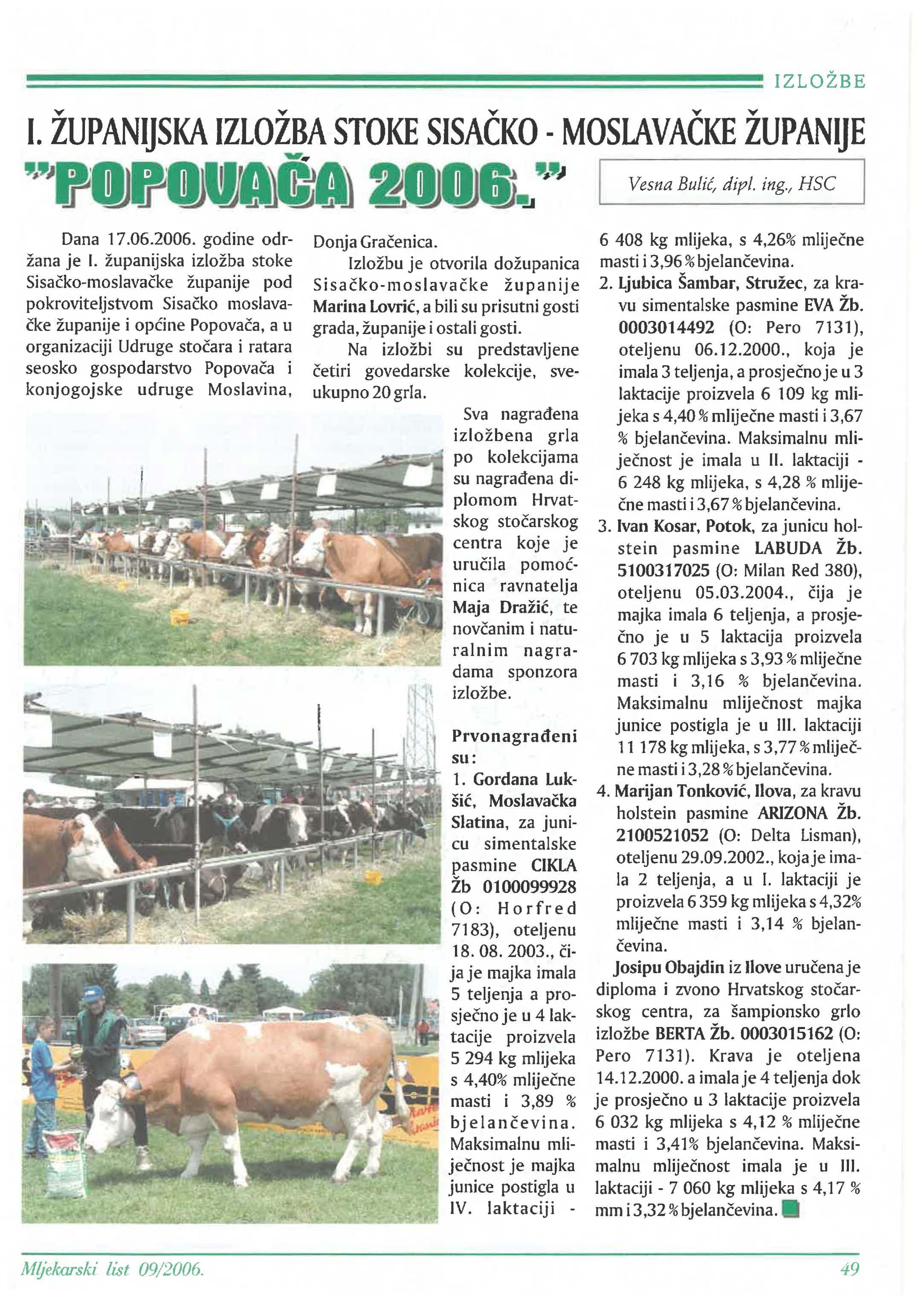 Josipu Obajdiniz Ilove diploma i zvono Hrvatskog skog centra, za šampionsko grlo izložbe BERTAŽb. 0003015162 {O: Pero 7131). Krava je oteljena 14.12.2000. a imala je 4 teljenja dok je u 3 laktacije proizvela 6 032 kg mlijeka s 4, 12 % masti i 3,41% Maksimalnu imala je u III. laktaciji - 7 060 kg mlijeka s 4, 17 % mm i 3,32 %