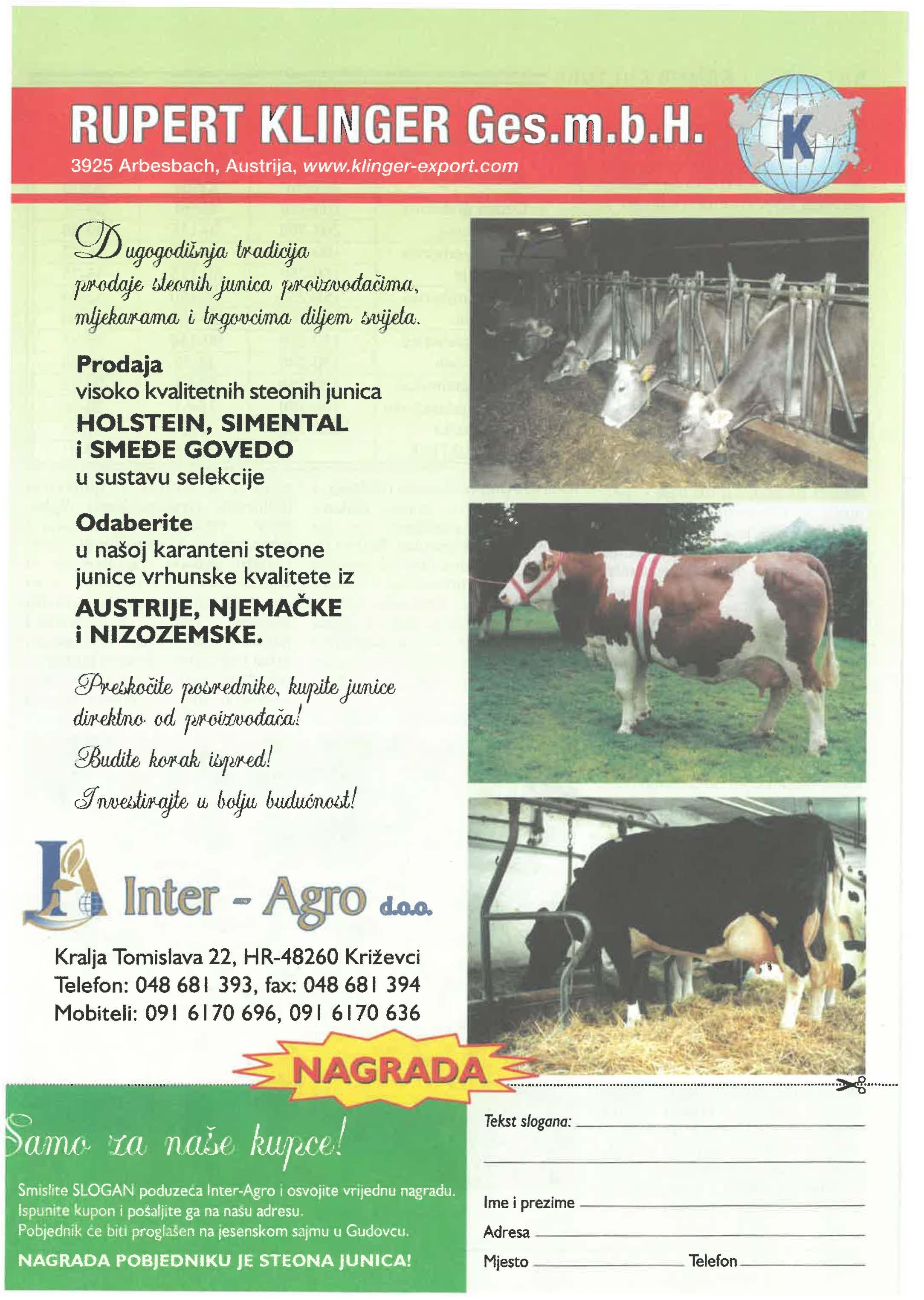 3. Vladimir Cargovec, za bikovsku majku simentalske pasmine ŠEKA Žb. 0005007659 (O: Horny 7141), oteljenu 16.12.1998., koja je imala 6 teljenja a je u 5 laktacija proizvela 5 966 kg mlijeka s4, 14% masti i 3,40 % bjelan-