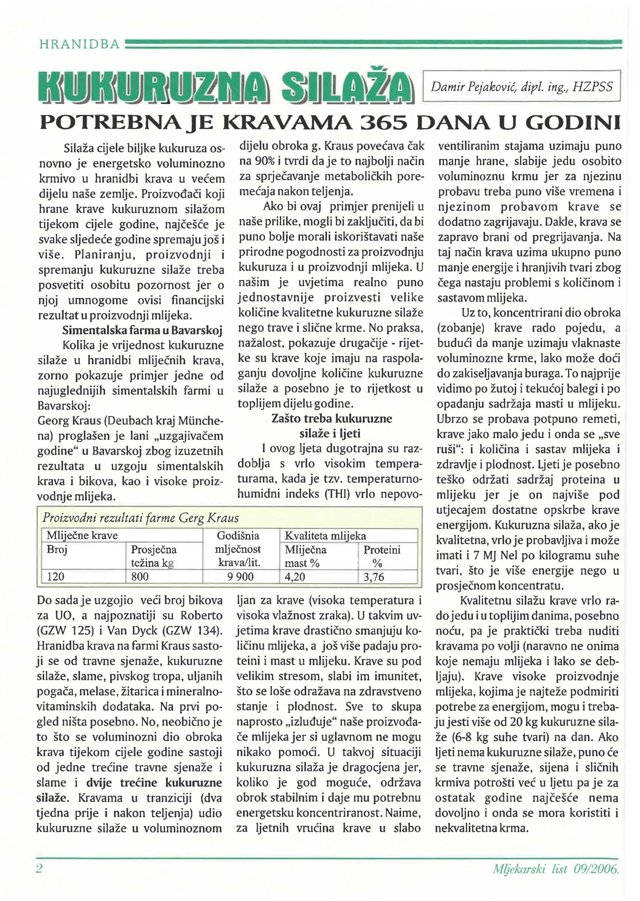 Silaža cijele biljke kukuruza osnovno je energetsko voluminozno krmivo u hranidbi krava u dijelu naše zemlje. koji hrane krave kukuruznom silažom tijekom cijele godine, je svake godine spremaju još i više. Planiranju, proizvodnji i spremanju kukuruzne silaže treba posvetiti osobitu pozornost jer o njoj umnogome ovisi financijski rezultat u proizvodnji mlijeka.