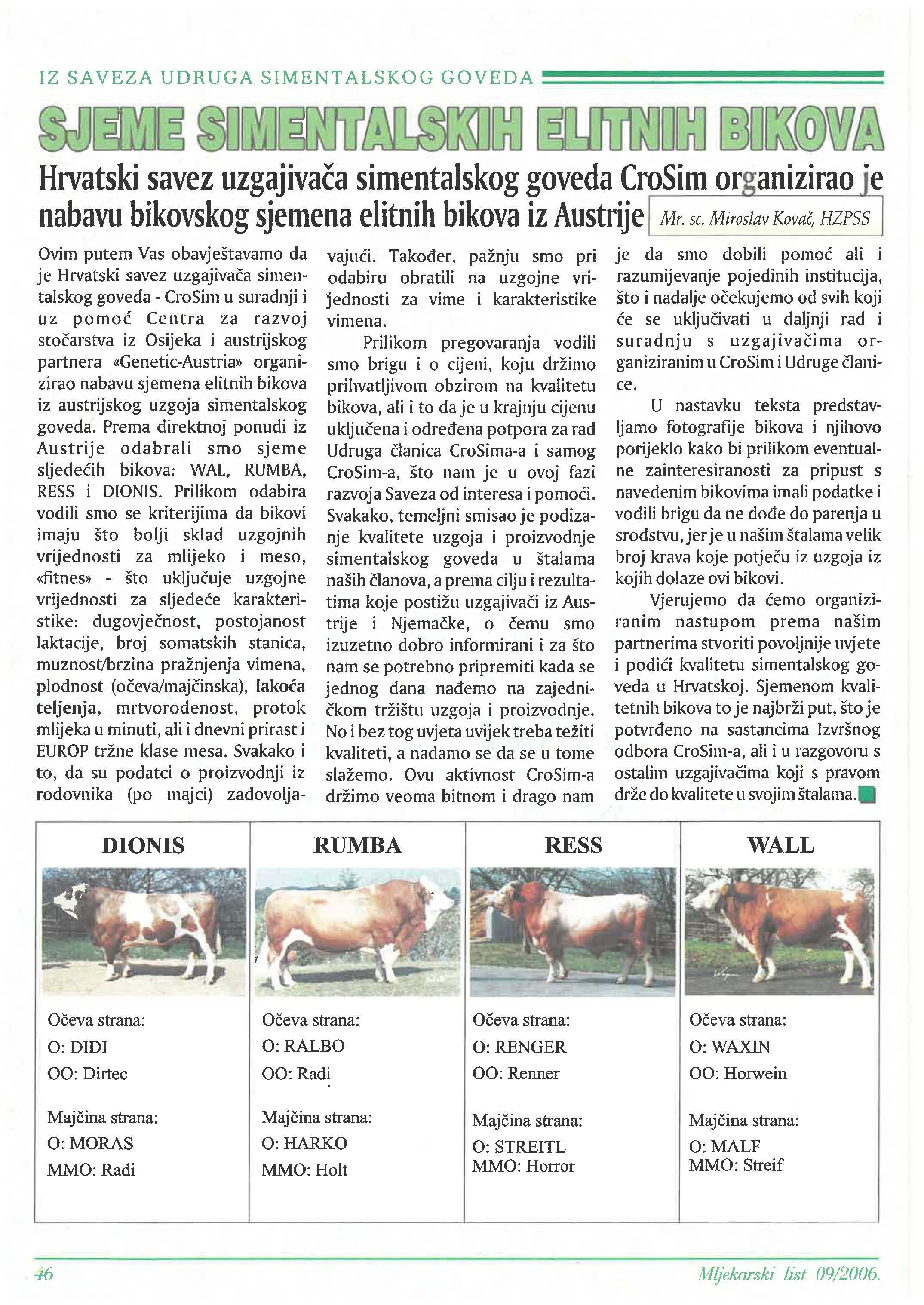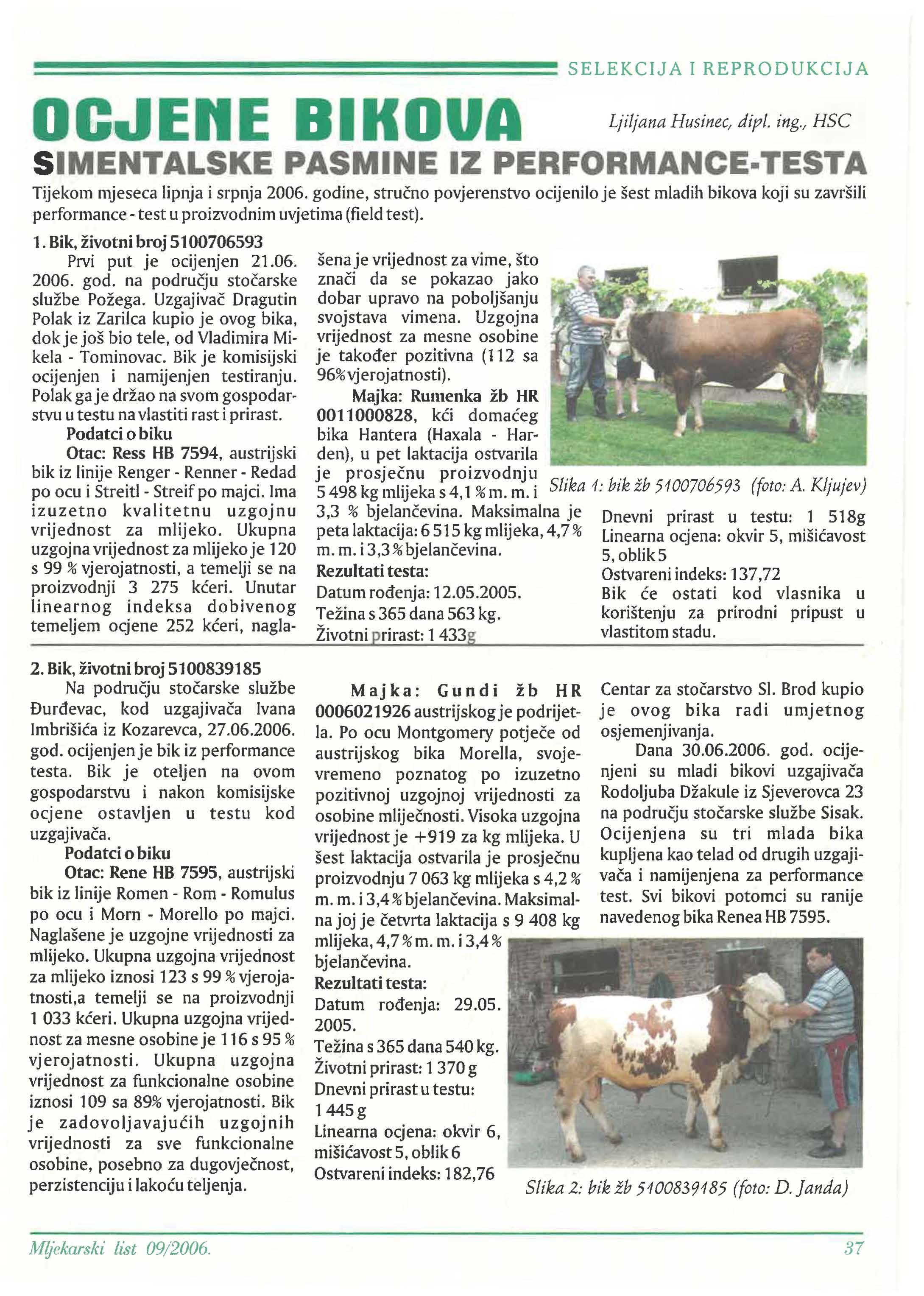 1 Dragutin Hum, za junicu simentalske pasmine DUNJA Žb. 1100348737 (O: Sak 7380), oteljenu 16.09.2004., je majka imala 2 teljenja, a u I. laktaciji je proizvela 5 011 kg mlijeka, s 3,29 % masti i 3, 13 %