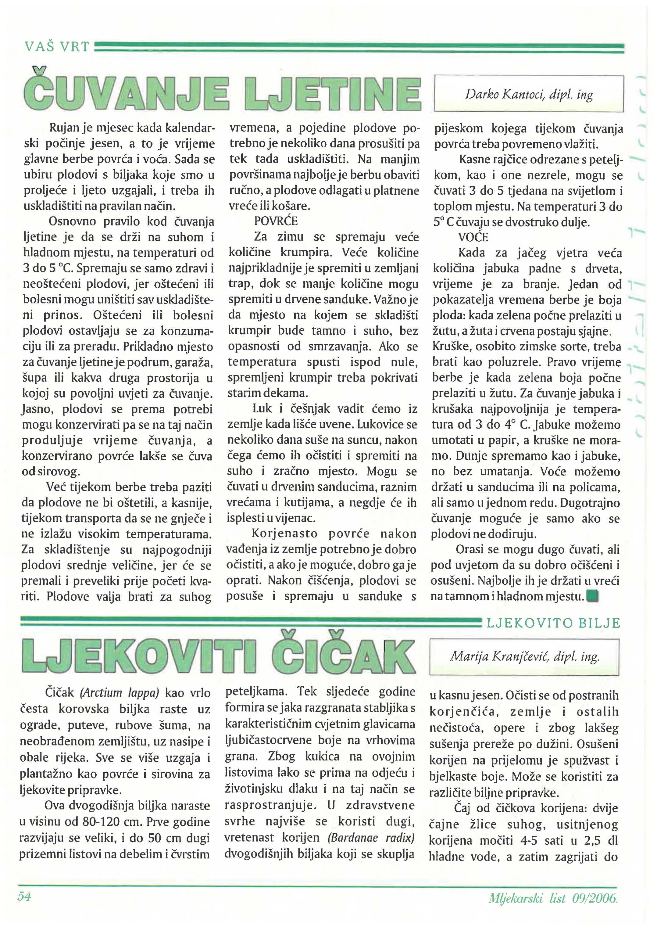 Rujan je mjesec kada kalendarski jesen, a to je vrijeme glavne berbe i Sada se ubiru plodovi s biljaka koje smo u i ljeto uzgajali, i treba ih uskladištiti na pravilan Osnovno pravilo kod ljetine je da se drži na suhom i hladnom mjestu, na temperaturi od 3 do 5 °C. Spremaju se samo zdravi i plodovi, jer ili bolesni mogu uništiti sav uskladišteni prinos. ili bolesni plodovi ostavljaju se za konzumaciju ili za preradu. Prikladno mjesto za ljetine je podrum, garaža, šupa ili kakva druga prostorija u kojoj su povoljni uvjeti za Jasno, plodovi se prema potrebi mogu konzervirati pa se na taj produljuje vrijeme a konzervirana lakše se od sirovog.