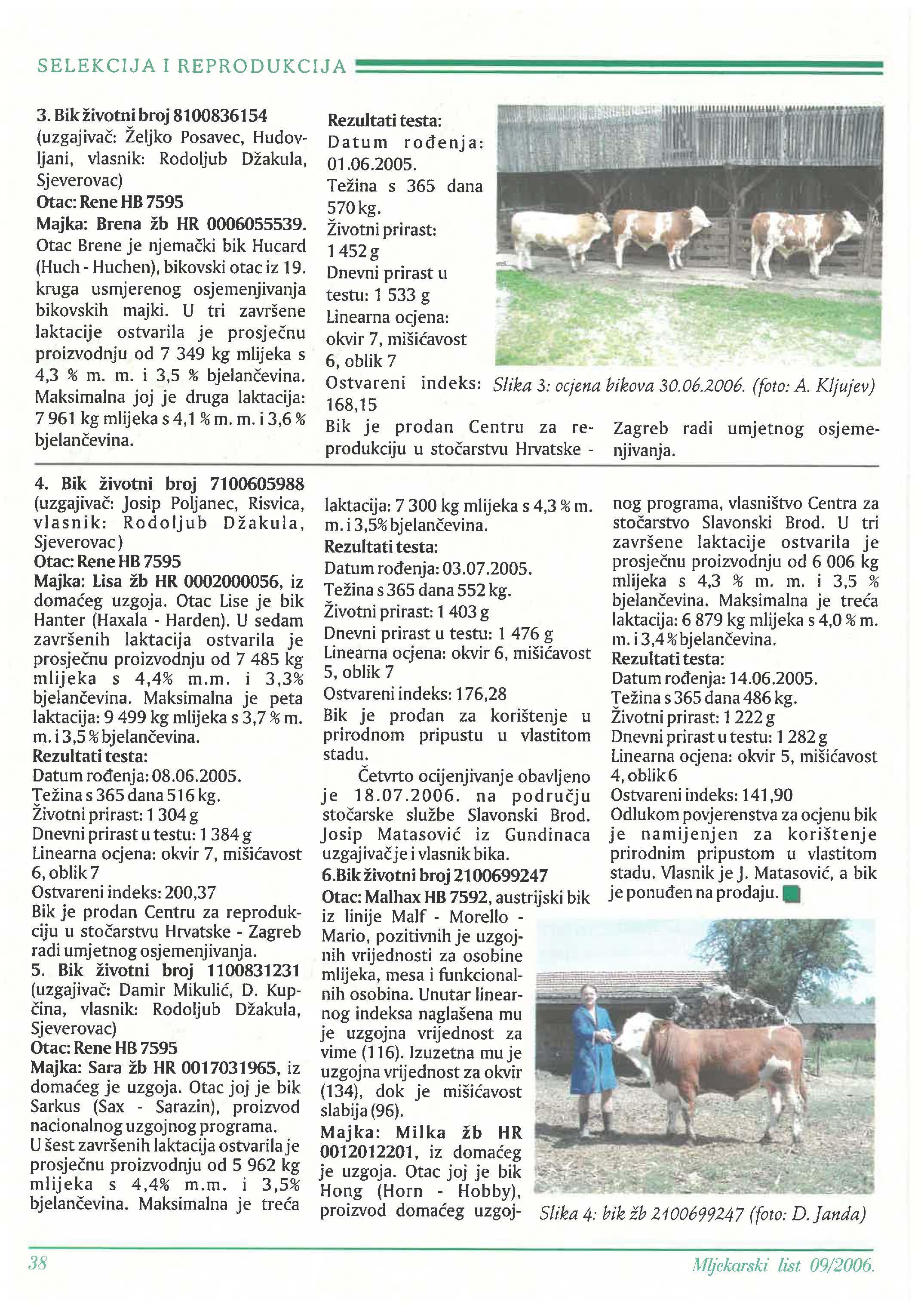 3. lvan Kosar,Potok, za junicu holstein pasmine LABUDA Žb. 5100317025 {O: Milan Red 380), oteljenu 05.03.2004., je majka imala 6 teljenja, a prosjeje u 5 laktacija proizvela 6 703 kg mlijeka s 3,93 % masti i 3, 16 % Maksimalnu majka junice postigla je u Ili. laktaciji 11 178 kg mlijeka, s 3,77 % ne masti i 3,28 %
