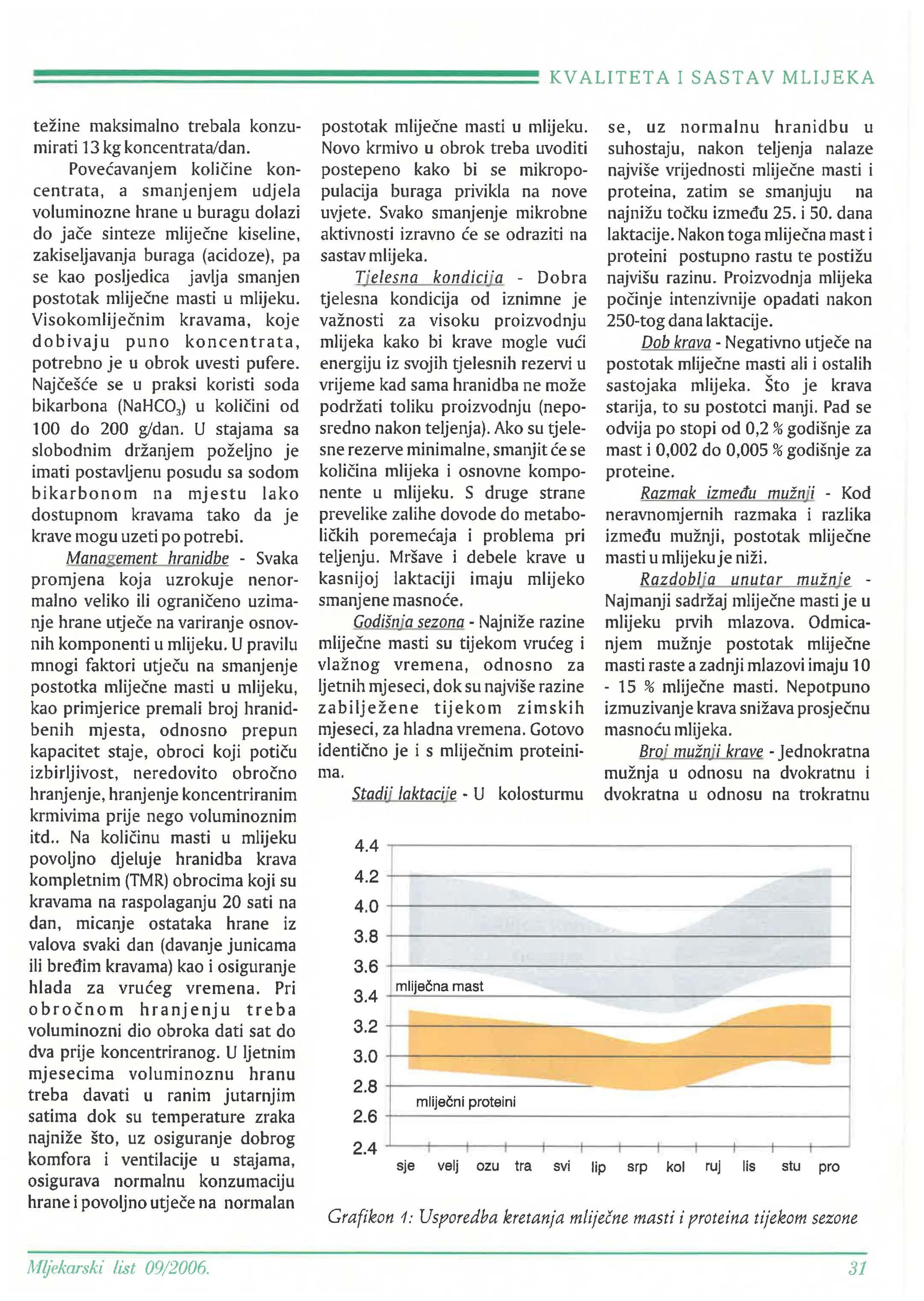 Uz to, koncentrirani dio obroka (zobanje) krave rado pojedu, a da manje uzimaju vlaknaste voluminozne krme, lako može do zakiseljavanja buraga. To najprije vidimo po žutoj i balegi i po opadanju sadržaja masti u mlijeku. Ubrzo se probava potpuno remeti, krave jako malo jedu i onda se „sve ruši": i i sastav mlijeka i zdravlje i plodnost. Ljeti je posebno teško održati sadržaj proteina u mlijeku jer je on najviše pod utjecajem dostatne opskrbe krave energijom. Kukuruzna silaža, ako je kvalitetna, vrlo je probavljiva i može imati i 7 MJ Nel po kilogramu suhe tvari, što je više energije nego u koncentratu.