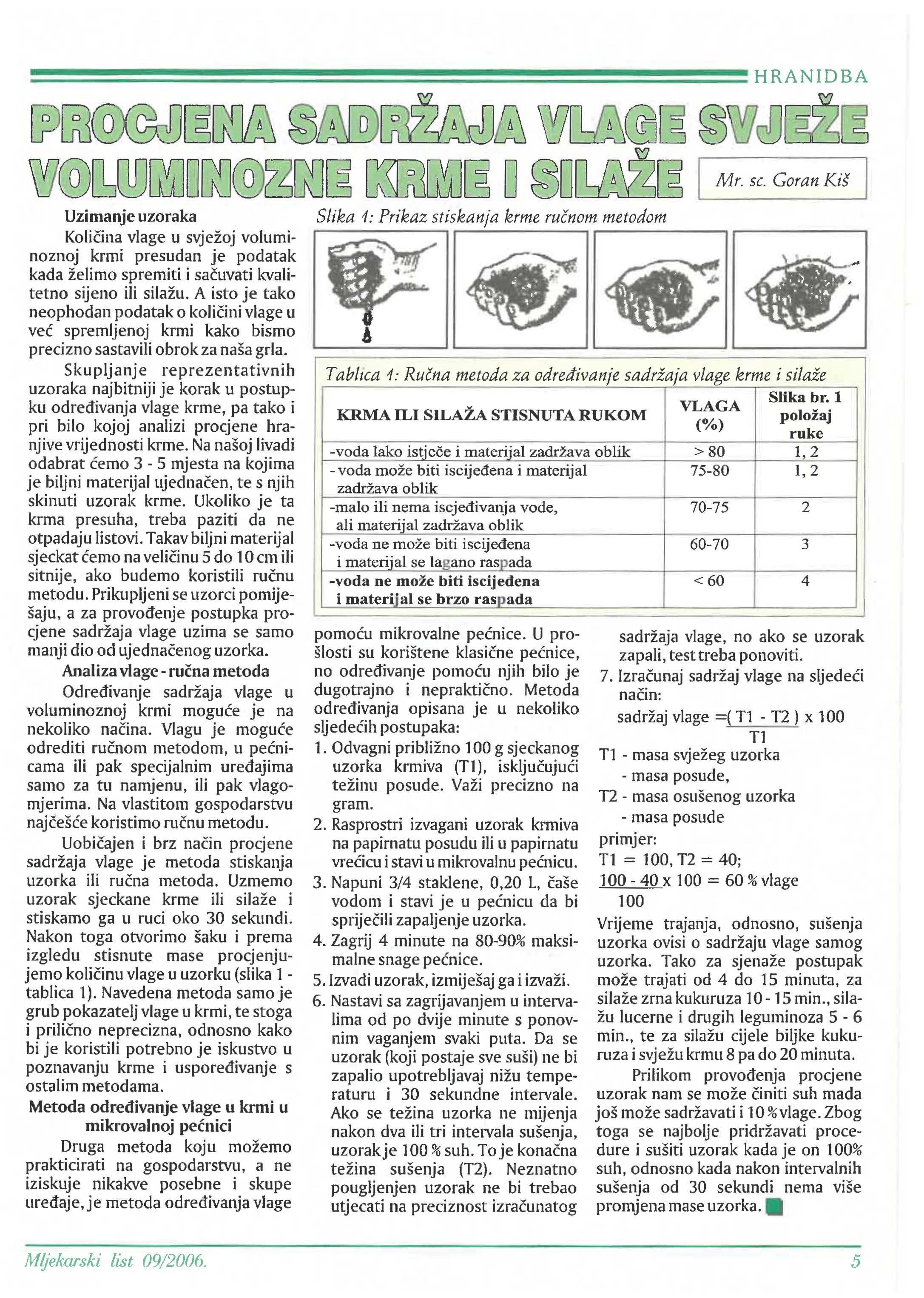 Analizavlage - metoda sadržaja vlage u voluminoznoj krmi je na nekoliko Vlagu je odrediti metodom, u cama ili pak specijalnim samo za tu namjenu, ili pak vlagomjerima. Na vlastitom gospodarstvu koristimo metodu. i brz procjene sadržaja vlage je metoda stiskanja uzorka ili metoda. Uzmemo uzorak sjeckane krme ili silaže i stiskama ga u ruci oko 30 sekundi. Nakon toga otvorimo šaku i prema izgledu stisnute mase procjenjujemo vlage u uzorku (slika 1tablica 1). Navedena metoda samo je grub pokazatelj vlage u krmi, te stoga i neprecizna, odnosno kako bi je koristili potrebno je iskustvo u poznavanju krme i s ostalim metodama. Metoda vlage u krmi u mikrovalnoj