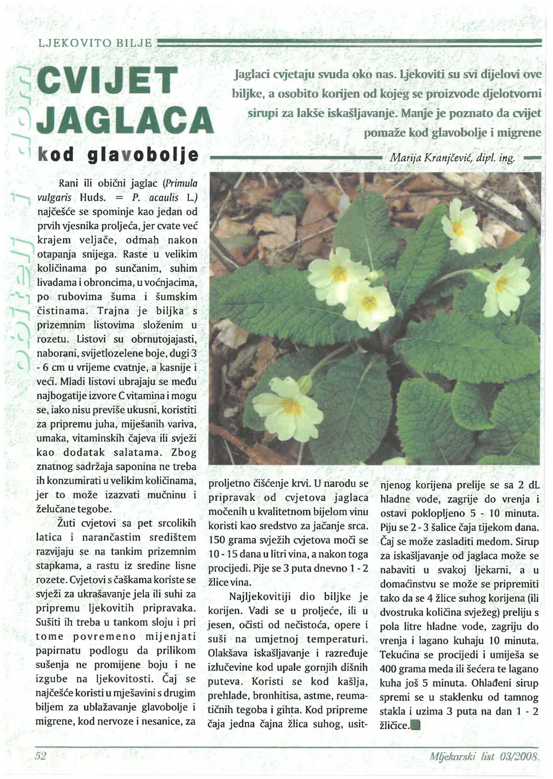 proljetno krvi. U narodu se pripravak od cvjetova jaglaca u kvalitetnom bijelom vinu koristi kao sredstvo za srca.