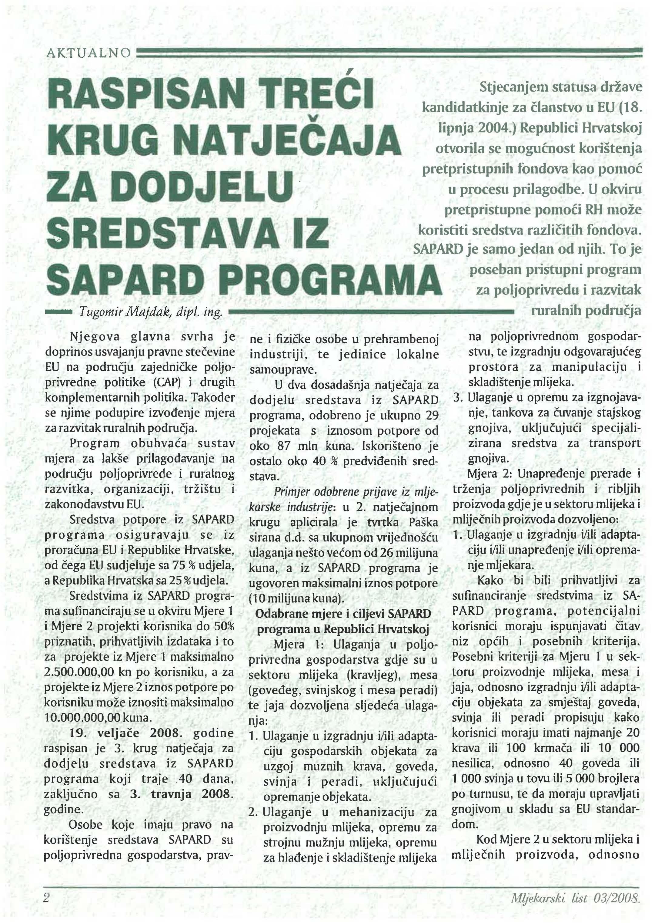 19. 2008. godine raspisan je 3. krug za dodjelu sredstava iz SAPARD programa koji traje 40 dana, sa 3. travnja 2008. godine.
